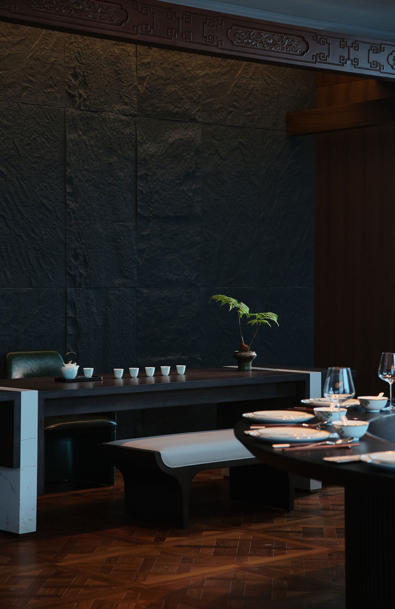 包间四墙面采用艺术漆处理,呈现出触感细腻的纹理。天花板低位光照明营造出幽静的氛围,使整个空间如同被自然光线温柔包裹,带给客人一种心灵的放松与愉悦。整体布局错落有致,既有传统的古韵,又不失现代的简约,让过去与未来,自然与现代,记忆与情感,在此得到融合。