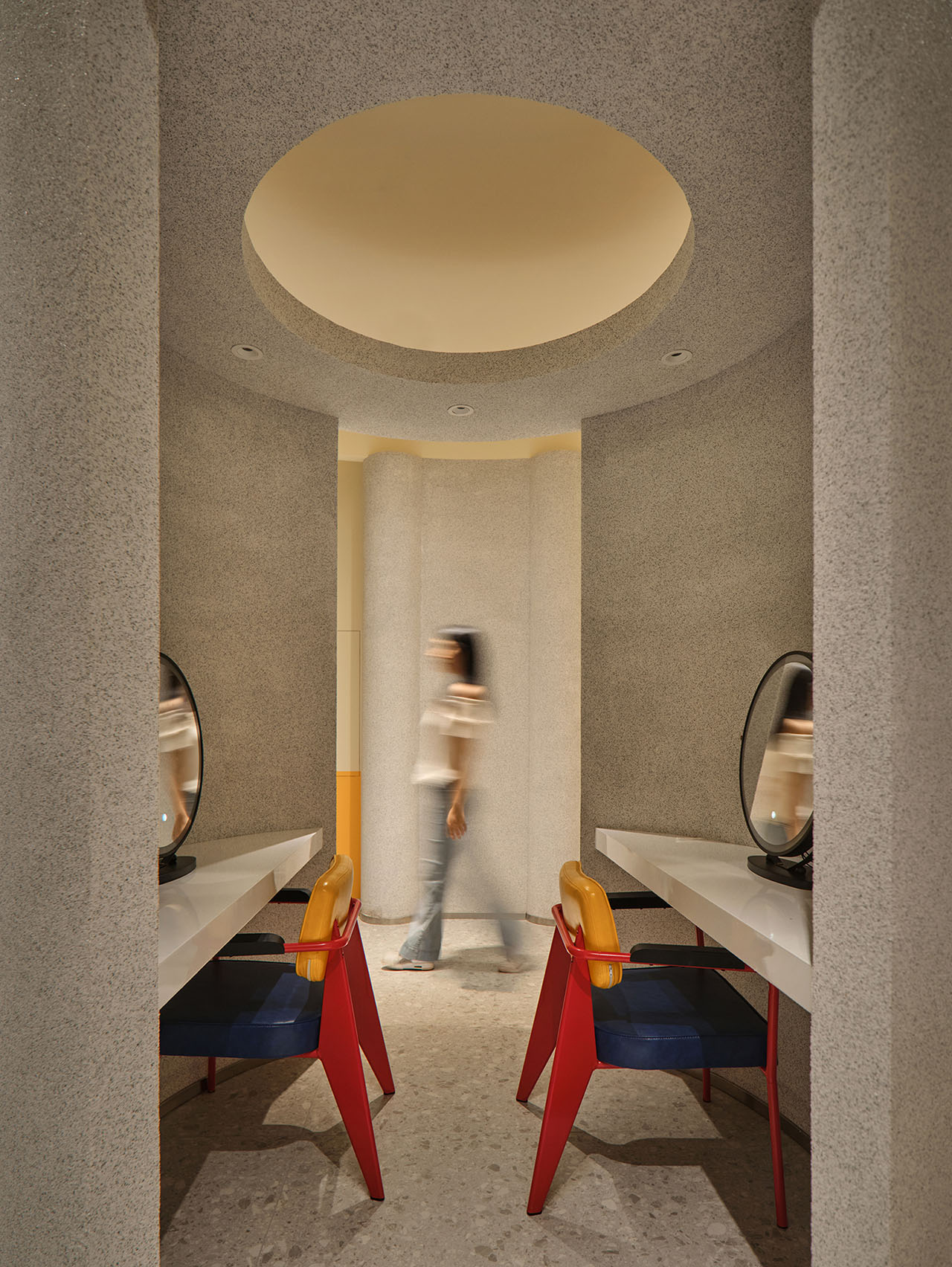打破传统走廊的单调,我们在消防门处设置圆形中转区,融合化妆区与通道功能,让每一次转身都充满仪式感。