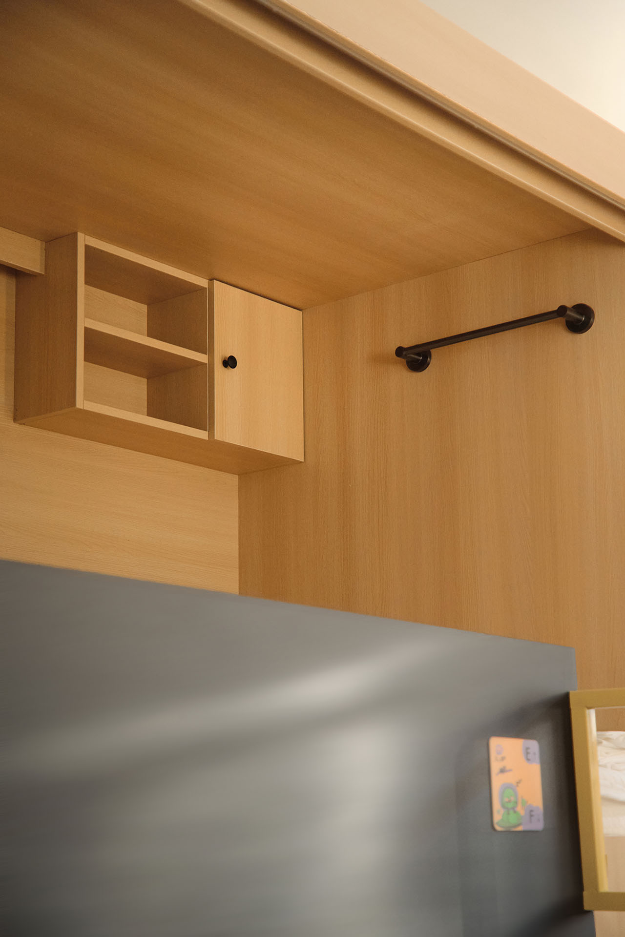 房间内部在有限空间中我们将床位设置为1.2m宽,最大化强调舒适感。墙面柜体我们做统一标识系统与柔软地胶的运用,我们希望空间整体感更强,也更安静、更柔软。