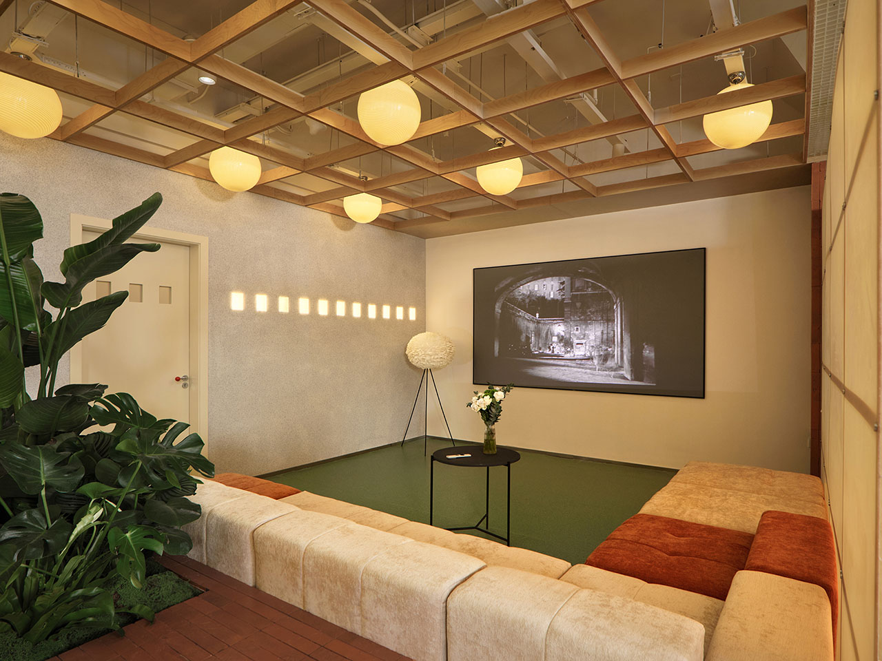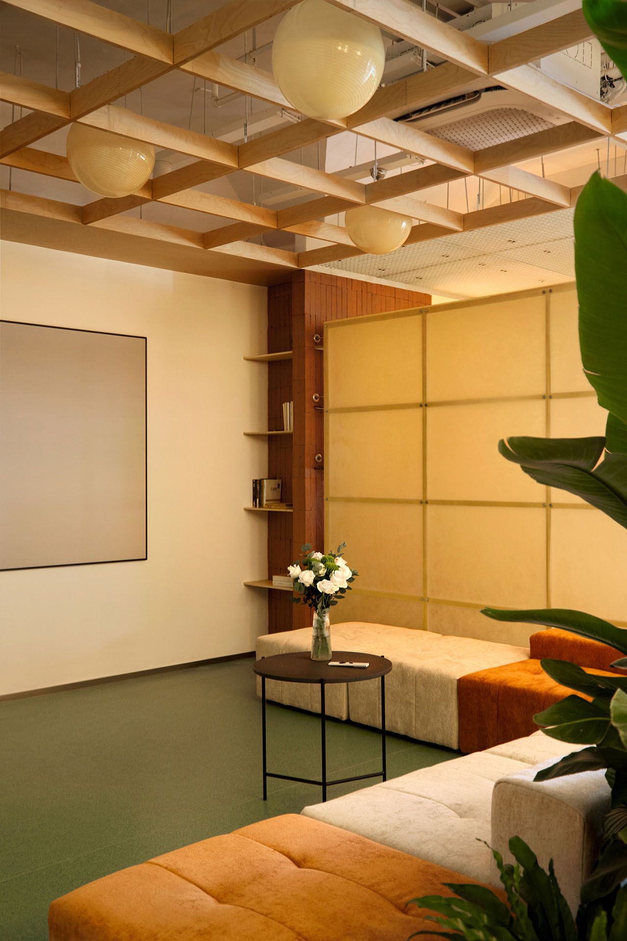 几株绿植、几踏小红砖,隔开了过廊与观影区,同时也兼具休闲读书角,我们试图将街角公园搬进室内。