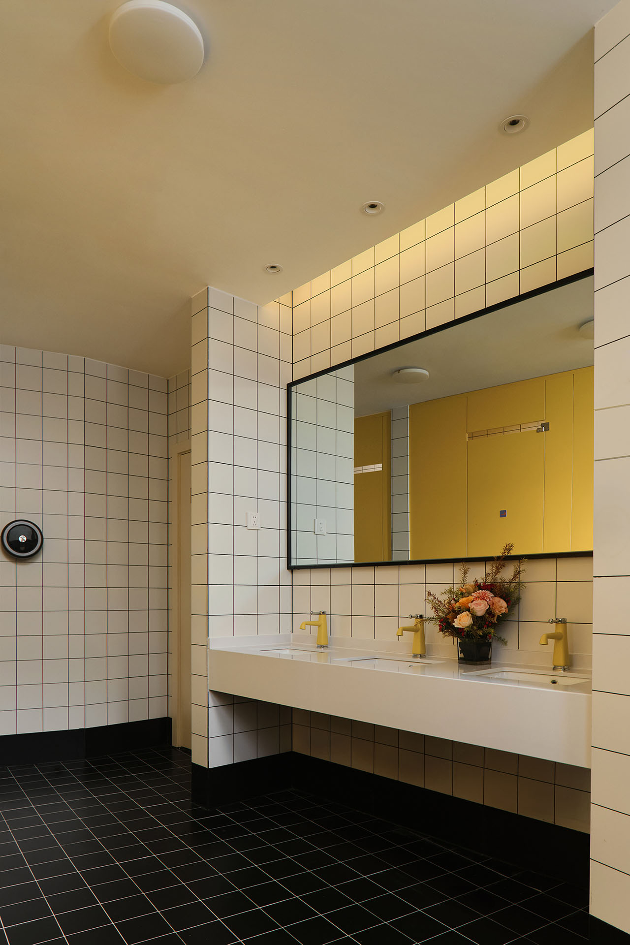 墙面与地面铺陈开黑白格小砖,构成永不过时的经典底色,用一扇明黄色的门,作为空间点缀色彩,去打破了这份规整。