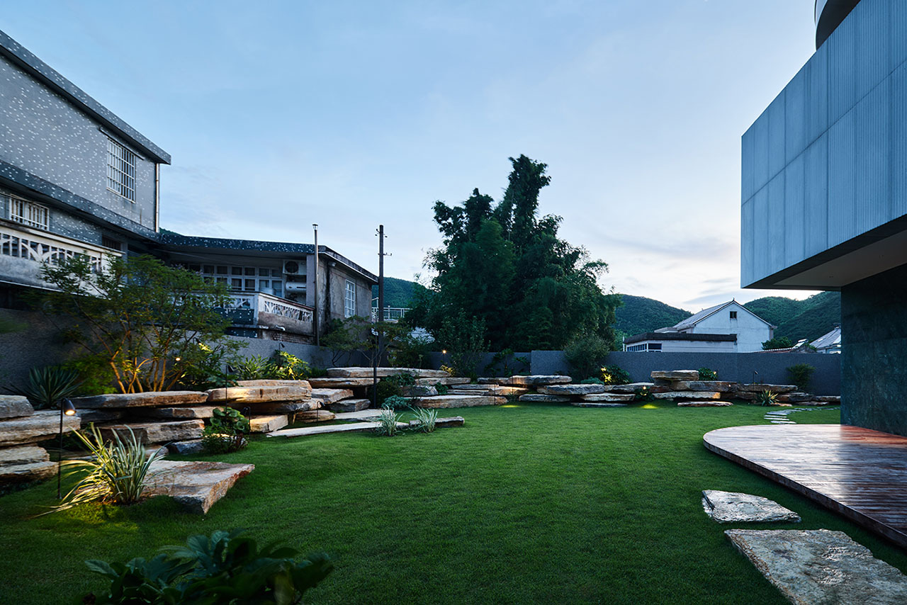 在材料的选择中为了去融入村中的氛围,我们选择了三种色调的石材,灰色、暖白色、绿色,对应的是村中常见的屋顶、土墙、植物。在处理上,主要的灰色细点麻石,我们开了波浪槽口,让它在日光中是可以变化的,暖白色的莱姆石则做了自然喷砂面,让它在晴雨中是可以变化的,绿色大理石则显得稳定做了柔光处理,显得稳定。院墙我们也采用了两种不同材料。沿路的院墙是灰色线条纤维板,稳定不会变色。而内侧的院墙则是灰色水洗石,配合着植物景观,会随着时间变斑驳。