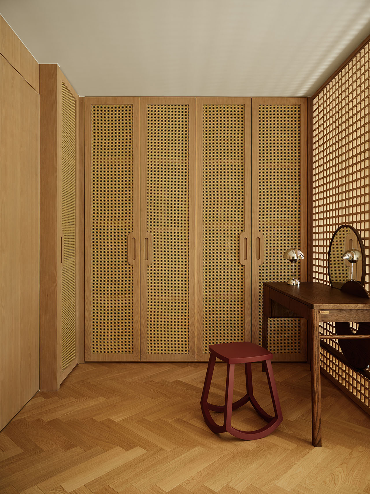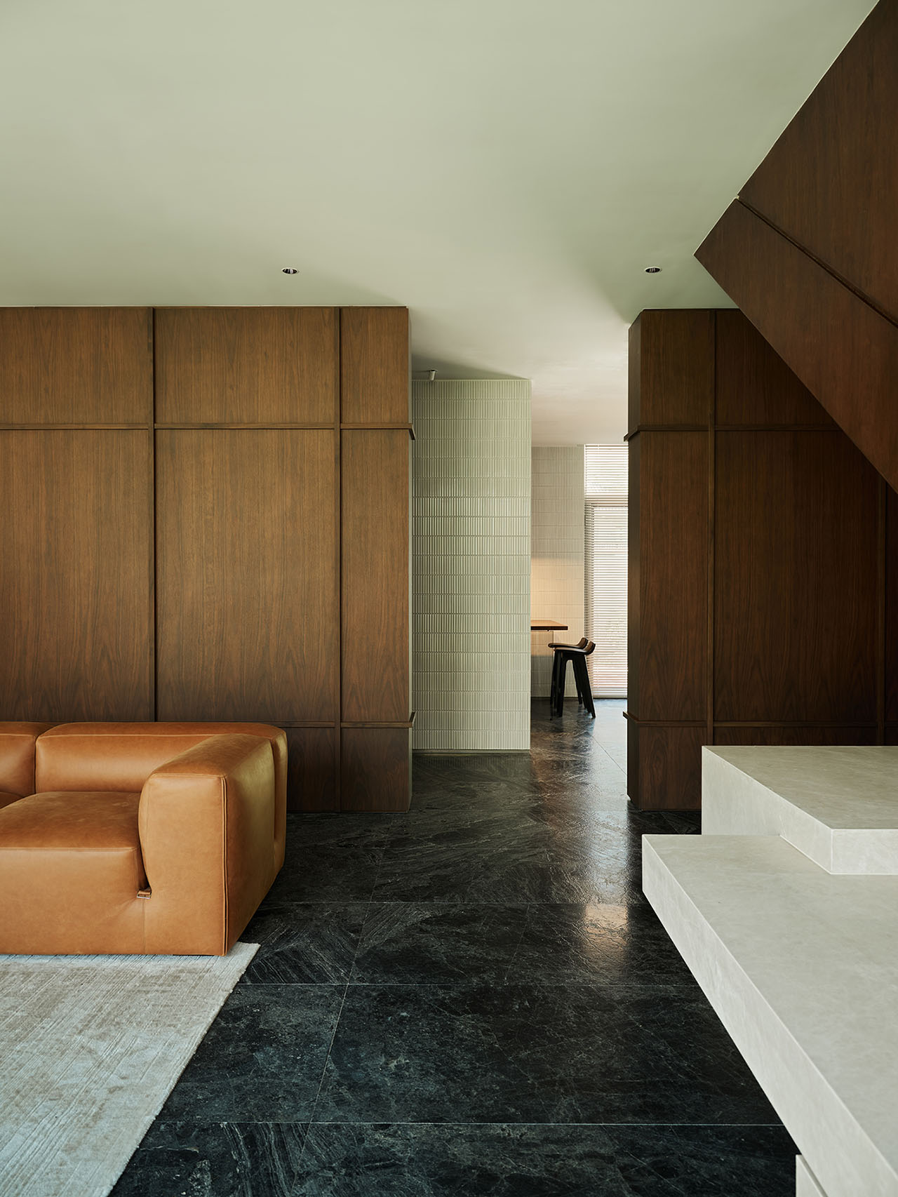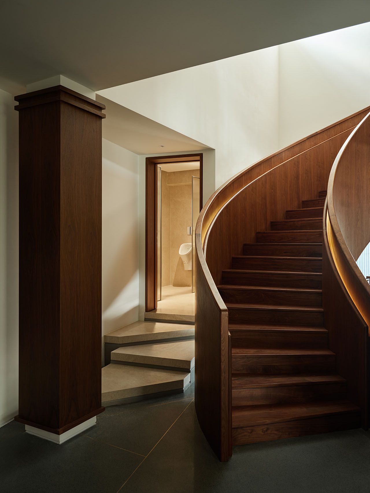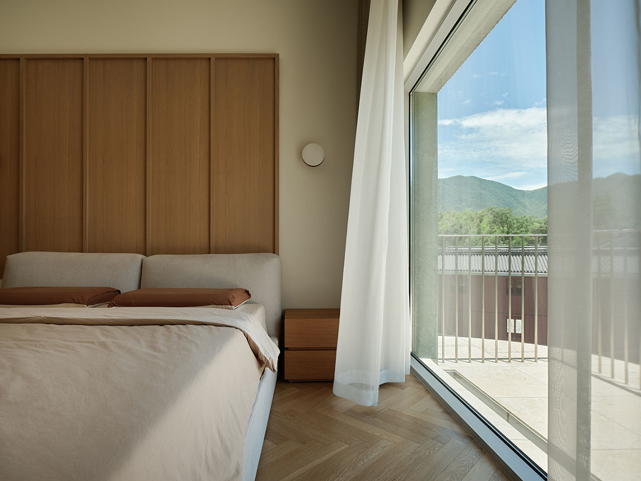 由于功能上楼层越往上,越偏向居住,所以对于室内的材料,越往上木饰面越多,石材越少,色调也是越往上越浅,到了三楼,基本是原木色的居家感。卧室并不大,更加凸显温馨的氛围,同时也想让人更加关注窗外。因为到了三层,已经越过了邻居的屋顶,不论是透过窗户还是步出到阳台,都能看到优美的风景。