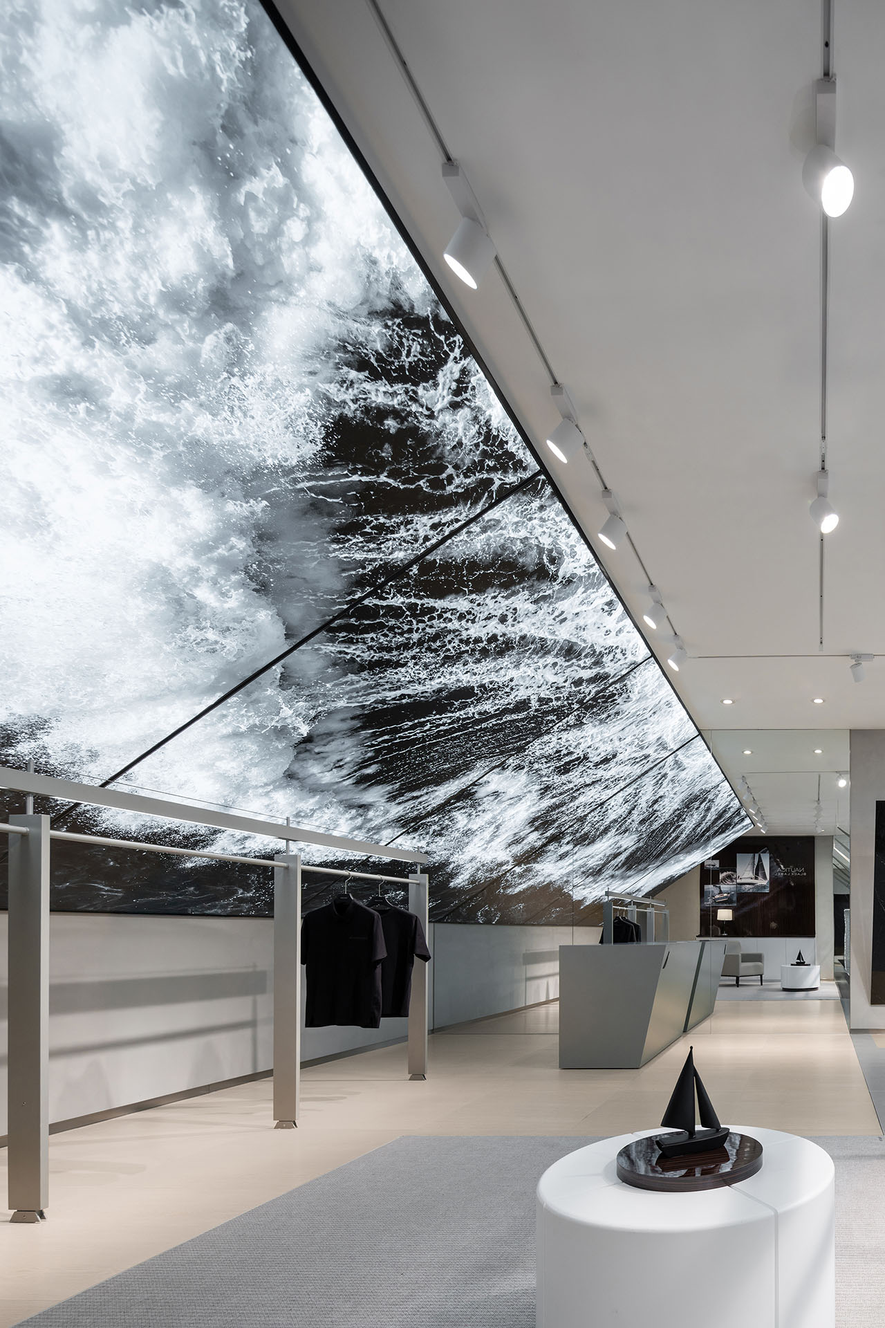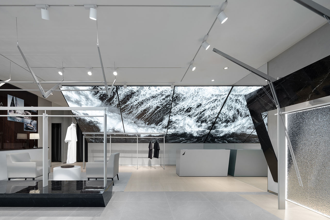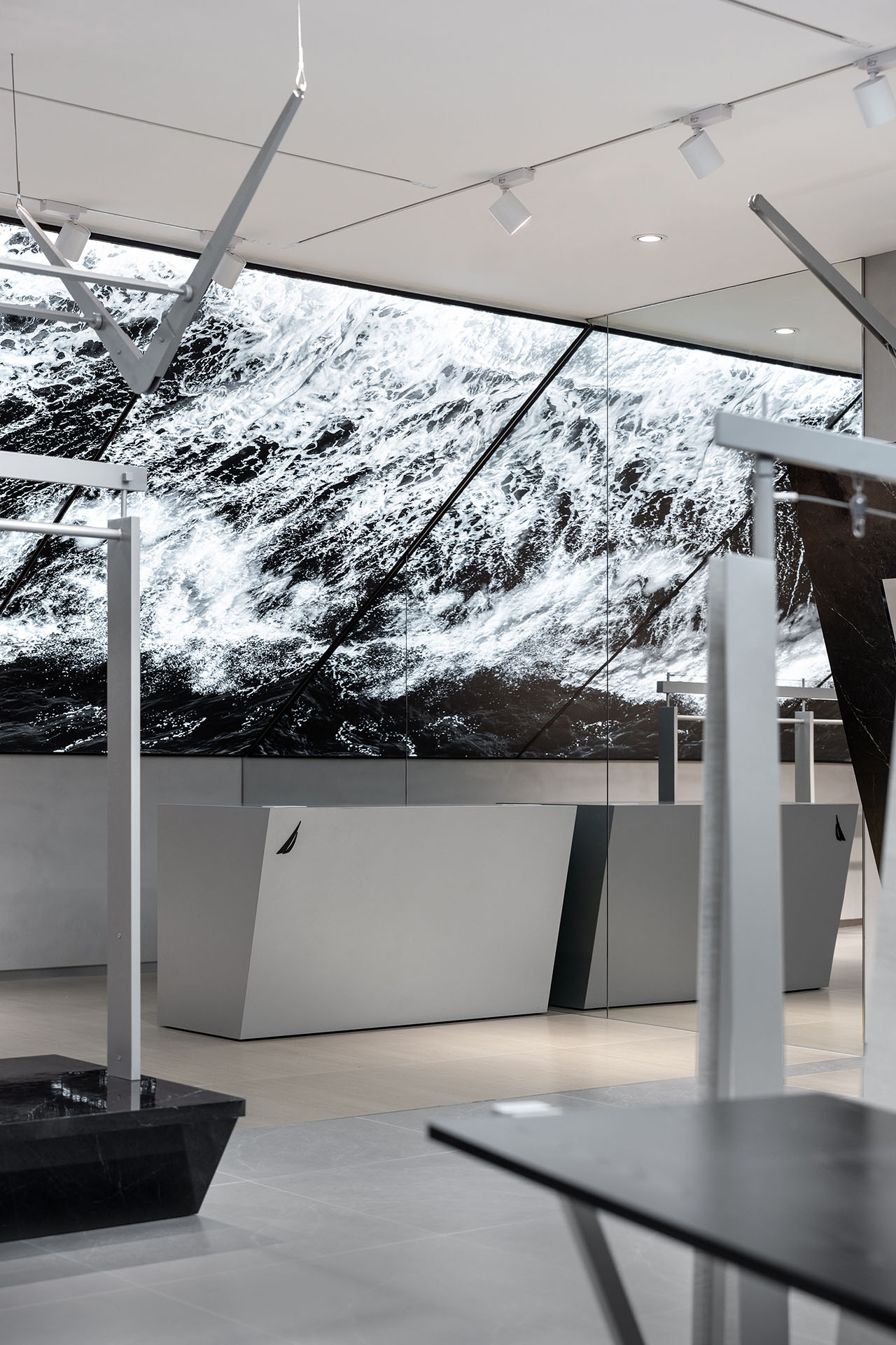 空间序列依循“启航-竞速-归泊”的叙事展开。材质选择也以“航海”为线索,通过坚硬和柔软的反差感营造深度。入口处以硬核的形态界定边界,黑色岩板模拟海浪冲刷礁石的肌理,陈列背板采用水波纹不锈钢,映射夜色中波光粼粼的海面,引导顾客踏入这片“暗涌”的室内海面。