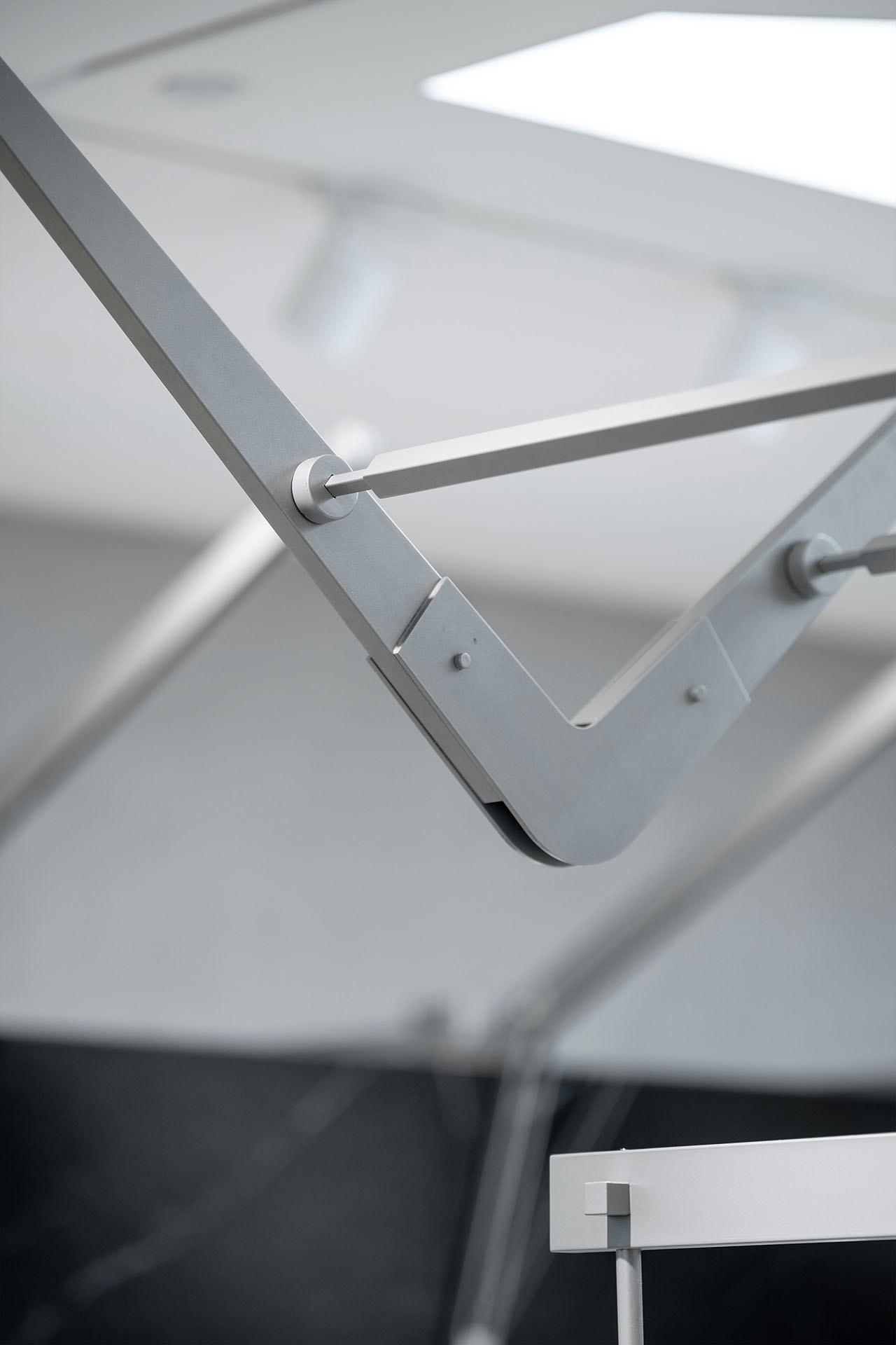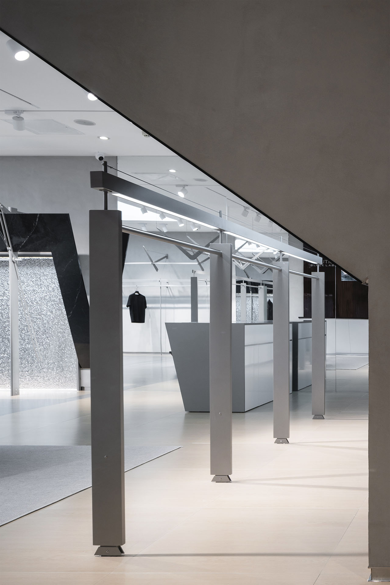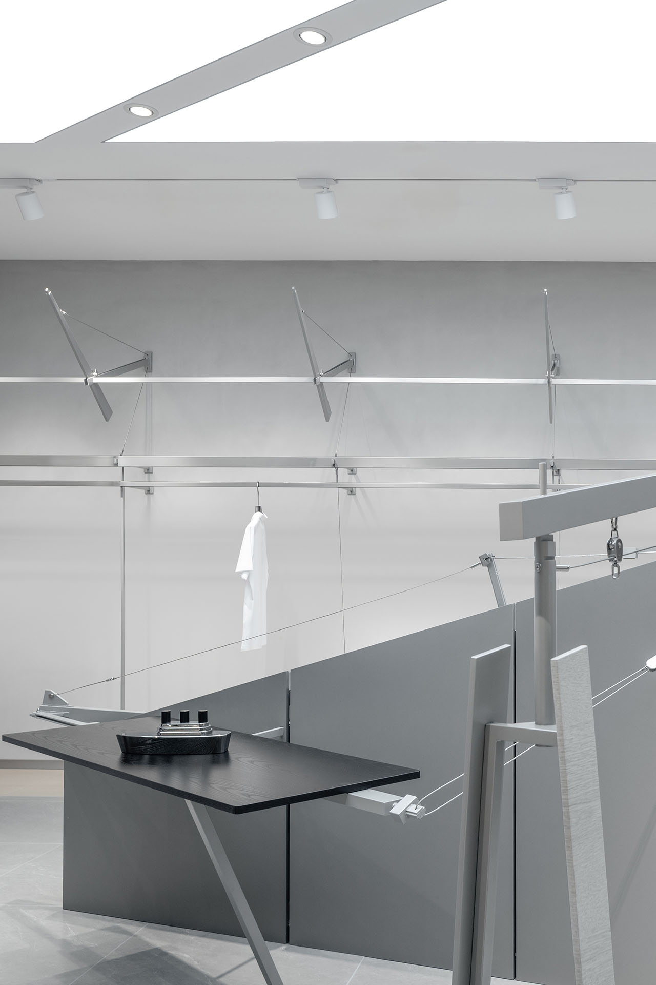 SLT 对这些元素的空间转译不仅解决了结构稳固性与商品悬挂的功能需求,其绷紧的线条更在空间中注入了强烈的视觉张力。这一具有“张力美学”的节点,同时极大地减少了现场焊接作业,以及繁琐的定制环节,对于品牌门店来说具有弹性适配的优势。