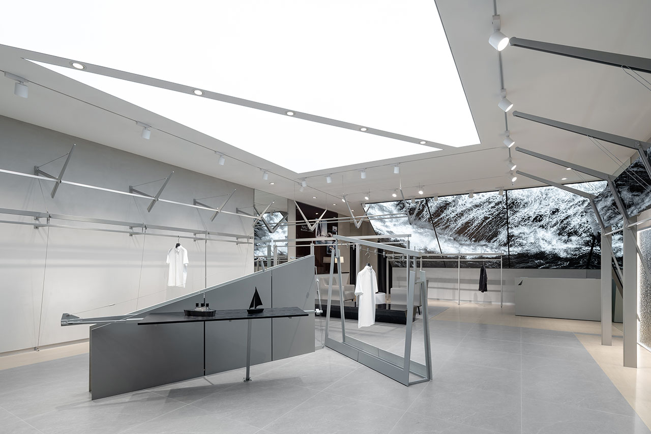设计从帆船的“帆”、“索具”、“甲板”、“系缆桩”等核心构件中提取形式逻辑。巨大的软膜天花是对“帆面”的柔性转译;墙面的悬拉索系统源自“索具”的滑轮与帆夹;浅色木地板回应“甲板”的温润触感;试衣间的挂钩则是“系缆桩”的抽象表达。这一切共同构建了一套连贯的空间叙事体系。