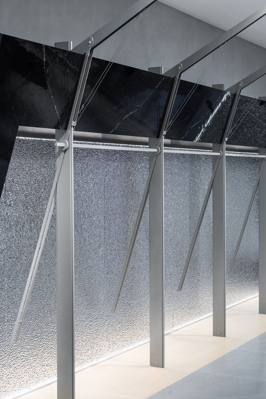 1. 橱窗及墙面陈列系统: 整合水波纹不锈钢、黑色岩板与悬拉索结构,形成强烈的第一视觉印象。