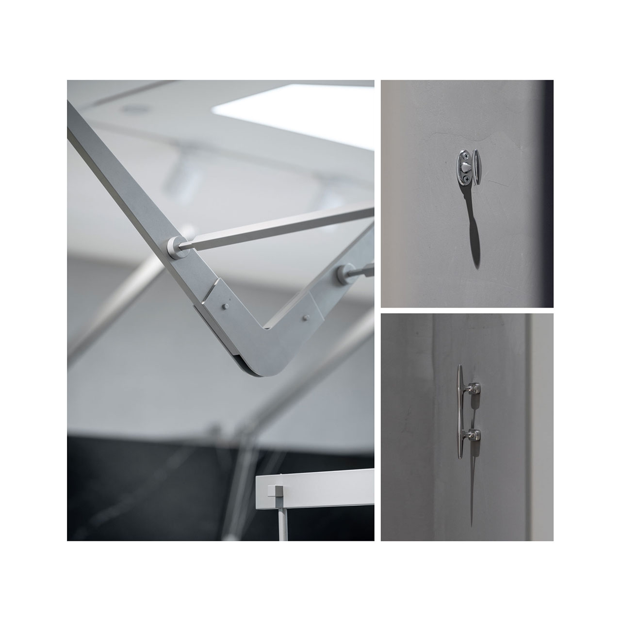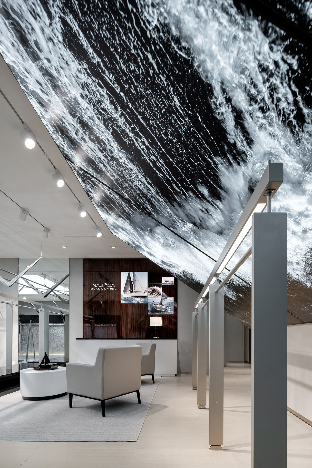 悬拉索结构是项目的关键细部,其灵感源自帆船配件中的滑轮与帆夹;墙面布置的陈列架则是帆船中扶手栏杆、游泳梯等元素的抽象表达。