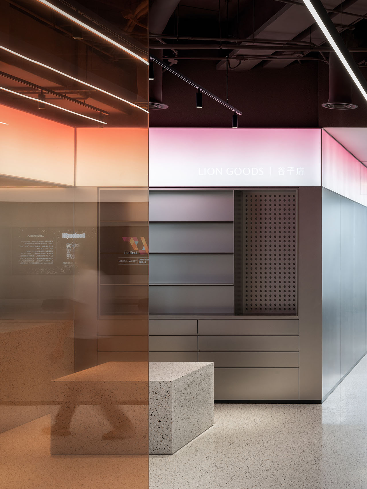 这一楼层是接待访客的楼层,它的核心是一个圆形的Pitch Room,一个点燃创意火花和共创故事的地方。这一空间采用独特的圆形布局,配有曲面LED屏幕。里面的桌椅可以灵活移动,随时调整布局。智能玻璃墙轻轻一按,就能变成雾面,保证私密性。这是一个高度沉浸式的空间,将客户与团队的能量汇集一处。这种深入的合作所带来的成果在旁边的互动式的Digital Award Wall上一一呈现。这个由LED屏幕构成的“数字荣誉墙” ,透过刻着阳狮获奖记录的玻璃砖,用灯光和动态影像,以互动的方式把集团的高光时刻生动展现在观者面前。