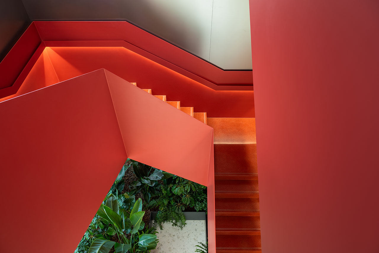 充满雕塑感的中央楼梯是联系各层的另一个要素。作为一个物理层面和社交层面的枢纽,它不仅吸引人们在上下楼层之间走动,而且创造了结识新同事的机会。在高密度的高层办公环境中,团队凝聚力容易因物理分隔而减弱。这座楼梯将整座总部化身为一个充满活力的社区,有效打破这种隔阂,重塑空间凝聚力。