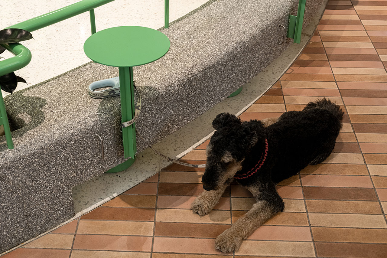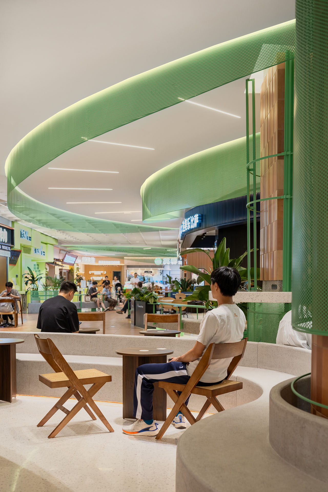 面向公区设置曲线条凳,界定了商铺与公区的边界,可提供充足座位以优化公区氛围。条凳配备一体化小圆桌,并设有宠物友好型停靠把手,以丰富场景及满足需求。