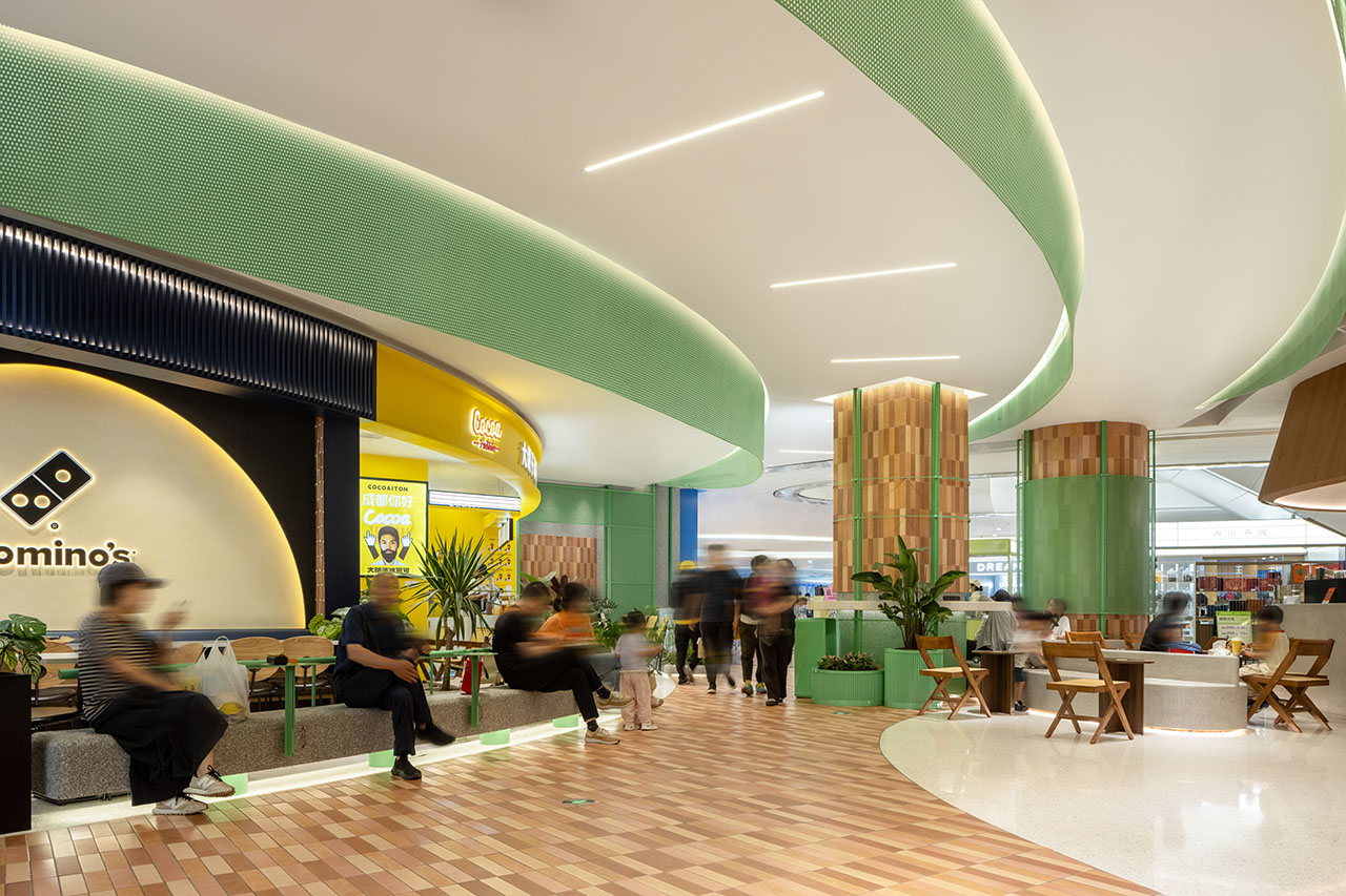 上部空间(顶部区域)以 “莲叶” 为原型,在形态、材质及色彩上,采用具有绿意、轻透、明亮特质的金属穿孔卷材作为设计元素。