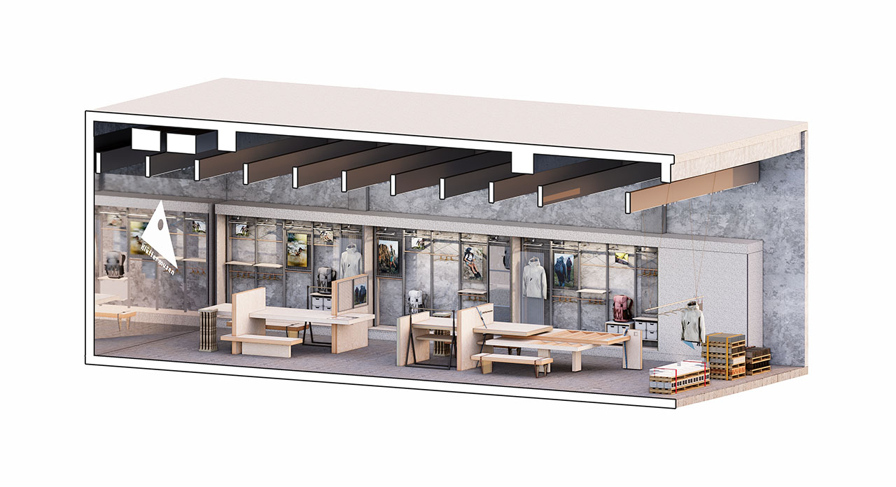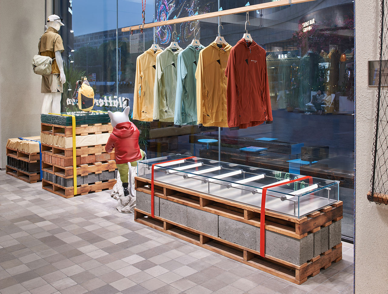 橱窗展示道具由红砖、工字钢、木栈板、帆布等城建废弃物组成,践行品牌环保理念。城市建设废品再利用的设计策略,超越了可持续发展的自然保护层面,更是一种集体记忆的守护,折射出城市的飞速发展。