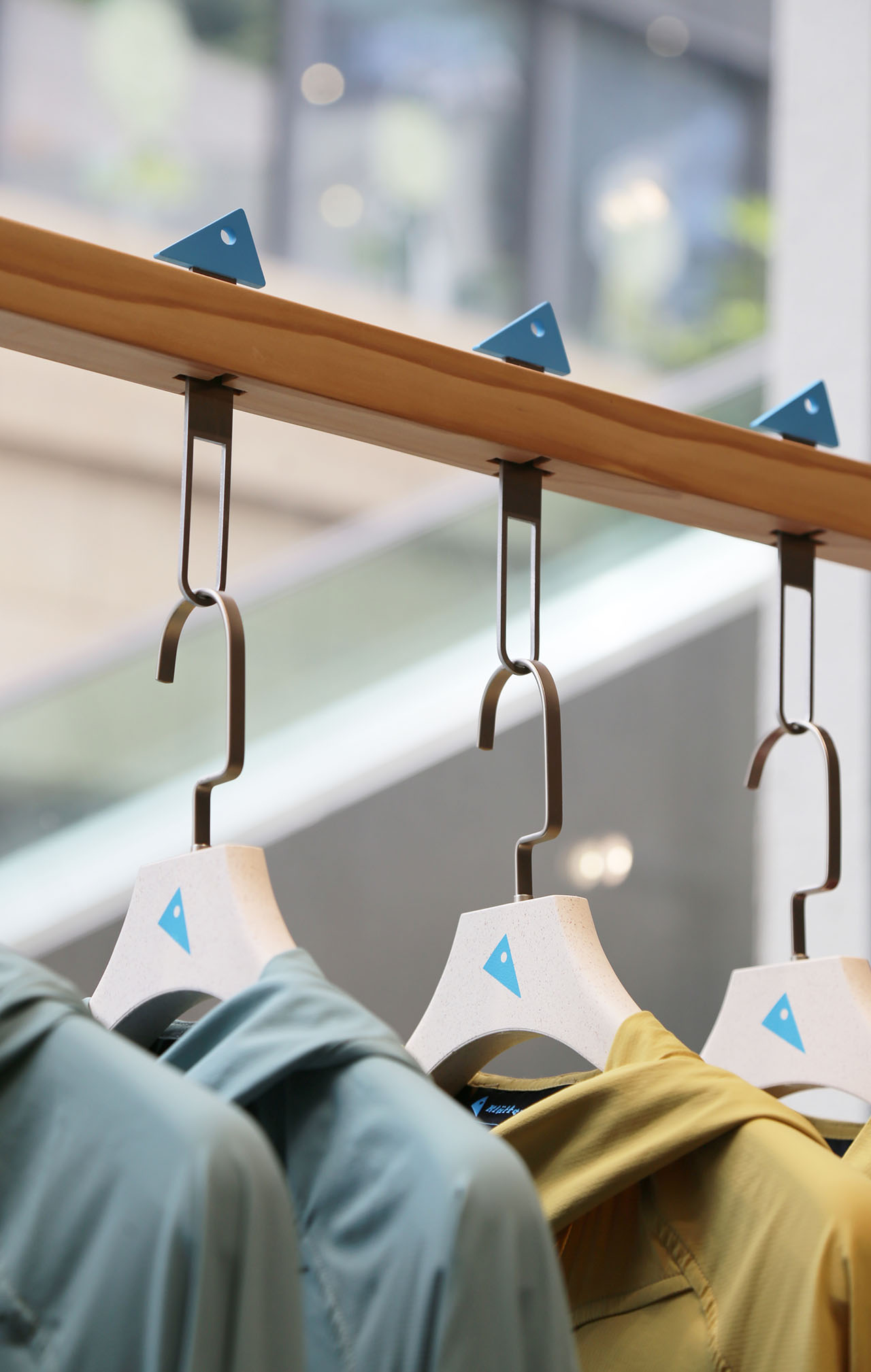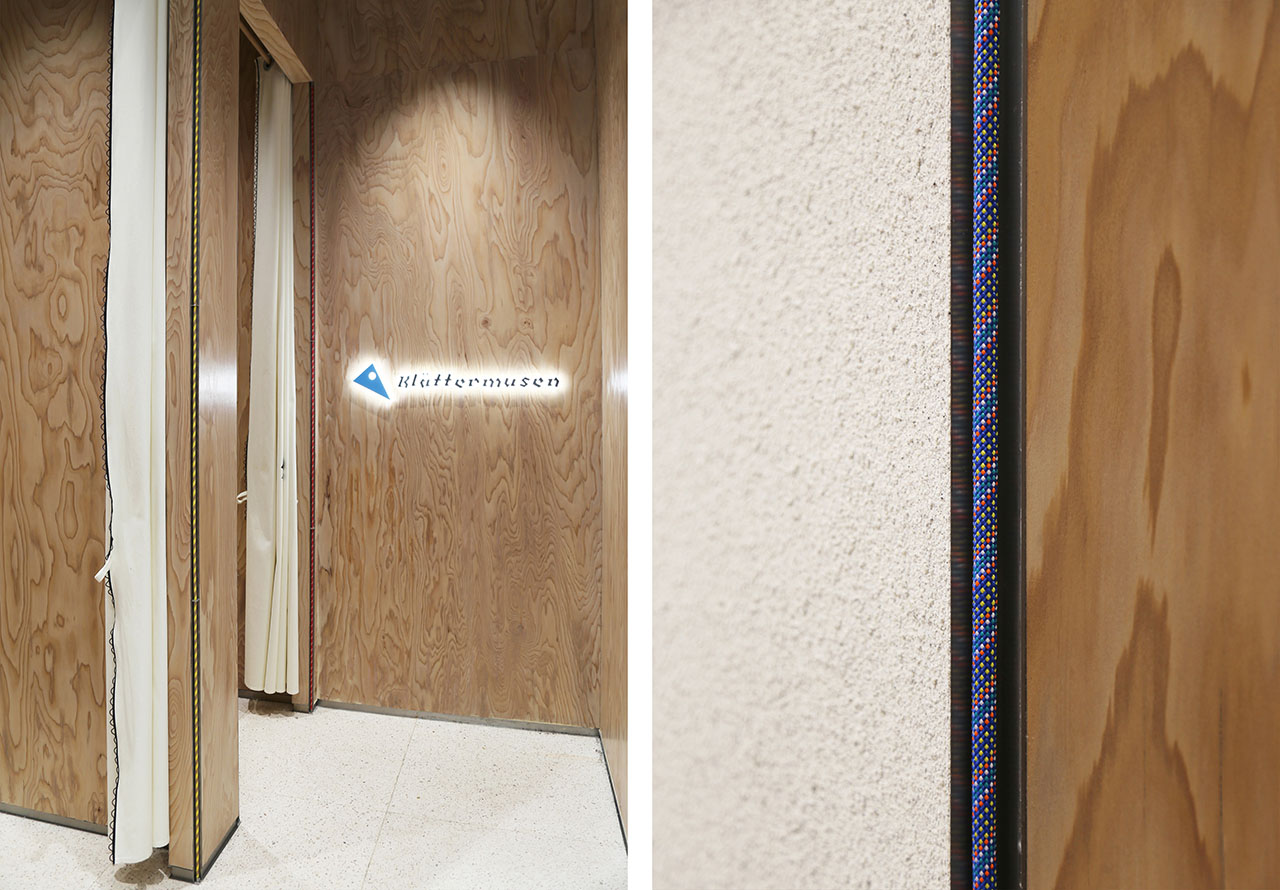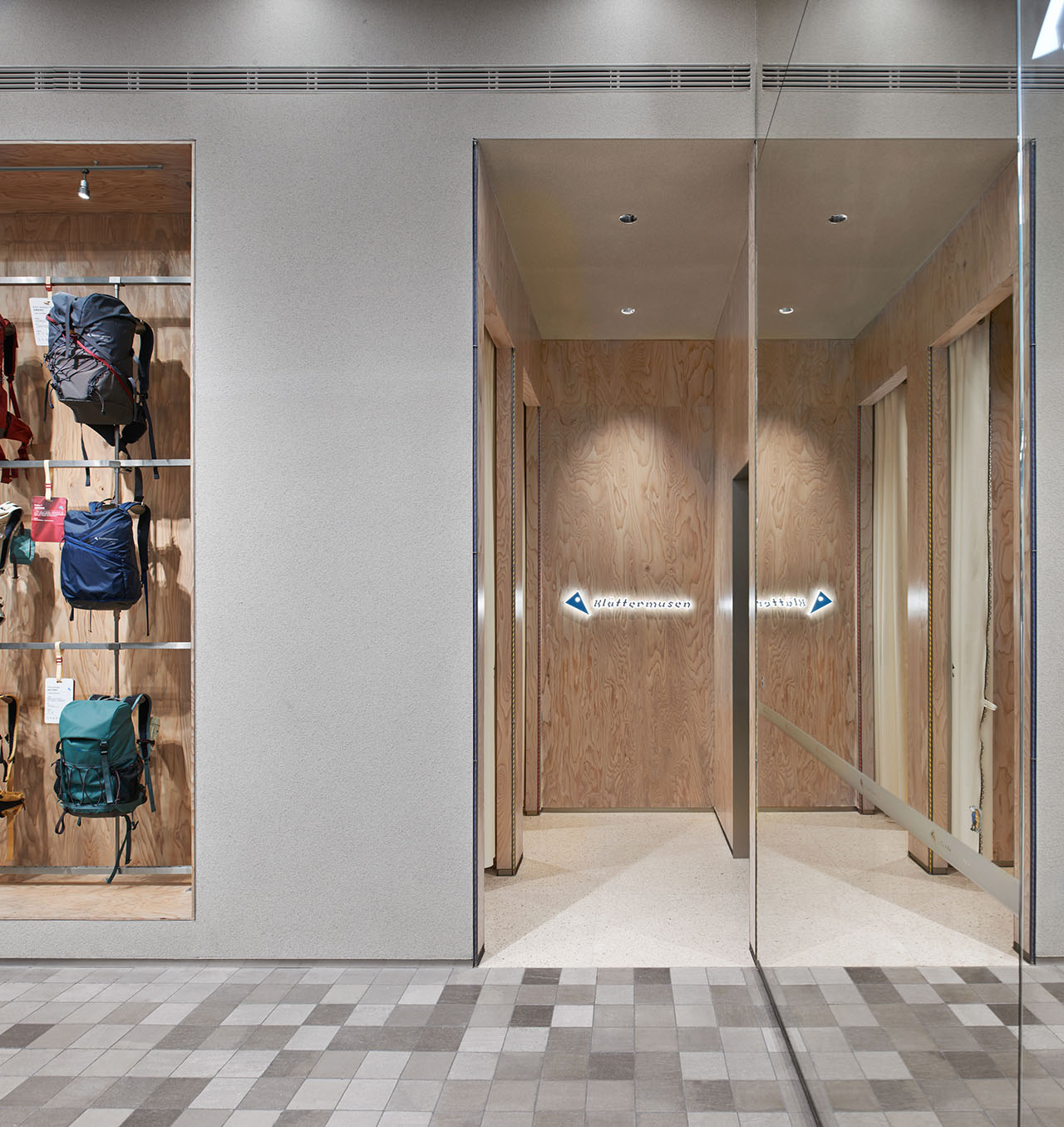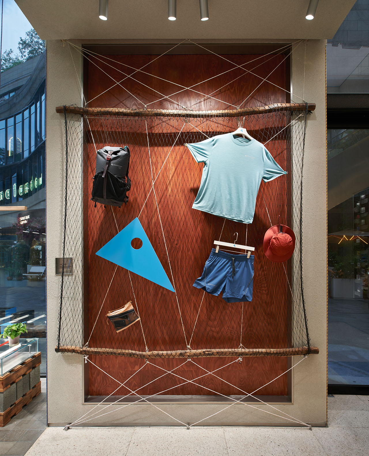 试衣间延用桦木海洋板作为隔断饰面,传统布帘由帐篷帆布代替,营造身处户外的氛围感。墙面转角利用登山绳做细节处理,增强设计感和品牌记忆。