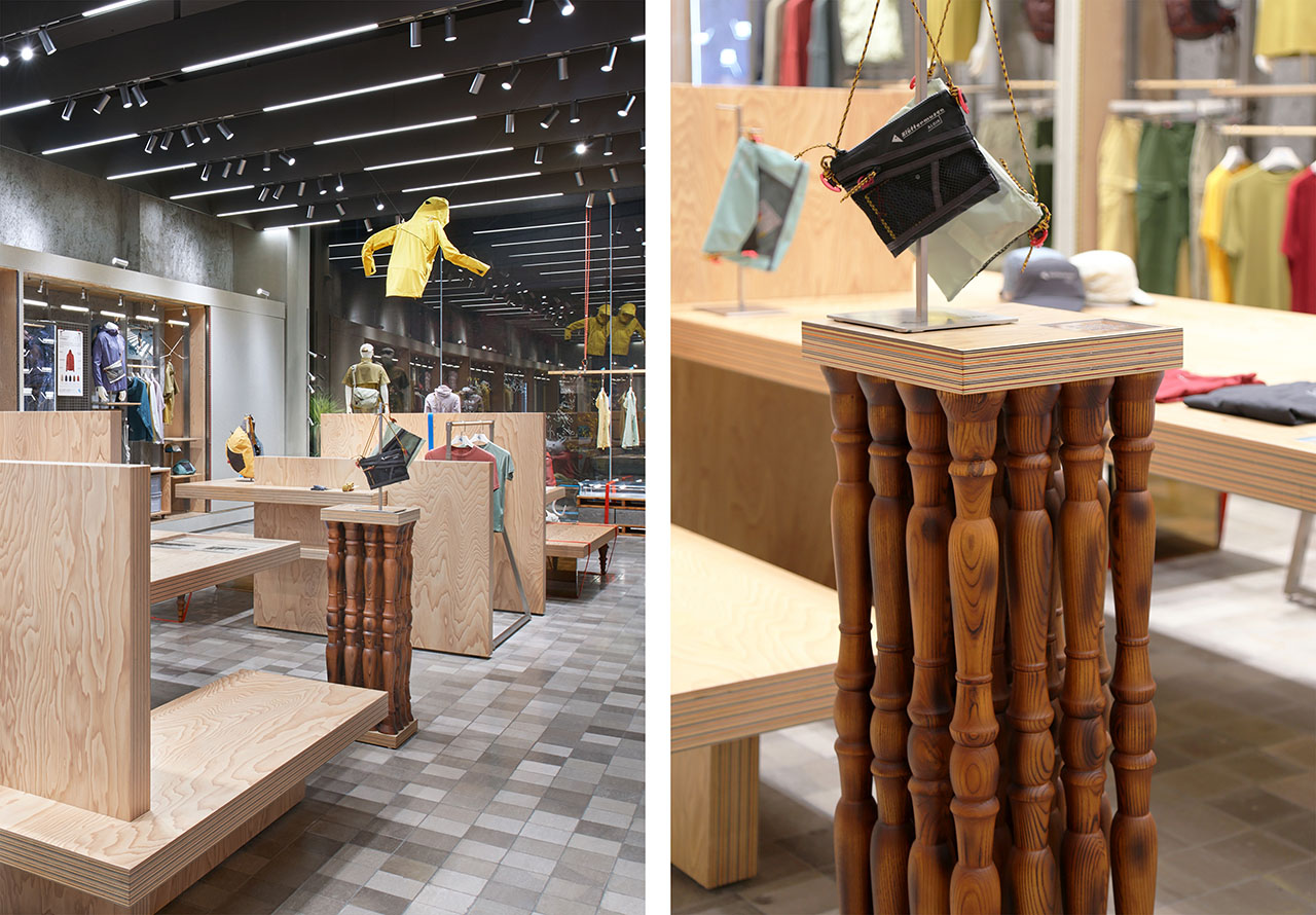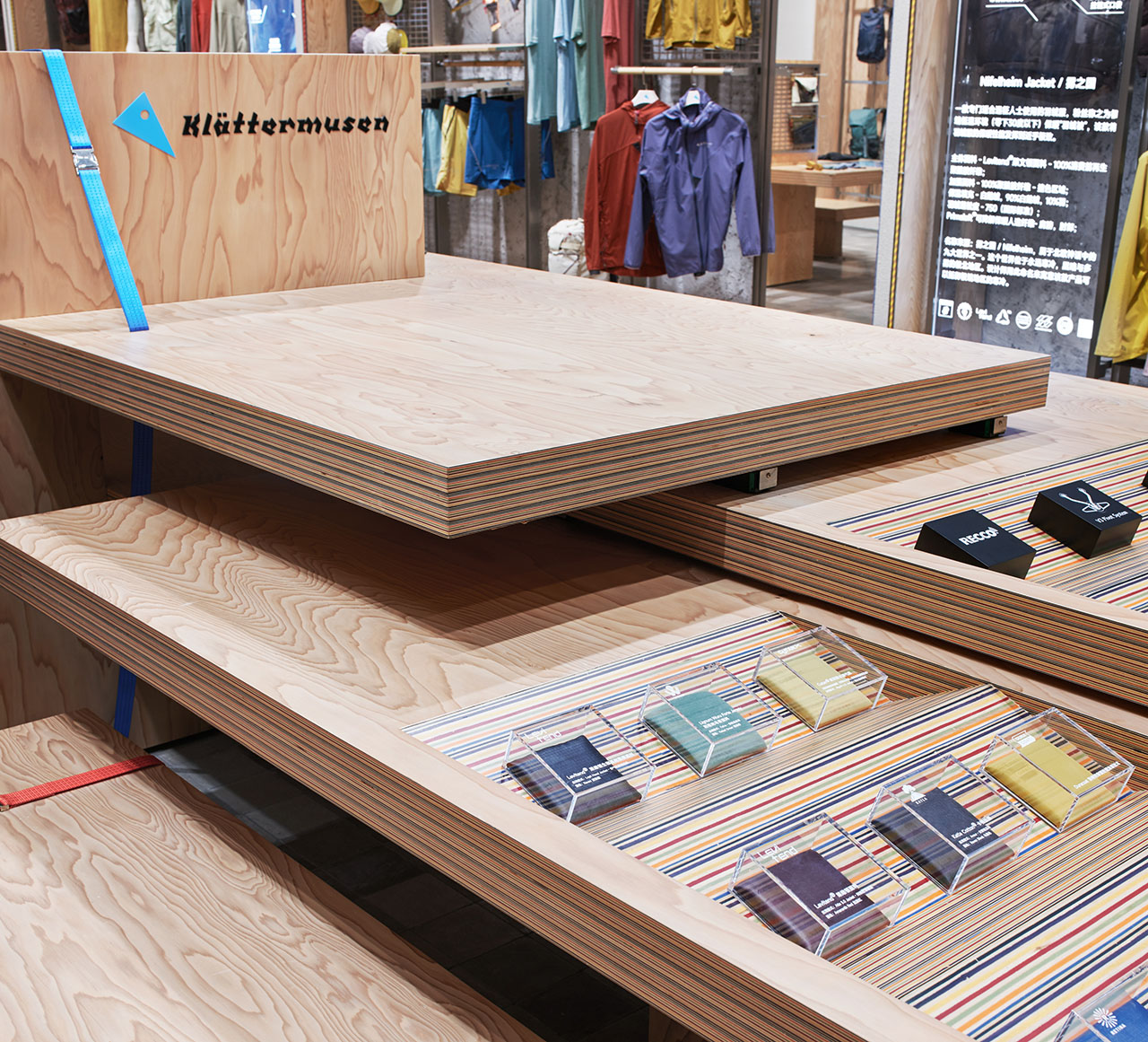 中岛道具由彩色桦木海洋板拼接、组合而成。木板表面纹理形状如同海面波浪,展示台面及道具侧面呼应品牌丰富的色彩搭配,经过工艺打磨的原始材质体现了自然的户外感。