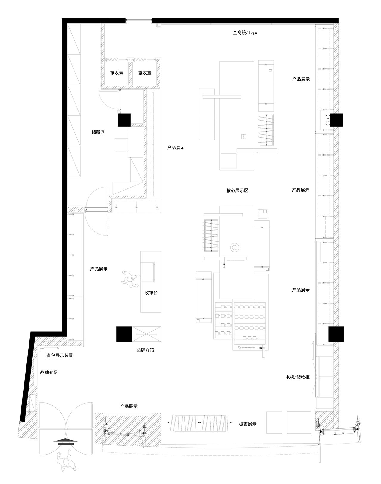 核心展示区由两个独立的道具单元组合而成,包含衣架、展示台、休息座椅等元素,通过不同使用模式创造多样场景。核心展示中岛位于空间中轴线上,贯穿橱窗展示、活动区及展示区。