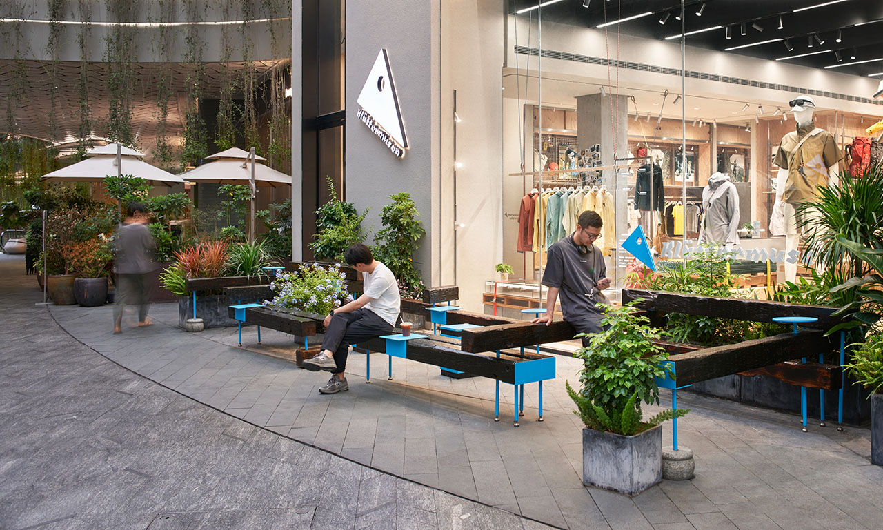 外摆区为商区行人提供可稍作停歇的休憩场所,是门店和品牌体验的室外延伸;同时也将户外行人的注意力引向室内空间,成为橱窗展示的一部分。