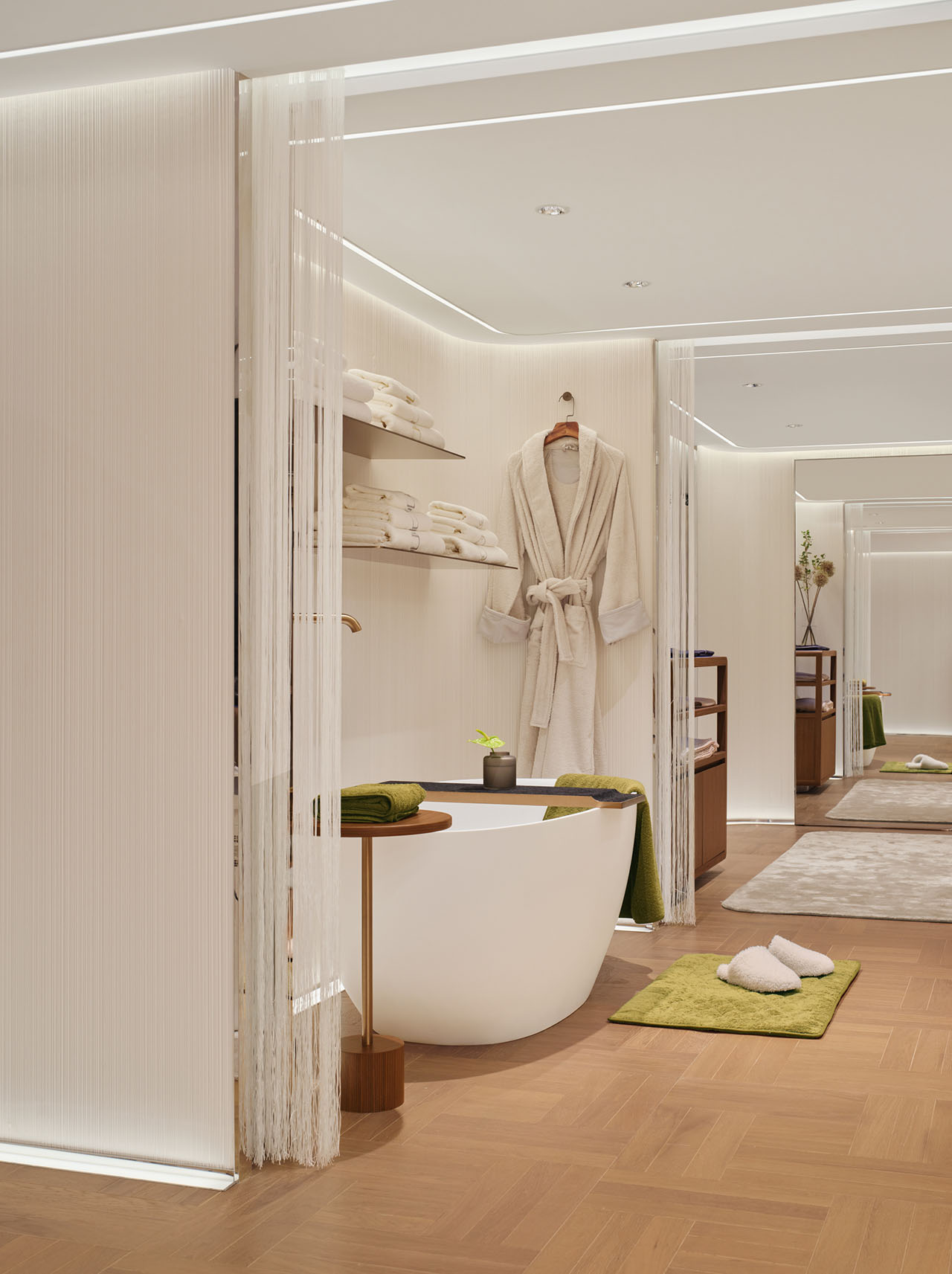 大理石纹路与柔白织品交织出一处静谧角落。浴袍、毛巾、居家服皆以自然陈列呈现,每一处细节都在传递沐浴时刻的织物奢享。这里也展示Frette to Wear系列——真丝睡衣、羊绒披肩、棉质居家服,将奢华延展至日常仪式。