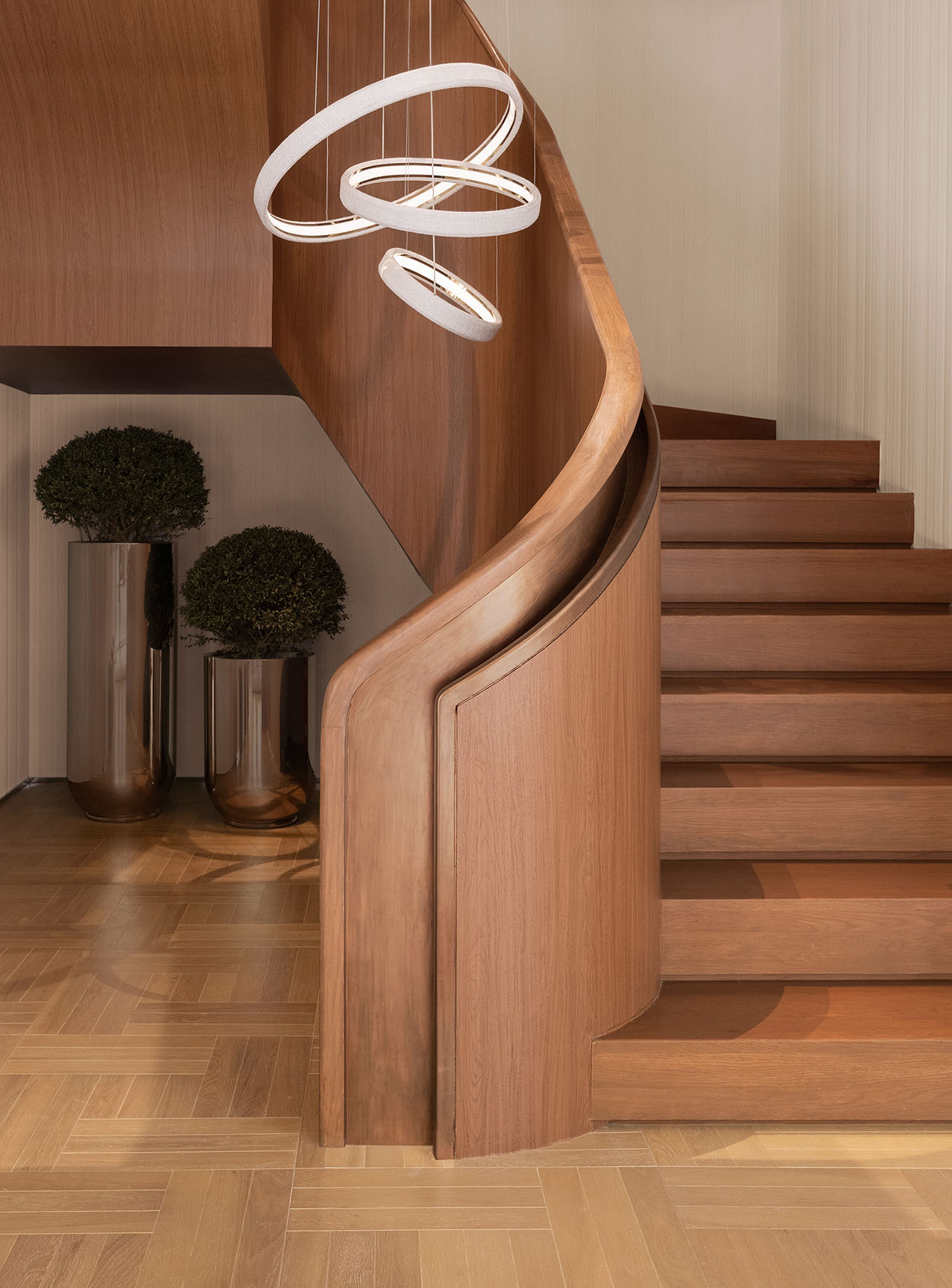 材料系统以天然与触感为核心。温润的胡桃木、柔性墙布、丝线帘幕与现代树脂共同构成空间的触觉层次。链条元素贯穿始终,环形吊灯、曲面家具皆以连接为母题,这一设计符号既是历史的印记,也是品牌精神的隐喻。