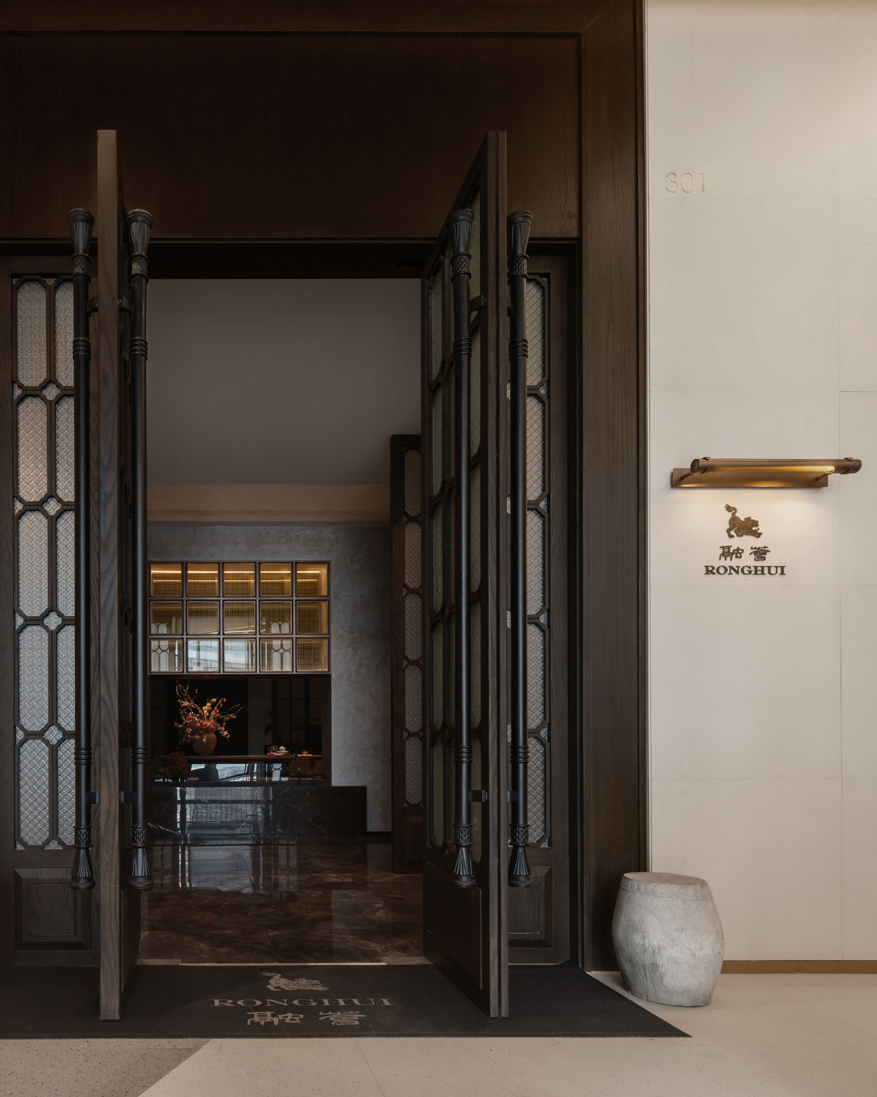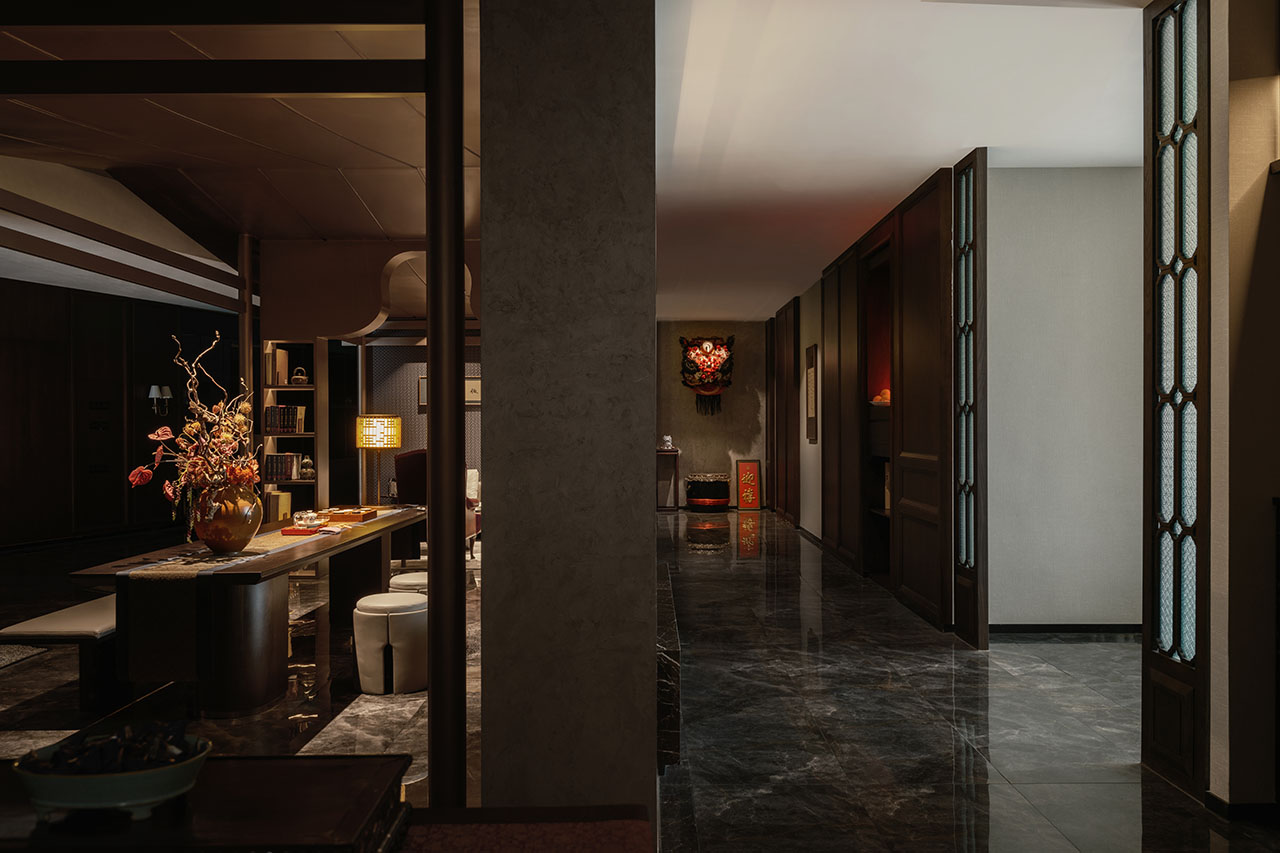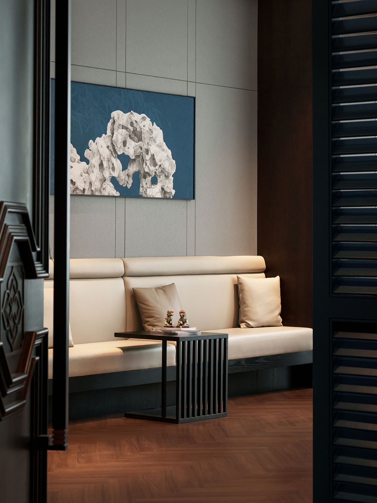 设计伊始,便着意于营造心理转换的仪式感。拉长的入口动线借鉴了苏式园林“曲径通幽”的经典手法,通过空间序列的延展与节奏控制,引导宾客逐步脱离外部城市的喧嚣。门厅区域巧妙运用温度与光影的双重设计,形成感官上的缓冲地带,使宾客在行进中完成从“市井”到“秘境”的心理过渡,为后续的沉浸体验奠定基调。