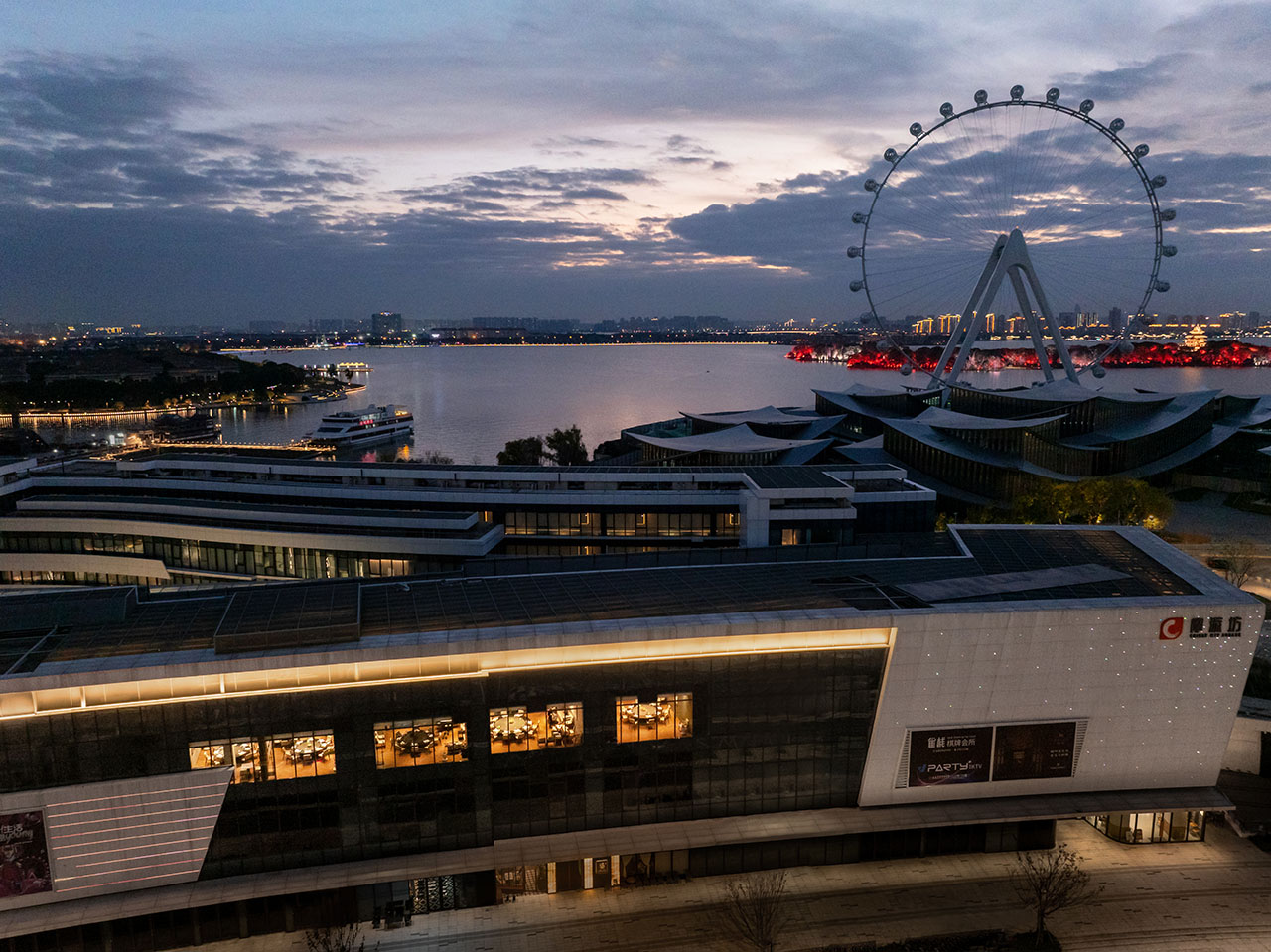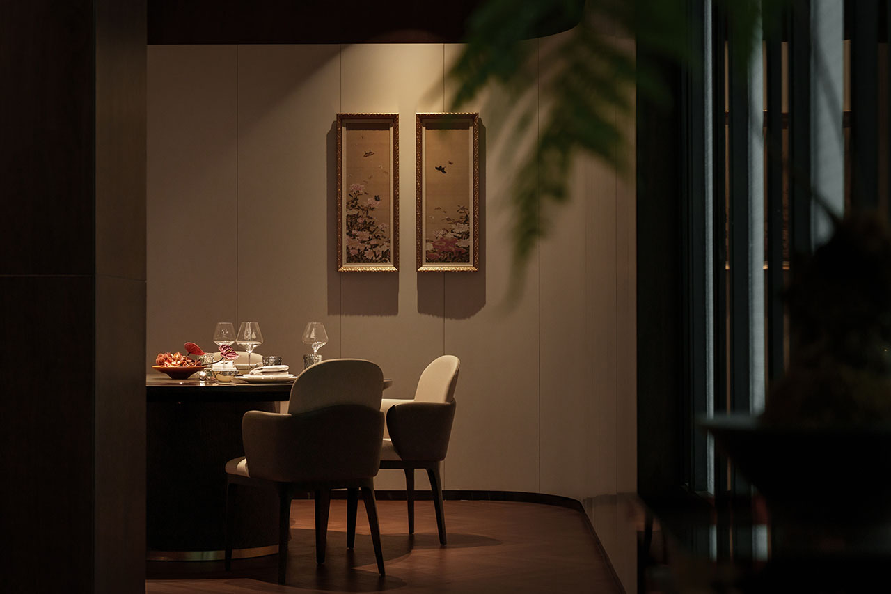 “融荟”的精髓在于其无处不在的文化碰撞与和谐共生,这通过精妙的设计语言与材质工艺得以具象化。在材质与工艺的对话方面,包厢空间呈现出东西方美学的交织。一方面,东方意境的留白雅致统领基调,辅以精致的花窗、细腻的木雕、典雅的茶具、富有禅意的花艺,共同营造出一种寂静、内敛、含蓄的浪漫氛围。另一方面,西方文化的明艳、精致与力量感亦清晰可辨:璀璨的水晶吊灯倾泻下华丽光芒,以现代材质诠释自然意象,以及金属构件的巧妙运用(如收边、灯具、装饰细节),带来硬朗与光泽。东方木质的温润、手工雕刻的细腻与西方水晶的璀璨、金属的冷冽形成强烈而和谐的材质与工艺碰撞,正是“碰撞”叙事阶段的生动体现。建筑立面的设计语言同样呼应着核心理念。以现代简洁的几何线条勾勒形体,摒弃繁复装饰,彰显时代感。大面积通透的玻璃幕墙成为最大亮点,不仅最大化引入金鸡湖的壮丽景观,将自然变为室内动态画卷,更在视觉上形成了强烈的对比:传统的“粉墙黛瓦”所代表的厚重、封闭、内向性,与现代建筑追求的“通透轻盈”、开放性、景观最大化,在此形成直观的视觉对立,成为项目文化定位最有力的开场宣言。