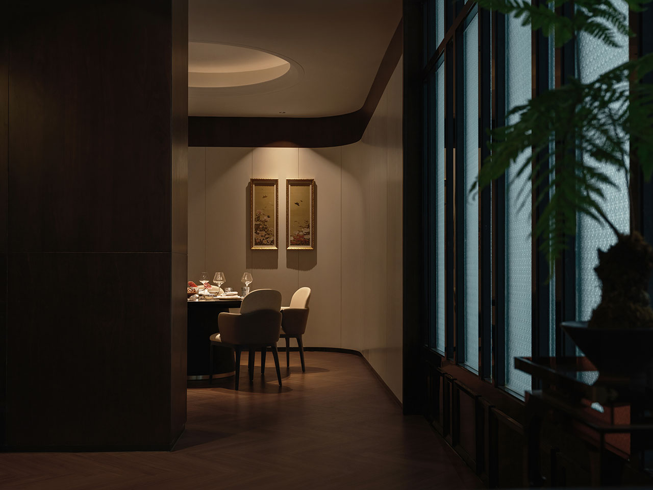 在空间组织与园林意境转译方面,室内空间以一条精心设计的“曲廊”作为动线骨架,宛如传统园林的游览脉络。它蜿蜒流转,有机串联起“亭、院、阁”等抽象化的园林意象,移步易景,空间层次丰富。特别值得一提的是宴会厅外的连廊虚亭,灵感源自岭南园林的“波形廊”设计,其柔和的曲线不仅塑造了动态美感,更在转折处自然形成框景效果,将户外金鸡湖光与精心布置的室内绿植、灯光艺术无缝融合,内外互借,景致共生。设计师大胆植入一个极具当代感的“亭”式建筑作为整个空间的文化核心与视觉焦点。这个“亭”并非传统复制,而是以现代语言重构的象征物,成为连接东西、融汇古今的精神图腾。围绕此核心,用餐区域并非完全封闭,而是运用精巧的格栅系统进行分隔,形成一系列“虚者为亭、曲者为馆”的半围合空间。格栅的运用,既是对苏式园林花窗、月洞门等文化符号的现代转译,又有效塑造了空间的氤氲气息与朦胧美感,在保障私密性的同时,维持了空间的通透性与流动感,增强了沉浸式体验。在空间意趣营造上,提炼了苏州园林“疏密得宜”的空间哲学与岭南花园“小中见大”的造园智慧。通过精心布局,打造了如“光影诗庭”、“岭南花园”等主题鲜明的区域。这些空间或开敞明亮,光影婆娑,演绎时间的诗意;或精巧浓缩,于有限尺度内营造丰富的景观层次与意趣,体现了东方美学对空间意境的极致追求。
