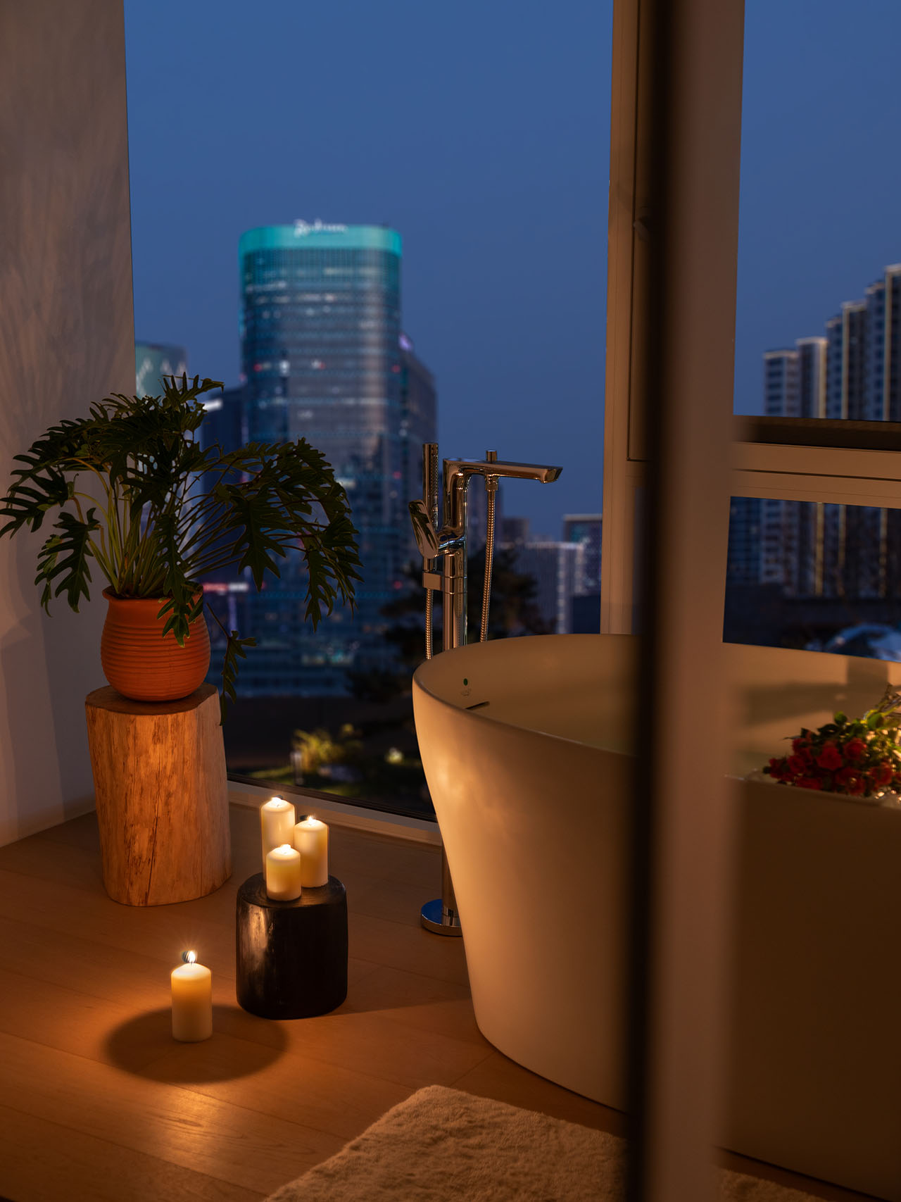 一个人住的主卧套房配置非常丰富,梳妆台、衣帽间、大浴缸、卫浴区该有的都有。原先的双阳台根据功能分区一隔为二,一边是梳妆台和瑜伽健身的区域,一边是浴缸泡澡区域。在睡房区和衣帽间、卫浴之间有双动线的移门,让整个空间的动线更加灵活多变,使用起来也会更加方便。