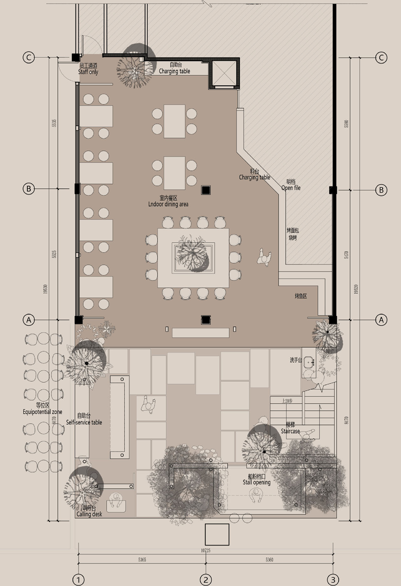 一层空间直接与夜市相连,开放的界面、石地面的触感与低矮的座位,使室内外保持高度渗透,延续夜市的流动性与温度。