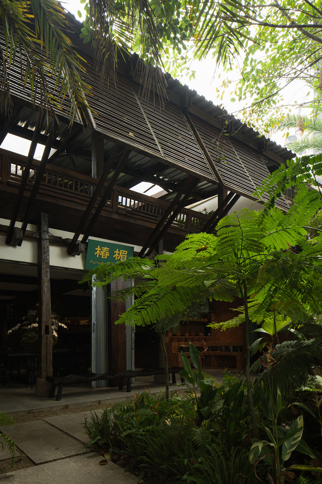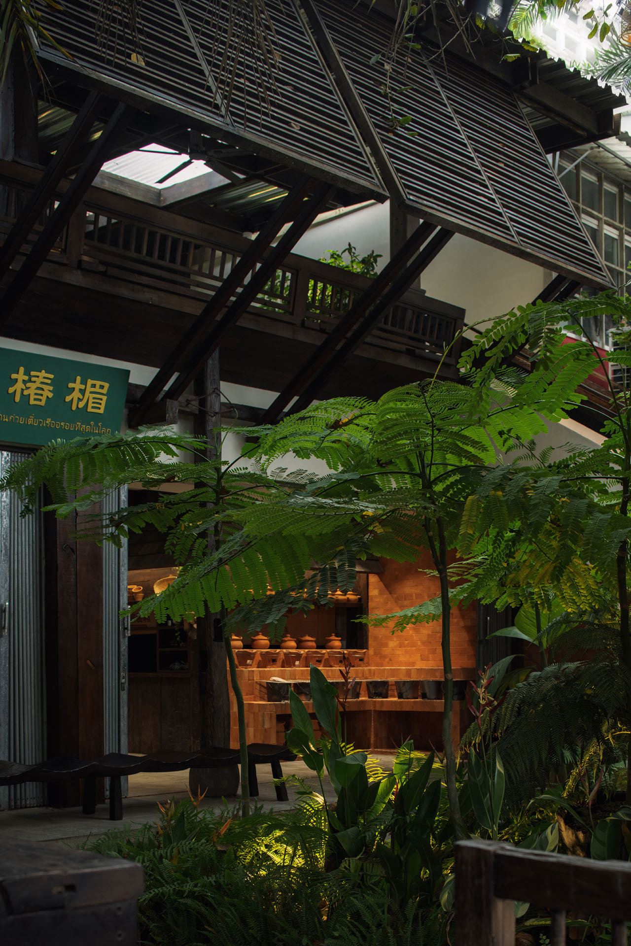 风通过可开合的木百叶与屋顶结构穿行其中,带着热带特有的湿度与气味,将烹饪时升腾的热气与香料温和地扩散开来。光、风与湿度共同作用,形成一种介于室内与户外之间的状态。
