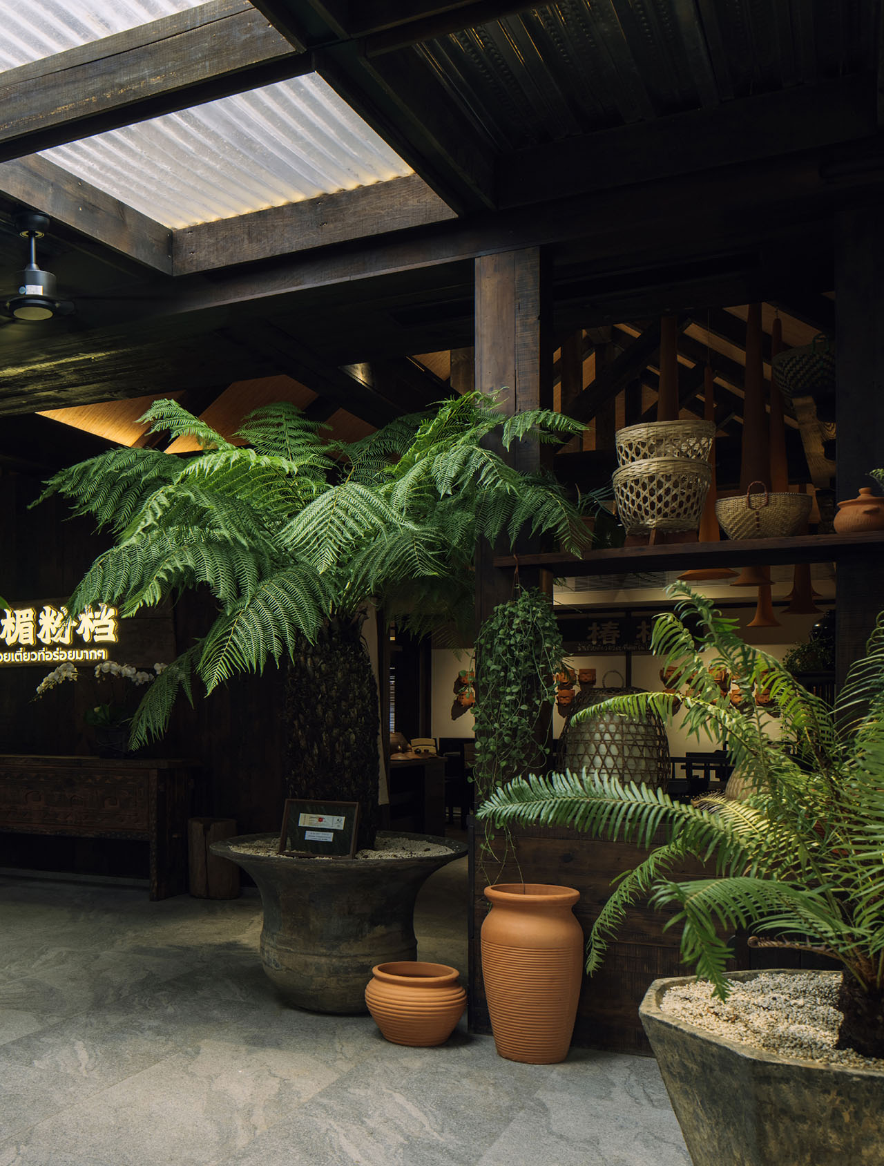 在椿楣粉档,光线并未被当作需要精确控制的视觉工具,而更像是一种自然进入空间的条件。瓦片将自然光切割为柔和而分散的亮度,落在植物、木梁与陶罐表面,使空间始终保持缓慢而潮润的时间感。