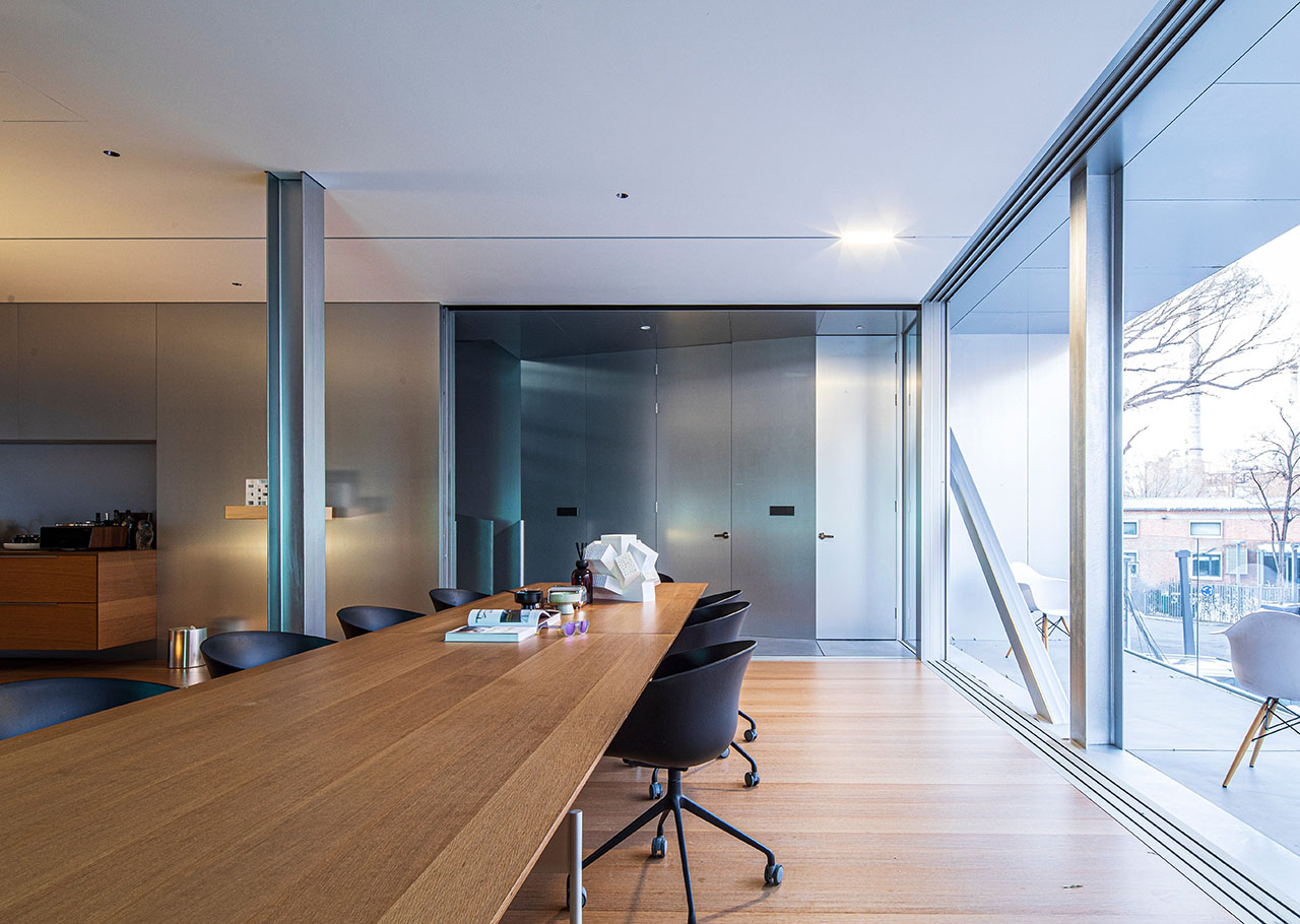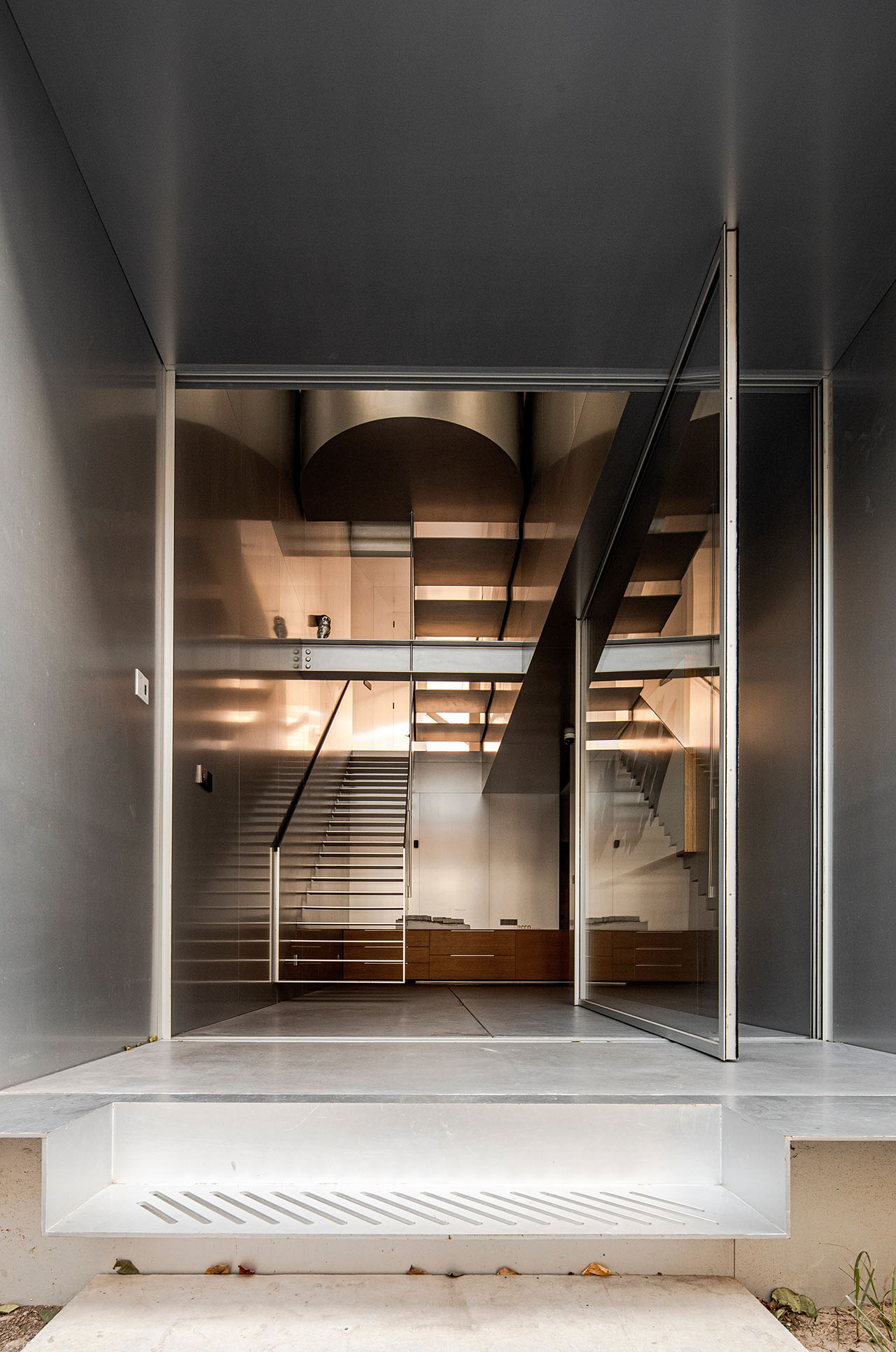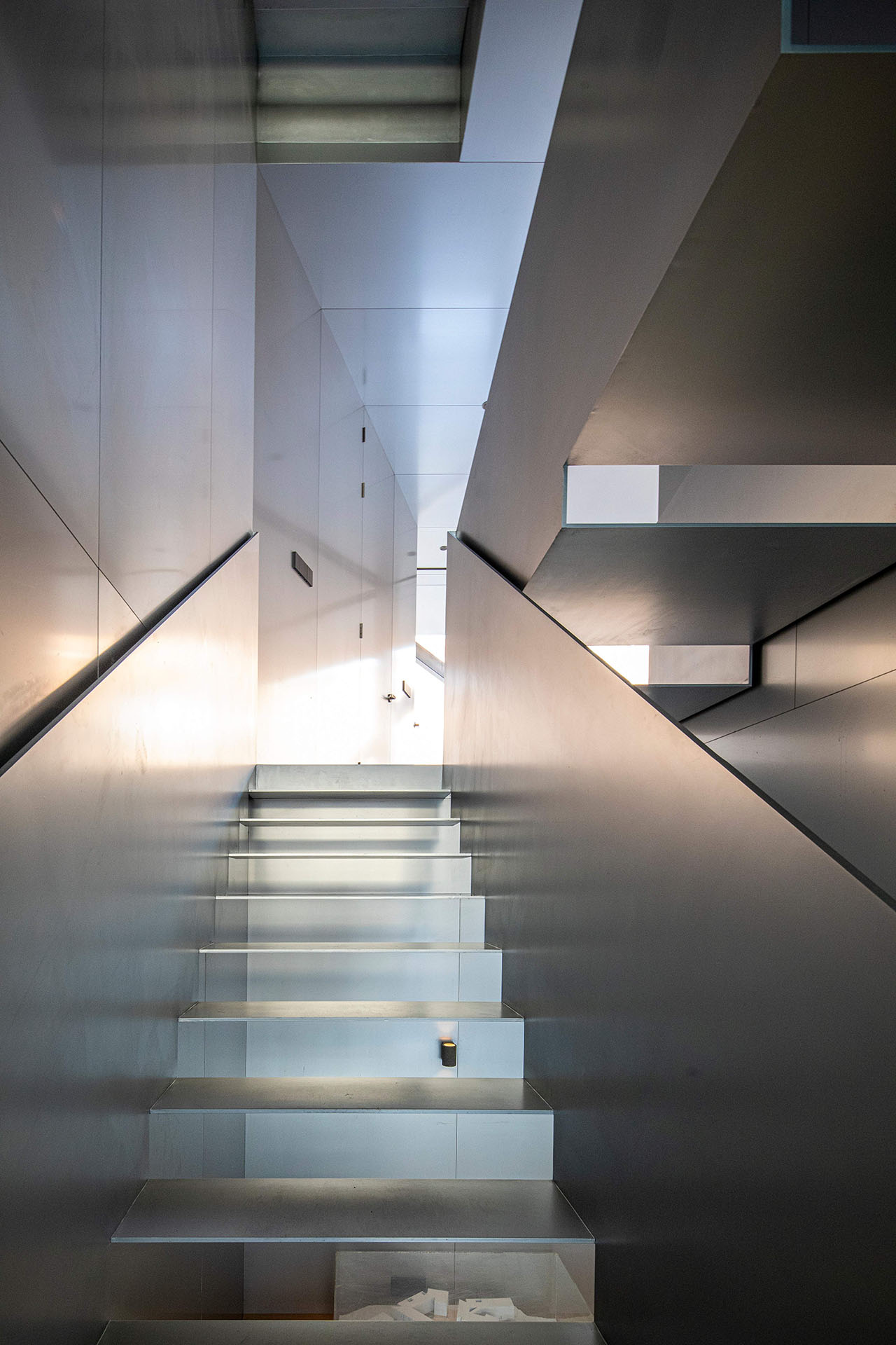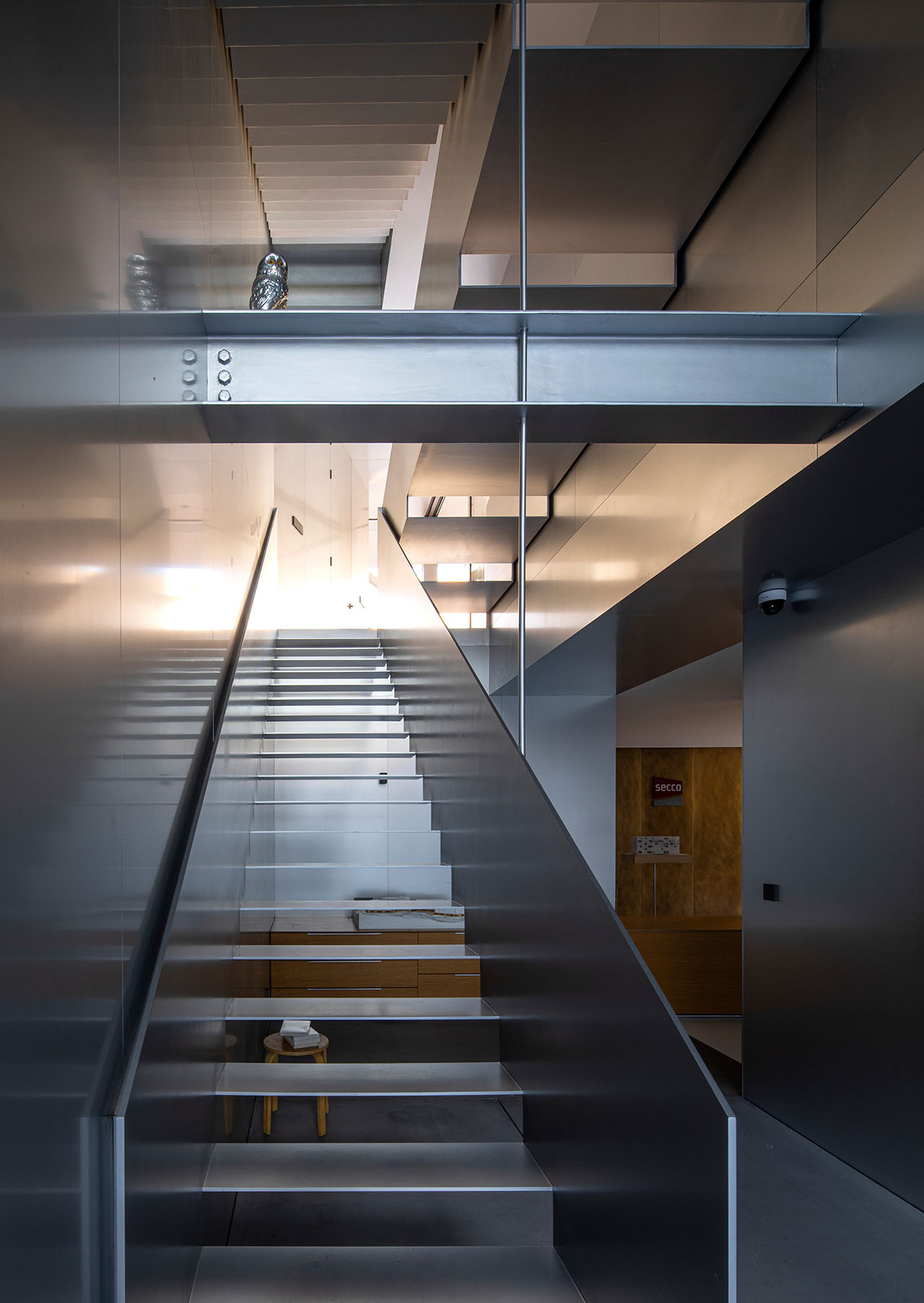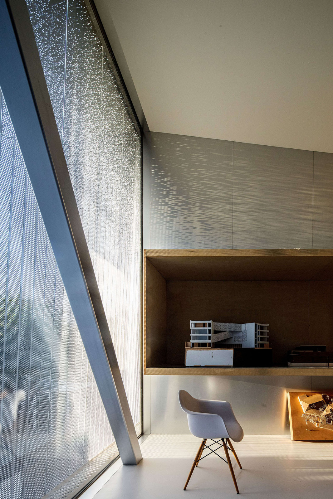 改造后,一层为展示空间,二层为会议和接待区,三楼用来工作,为了将三个楼层更好地联系成一个整体,我们取掉一部分楼板,设置了从一层垂直向上直至屋顶的挑空空间作为楼梯间,同时也是入口处的开放前厅。拾级而上,空间逐层缩小,西侧窗也随之从地面上升到屋顶。午后,阳光透过穿孔铝板洒满整个空间,柔和而静谧。