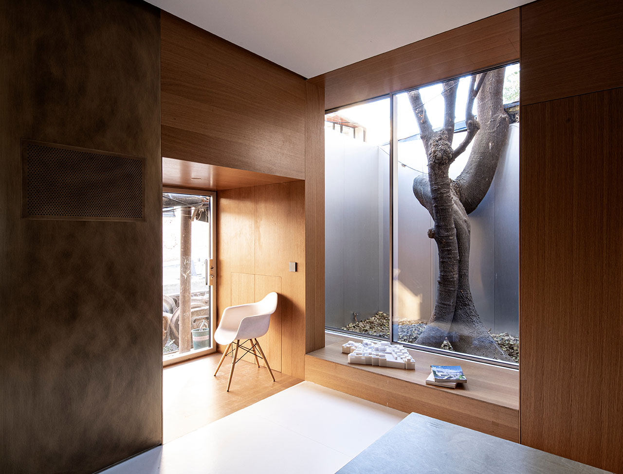 建筑挤在南北两侧建筑的缝隙之中,只能选择朝向东西开放,一楼东墙作为园区界墙必须保留。二楼东墙被彻底打开,并朝向东面设置了半户外露台,三层则在东侧设置了微型露天庭院。生长在东南角的一棵大树成为人们接触室外和自然的线索。一层依托树干拓展出一方小院,三楼则在树下做出一个外挑的阳台。通过和自然的接触,建筑更为生动,同时也为人们带来了愉悦。