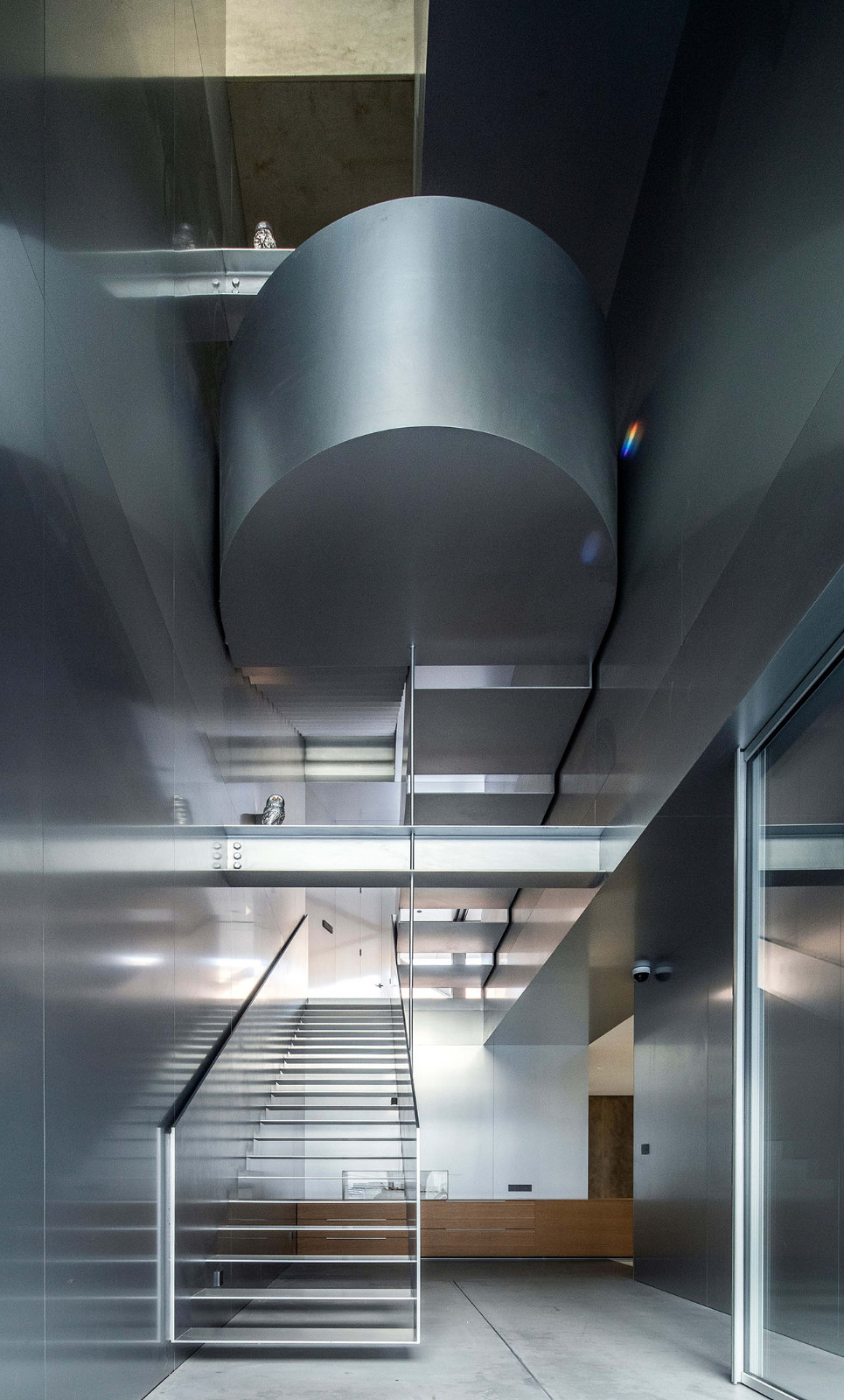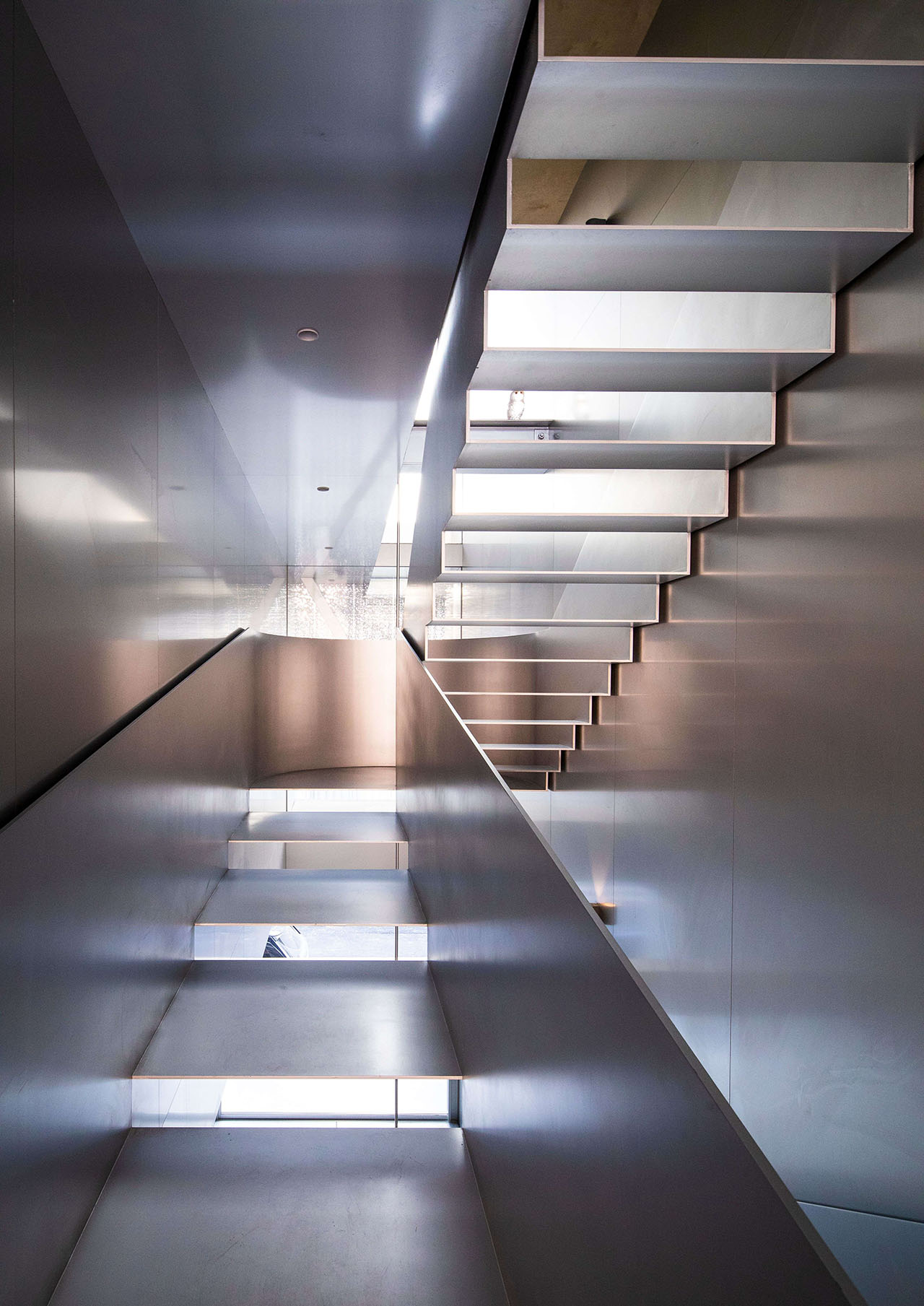建筑外墙被阳极氧化铝板包裹,有着柔和的反射性。为了避免过度日晒和同对面建筑的对视,我们对整个西侧的铝板面进行了折弯与冲孔,使建筑形体具有半透明性。