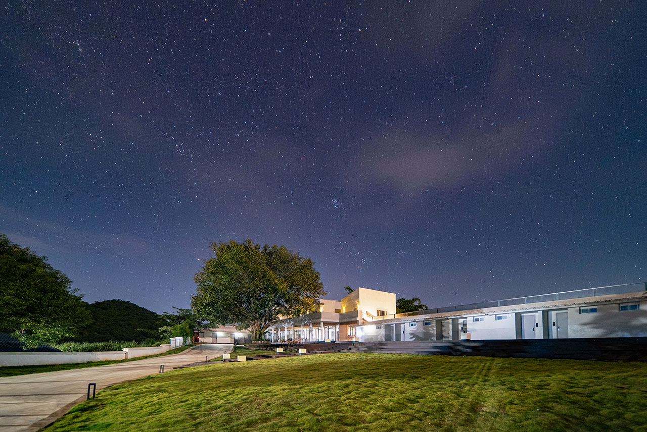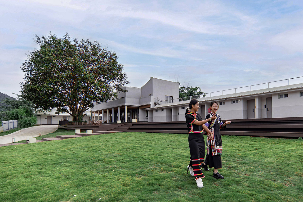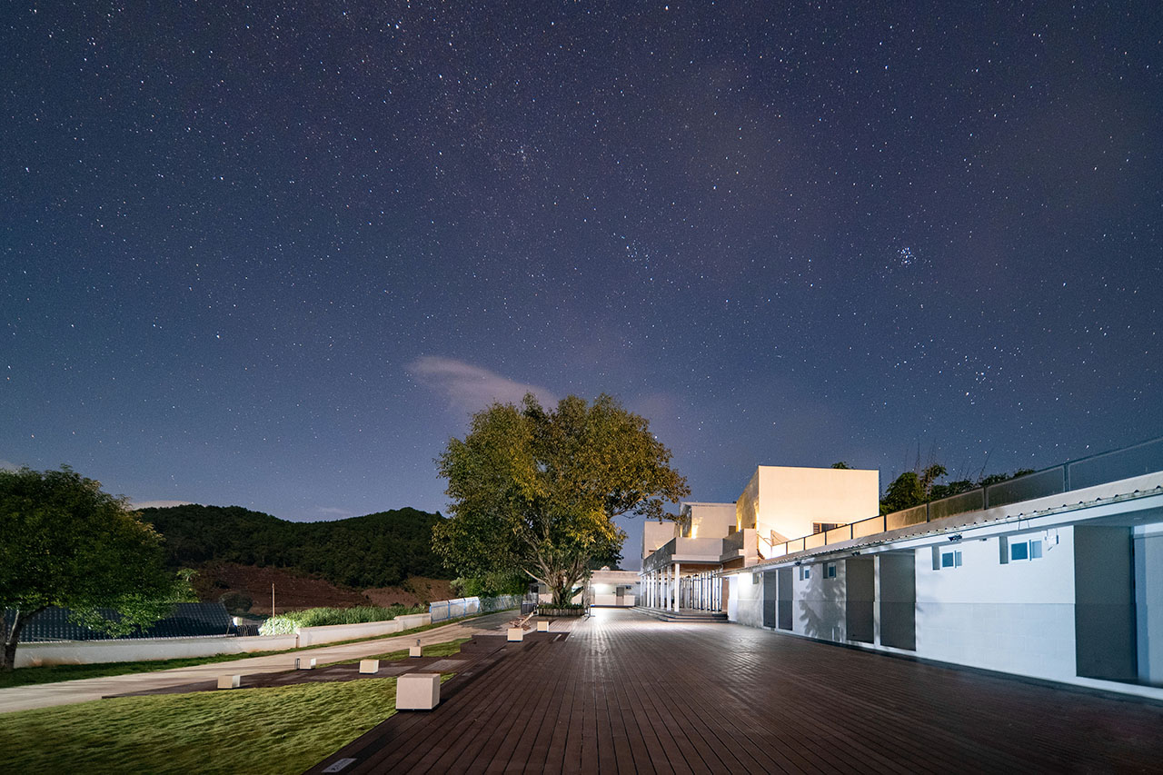 在院落整体布局方面,我们对院落的景观布局进行调整,保留一定程度的运营灵活性。我们希望场地内预留出的木质活动平台与休闲草坪能够容纳更多的社区活动,使得众多研学学子更好地融入到当地居民社区生活中。值得一提的是,在项目建设中,或许是出于某个灵光一现的念头,原本分离的客厅与小学宿舍被一座钢结构玻璃楼梯连接起来,通过对小学宿舍屋顶的利用增添了院落的活动空间,增加了社区活动中院落的观赏空间,人、乡村、自然在这一刻得以融合,这才实现了农村社区的共建共享,得以一同拥抱的自然馈赠。