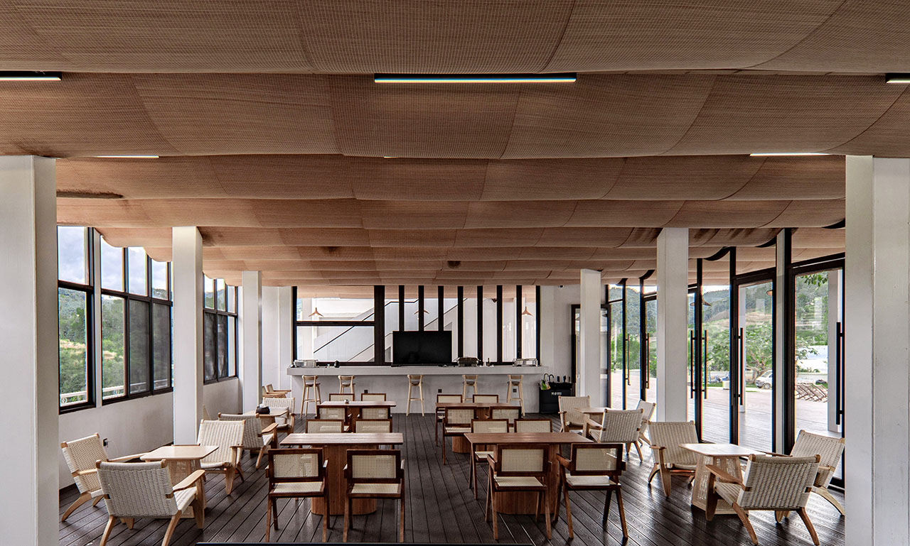 项目设计中,我们通过咖啡吧与游廊之间连接形成的咖啡吧内部形成洄游流线,增加了空间内多角度体验的可能性。我们以此将咖啡吧室内钢柱,配合竹编悬挂式吊顶,在东西向界面形成的层叠弧线与游廊的吧台空间形成独特的框景效果,而在南北向界面中则呈现出连续弧线与平台的直线相互调和,构建出人、院落与自然景观的之间的视线引导。