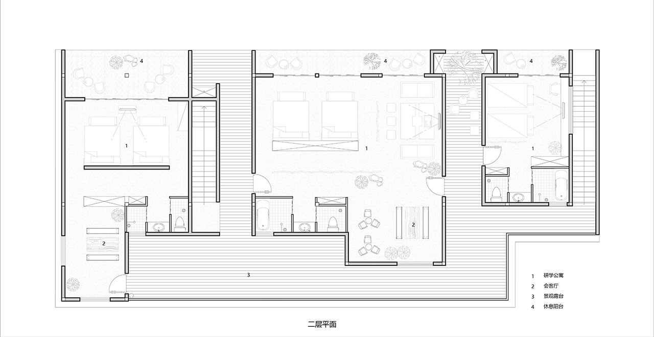 在二层民宿空间的设计中,通过平台的构建与群落体量的间隙提供人在二层空间中流动的可能性,这样的调整使得人在村落中的步行游走体验被移植到二层空间,同时在这游走过程中与庭院古树形成的交互,让人得到了一种与自然在不同高度相接触的独特体验。