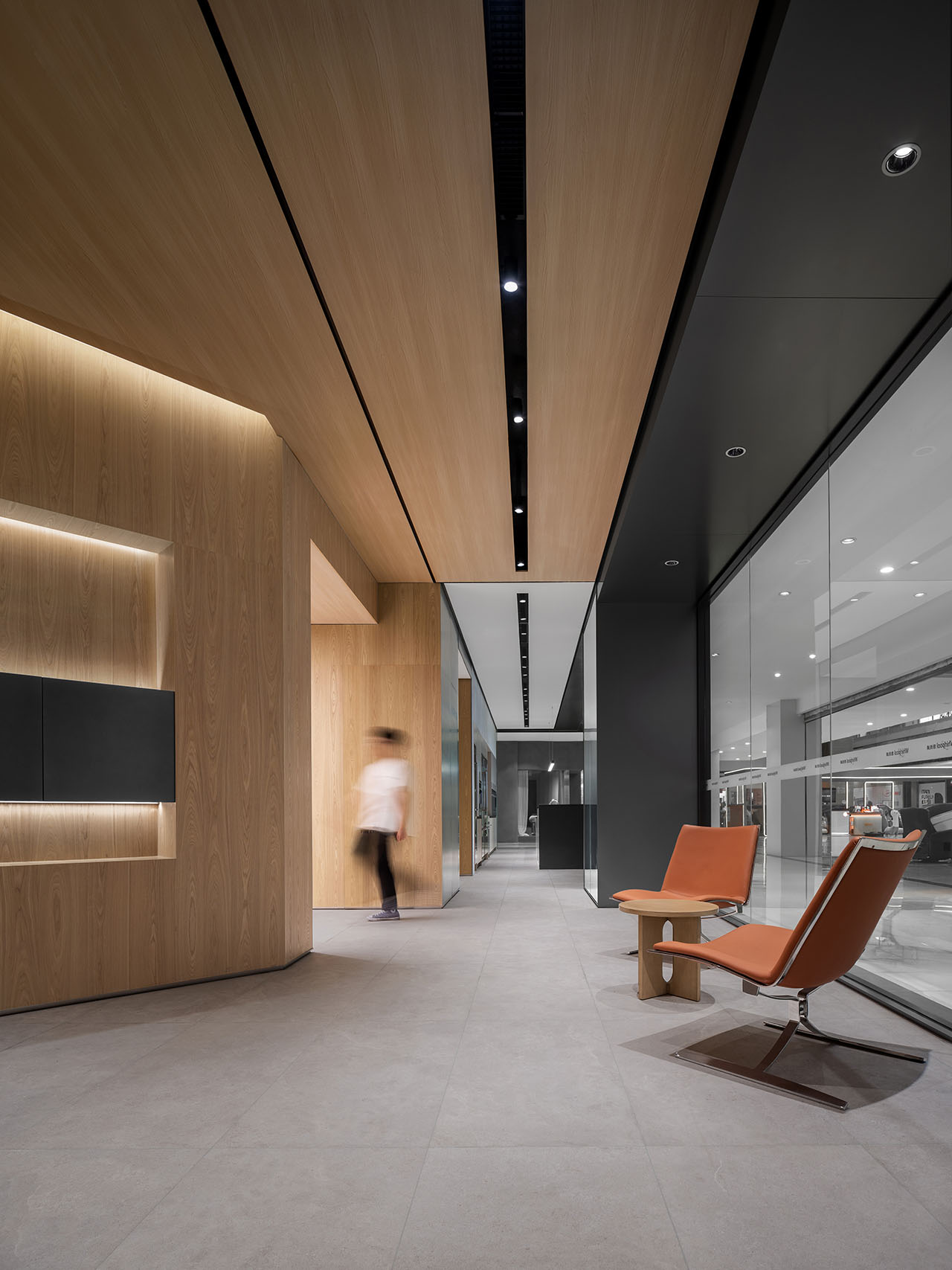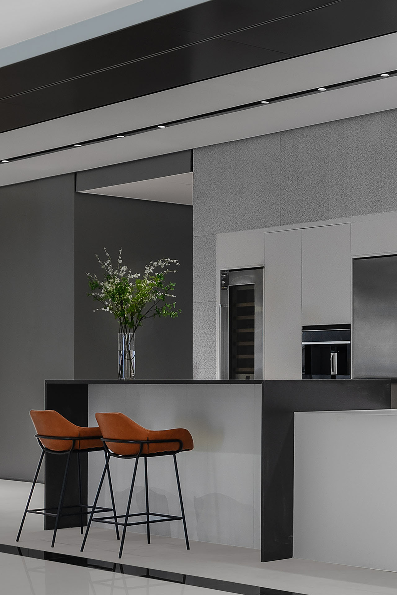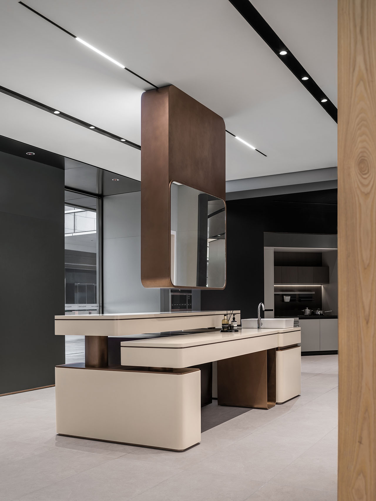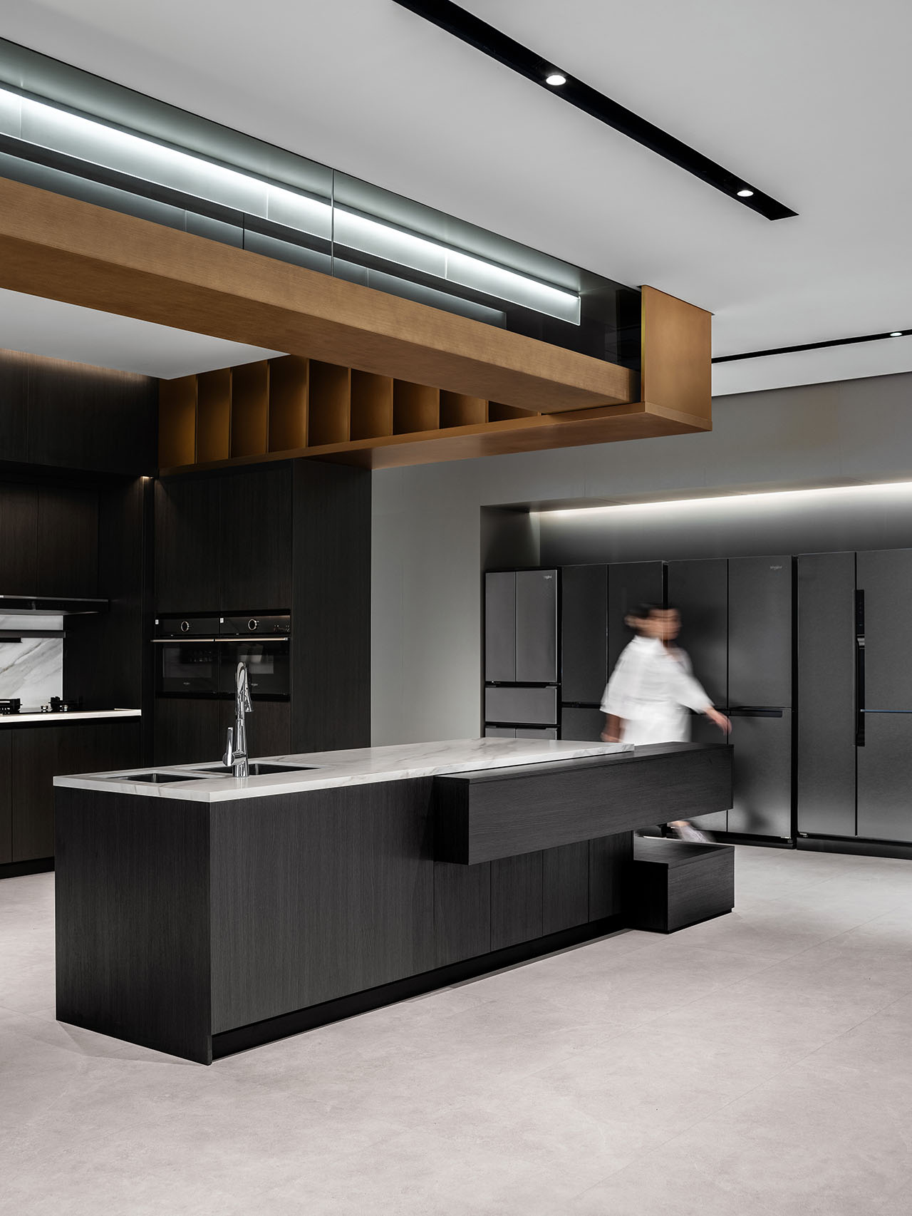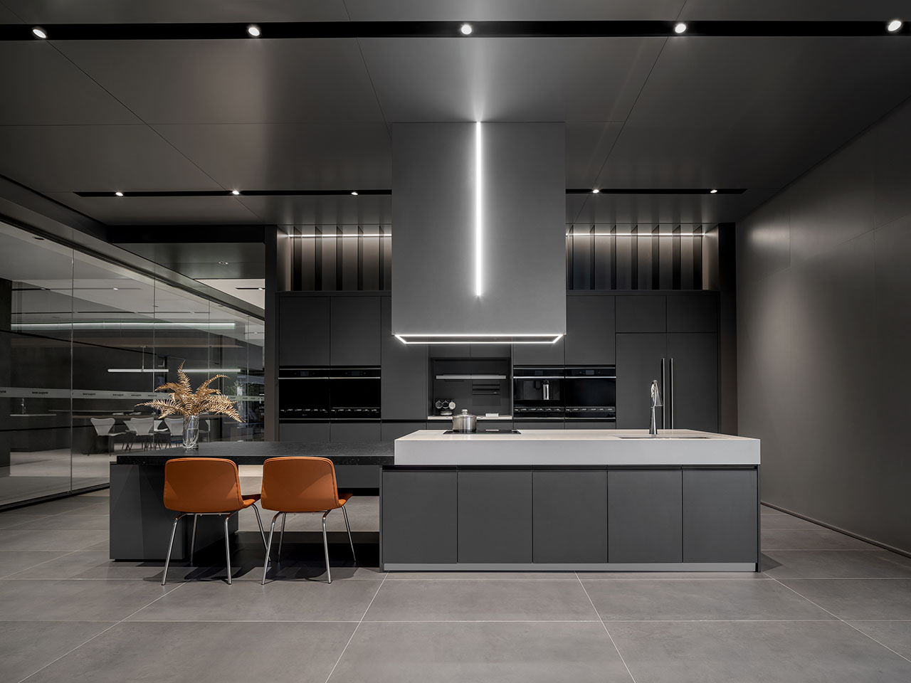 展厅设计厨电区域以极简主义为基调,冷静的黑、白、灰勾勒出色彩基调,金属和玻璃则点亮了空间的质感。