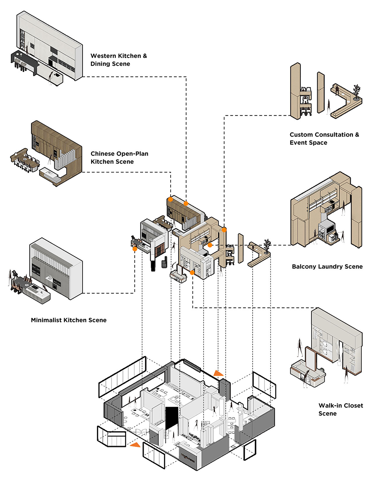 灵感和创新,是对未来生活方式的展望。在本项目中,我们的目标不仅限于产品和生活场景的展示,结合品牌的创新模块,我们在空间中规划了定制服务区,用户不仅仅可以采购产品,也可以在店内定制与之匹配的全套柜体。