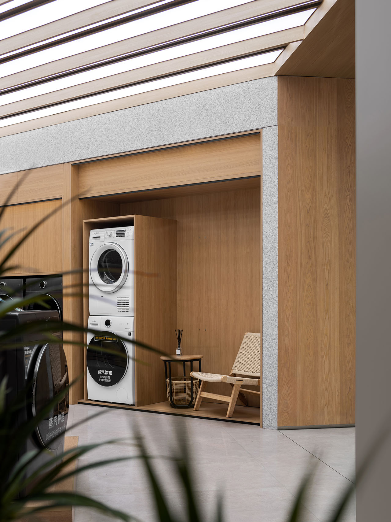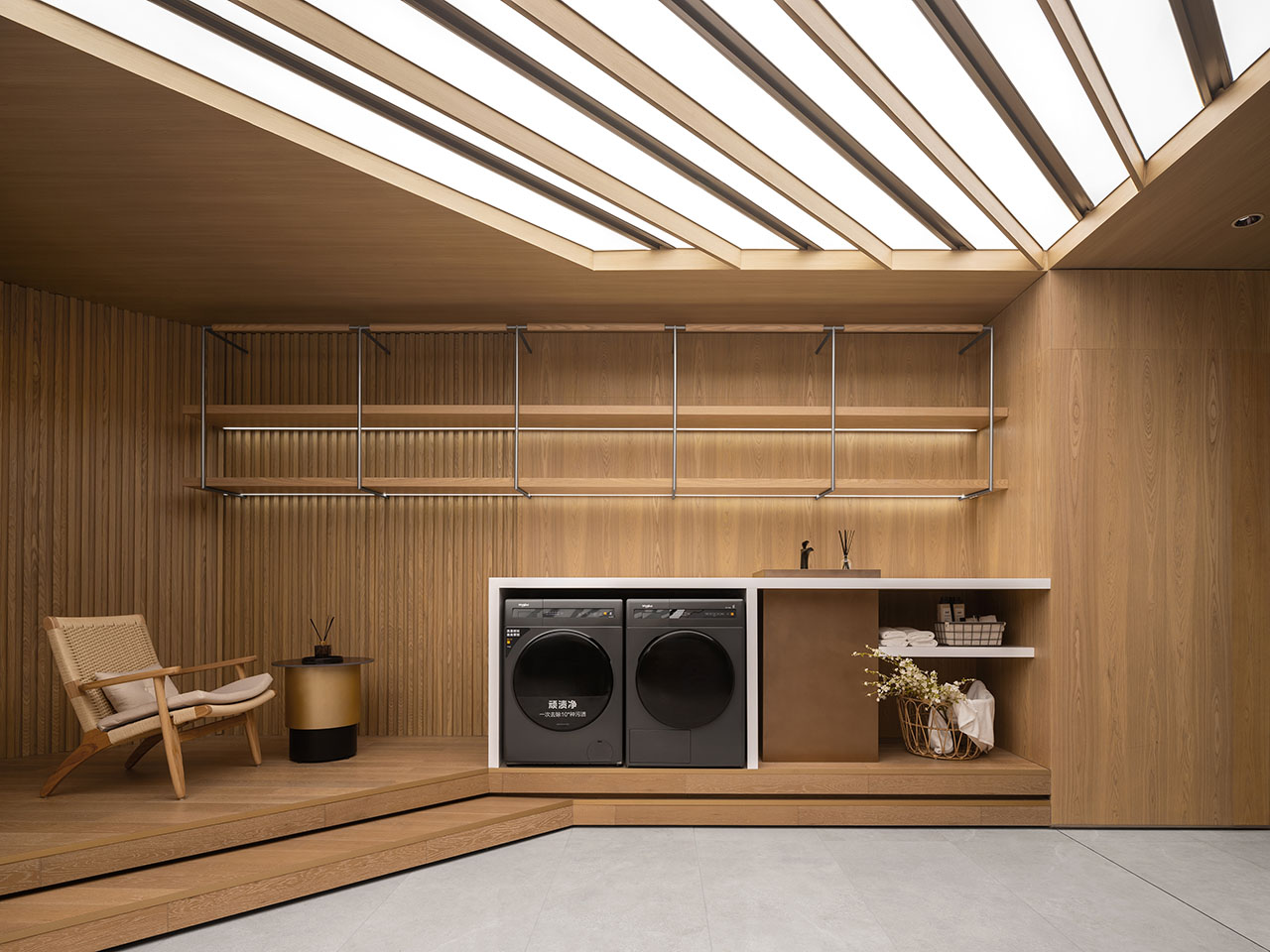设计师将洗烘产品及衣物护理设备的融合到衣帽间的场景中,使家电产品在不同生活情境中自然转换角色。