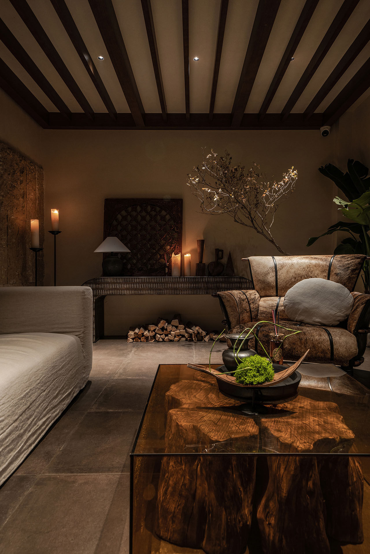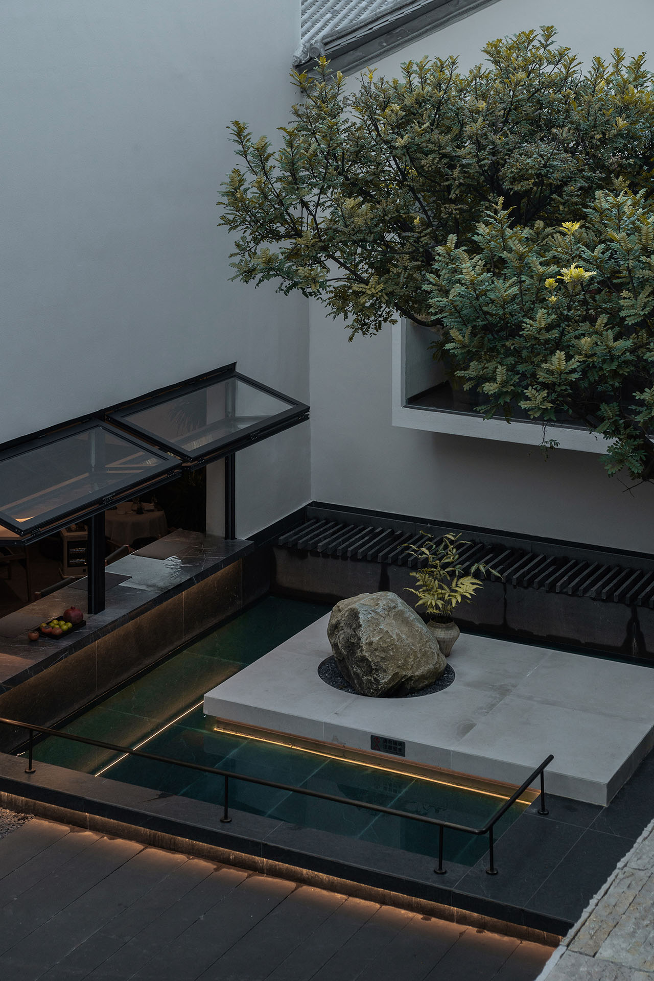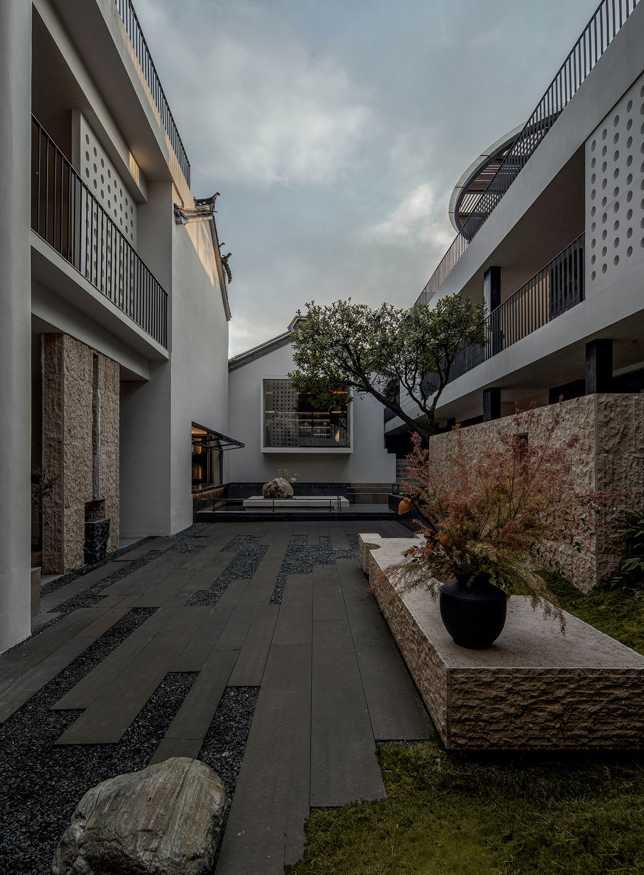 二层北面,正对茶室和内院花园的位置,我们设了一个休闲区。没有把它做成需要测算商业回报的功利空间,而是像从前大理古城里随处可见的石凳、水景、歇脚处一样,起到调节冗长走廊的作用。人可以随意进出,小坐、阅读、茶,或者围炉夜话。