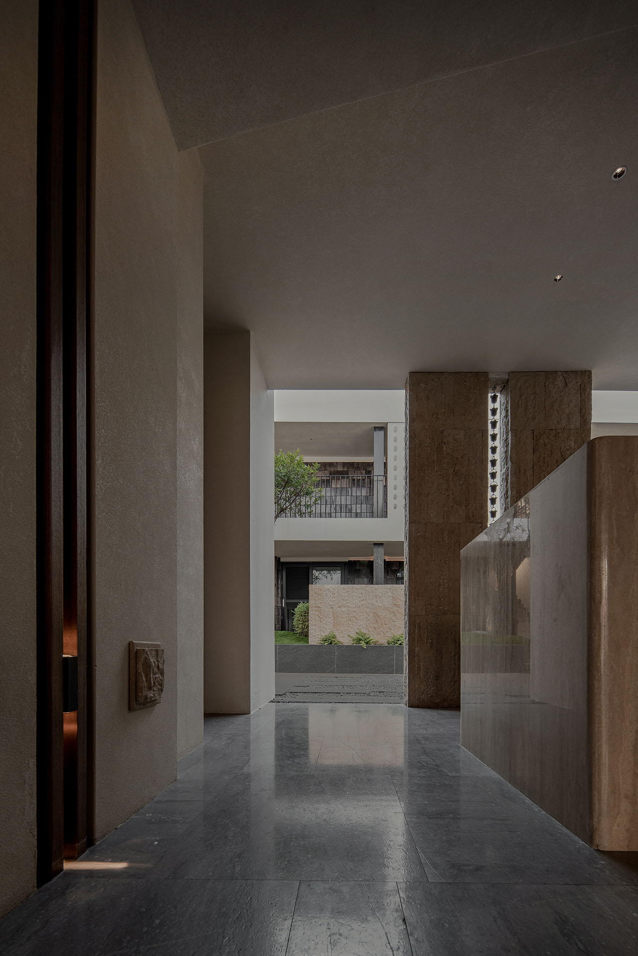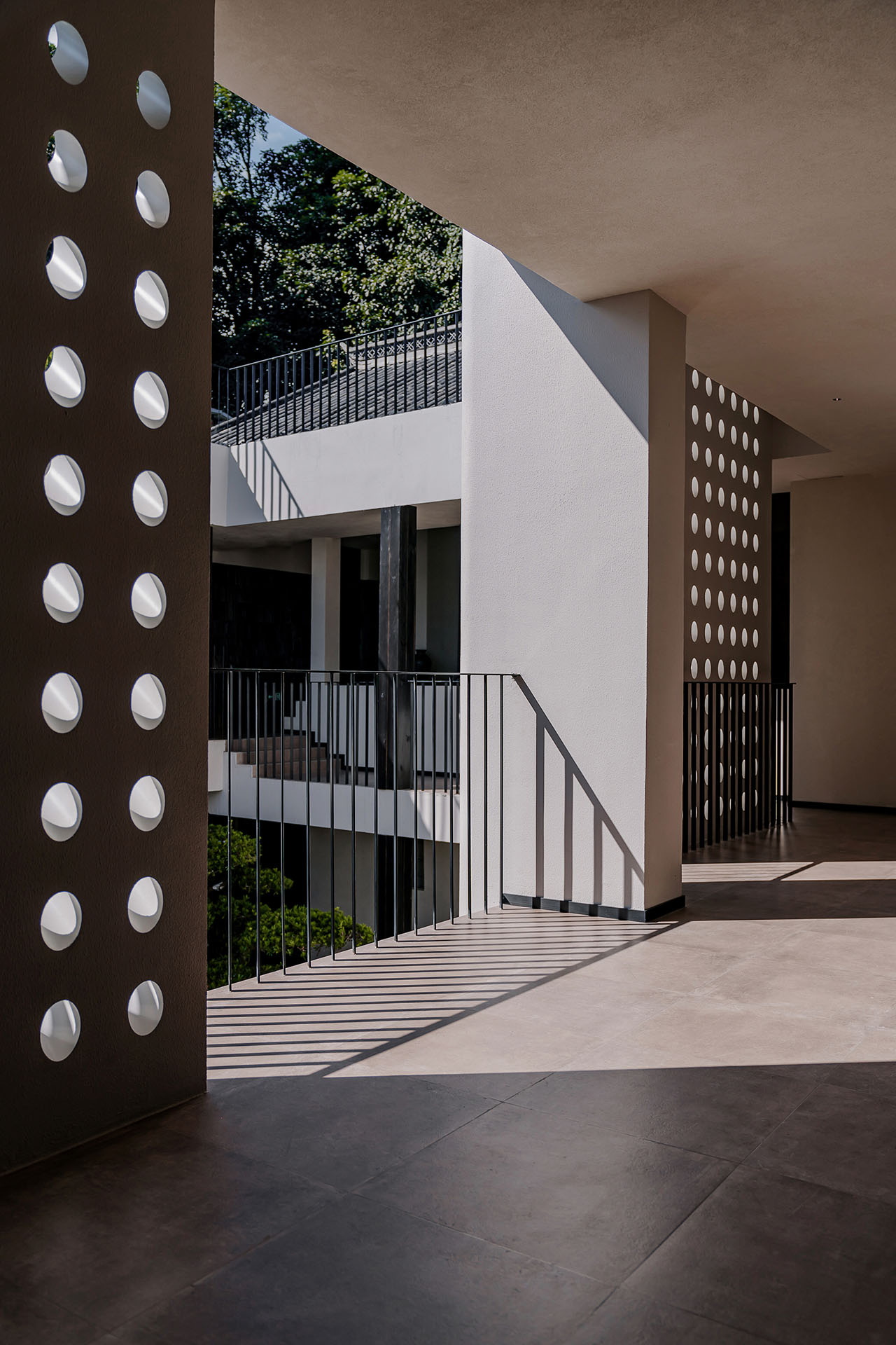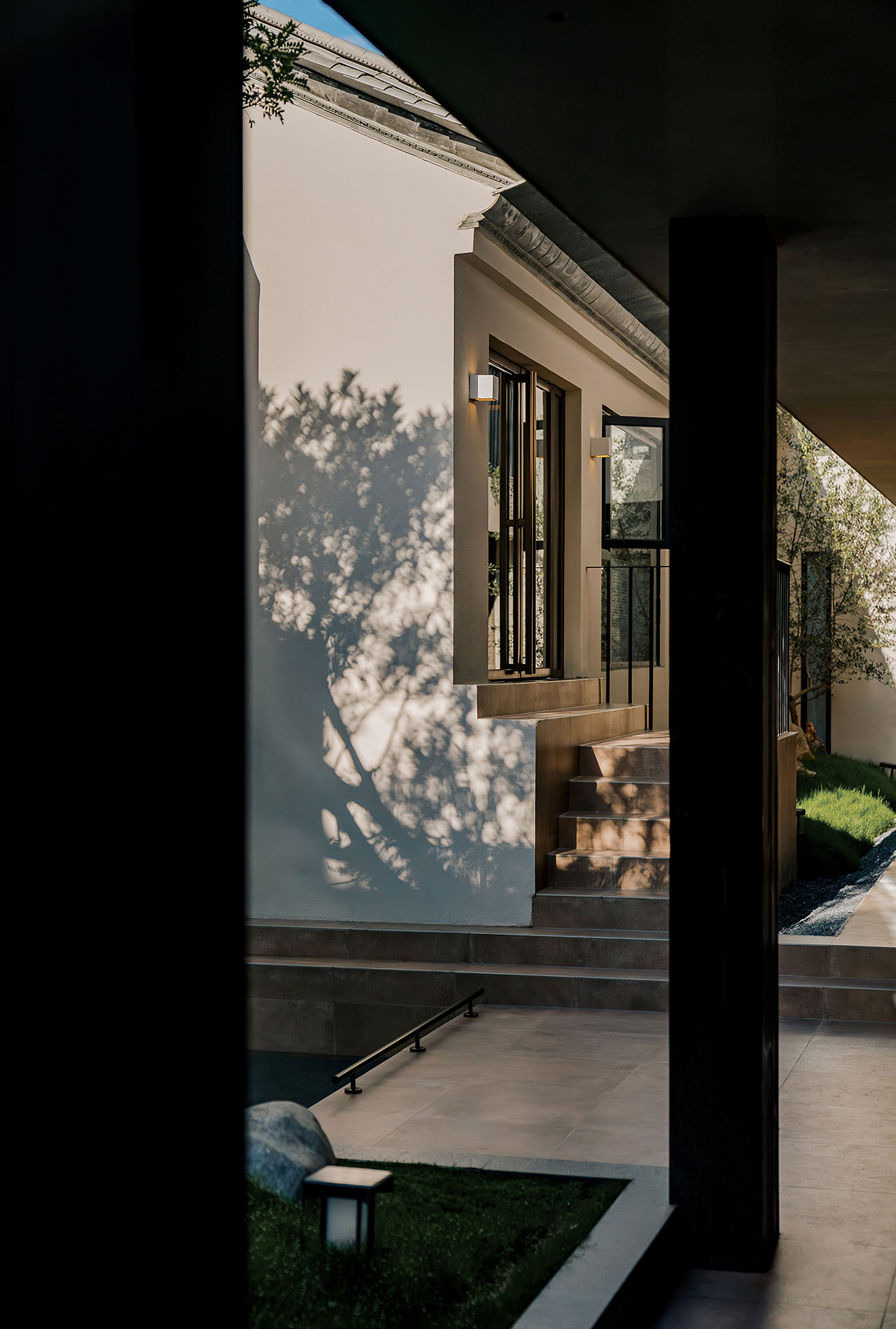 串联起这些散乱的房子,成了首先要解决的问题。我们设计了一座“游廊”——一、二层的观景廊桥,连通每一栋楼,同时兼具遮雨功能。各栋楼地面的高差,用最简单的踏步过渡,廊桥也随之有了错落的节奏。客人在游走的过程中,用脚步丈量庭院,体验内院的层次感。带椭圆洞口的片墙,为空间带来了屏风式的隔断作用,同时也成为了收集光线的容器,光影投射、隔断与节奏的变化为室内带来微妙、丰富细腻的光影变化。