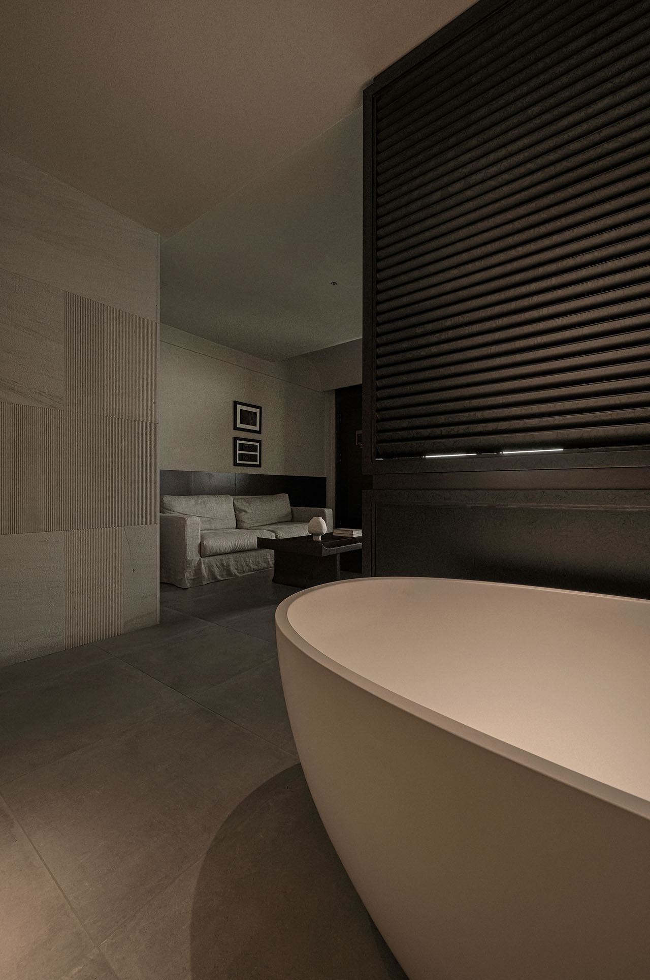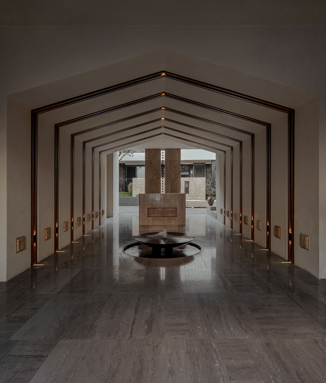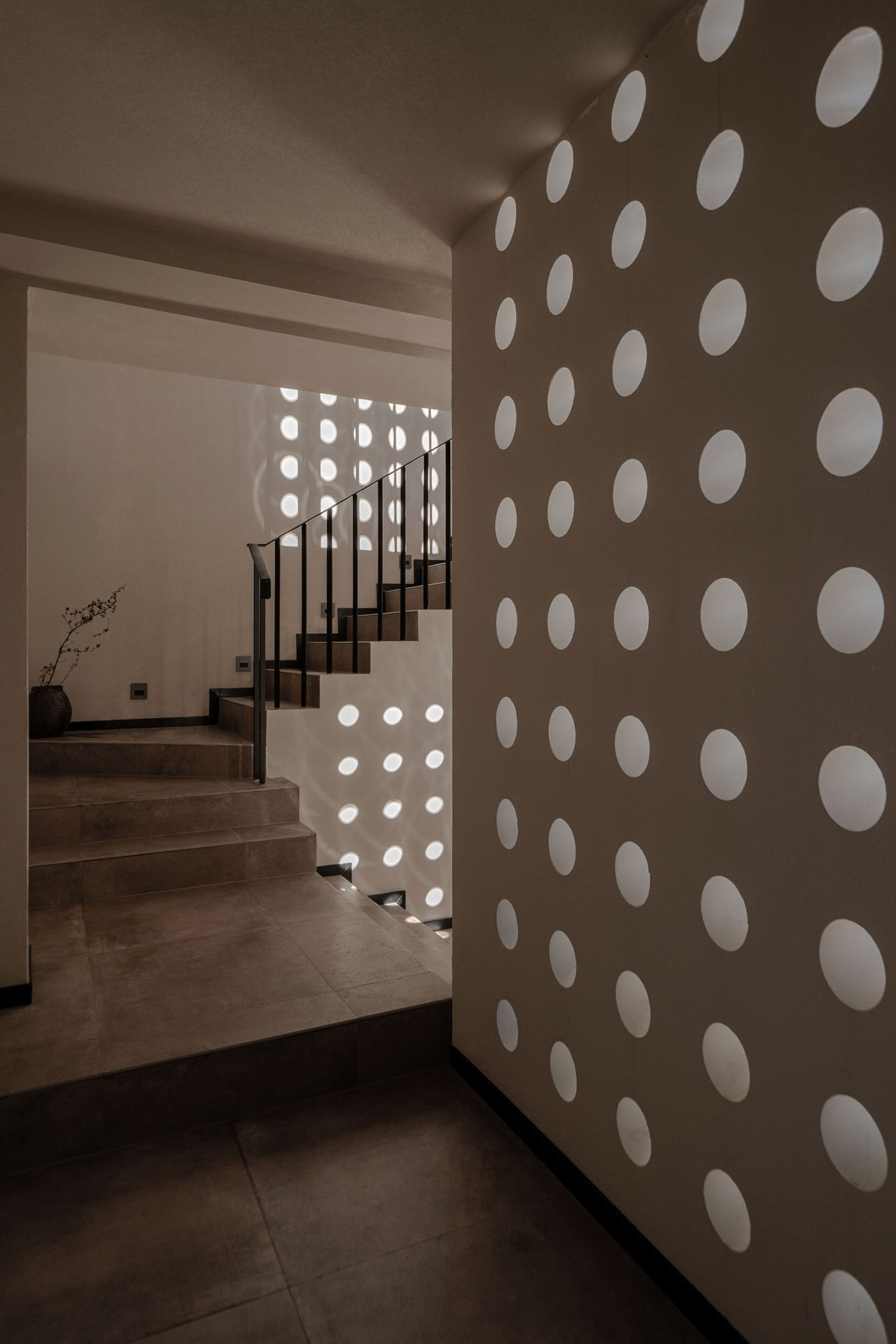 串联起这些散乱的房子,成了首先要解决的问题。我们设计了一座“游廊”——一、二层的观景廊桥,连通每一栋楼,同时兼具遮雨功能。各栋楼地面的高差,用最简单的踏步过渡,廊桥也随之有了错落的节奏。客人在游走的过程中,用脚步丈量庭院,体验内院的层次感。带椭圆洞口的片墙,为空间带来了屏风式的隔断作用,同时也成为了收集光线的容器,光影投射、隔断与节奏的变化为室内带来微妙、丰富细腻的光影变化。