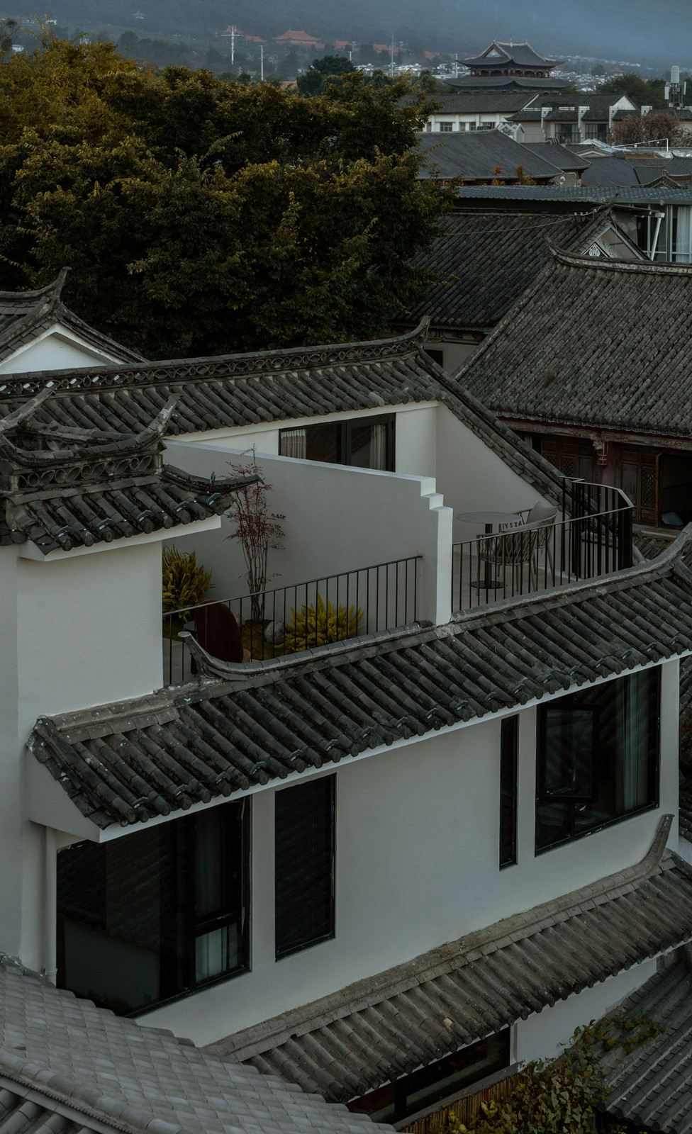 穿过“游廊”,沿楼梯上到屋顶。庆幸的是,尽管整个酒店除了大门,几乎被三面围合,但原先那两栋类似宿舍的主要建筑,留下了平整的屋顶。我们自然而然打起了这片平顶的主意。西面正对古城里那两棵有名的“夫妻树”,再远些,是苍山;东面是洱海。站在屋顶,整个古城的青瓦屋顶错落有致地铺展在眼前。苍山、屋顶、洱海,就这样成了酒店独有的景观。于是我们在屋顶设了吧台、书吧、观景台,成了客人观景、喝咖啡的好去处——在封闭的庭院里,算找到一个通往开阔的出口。