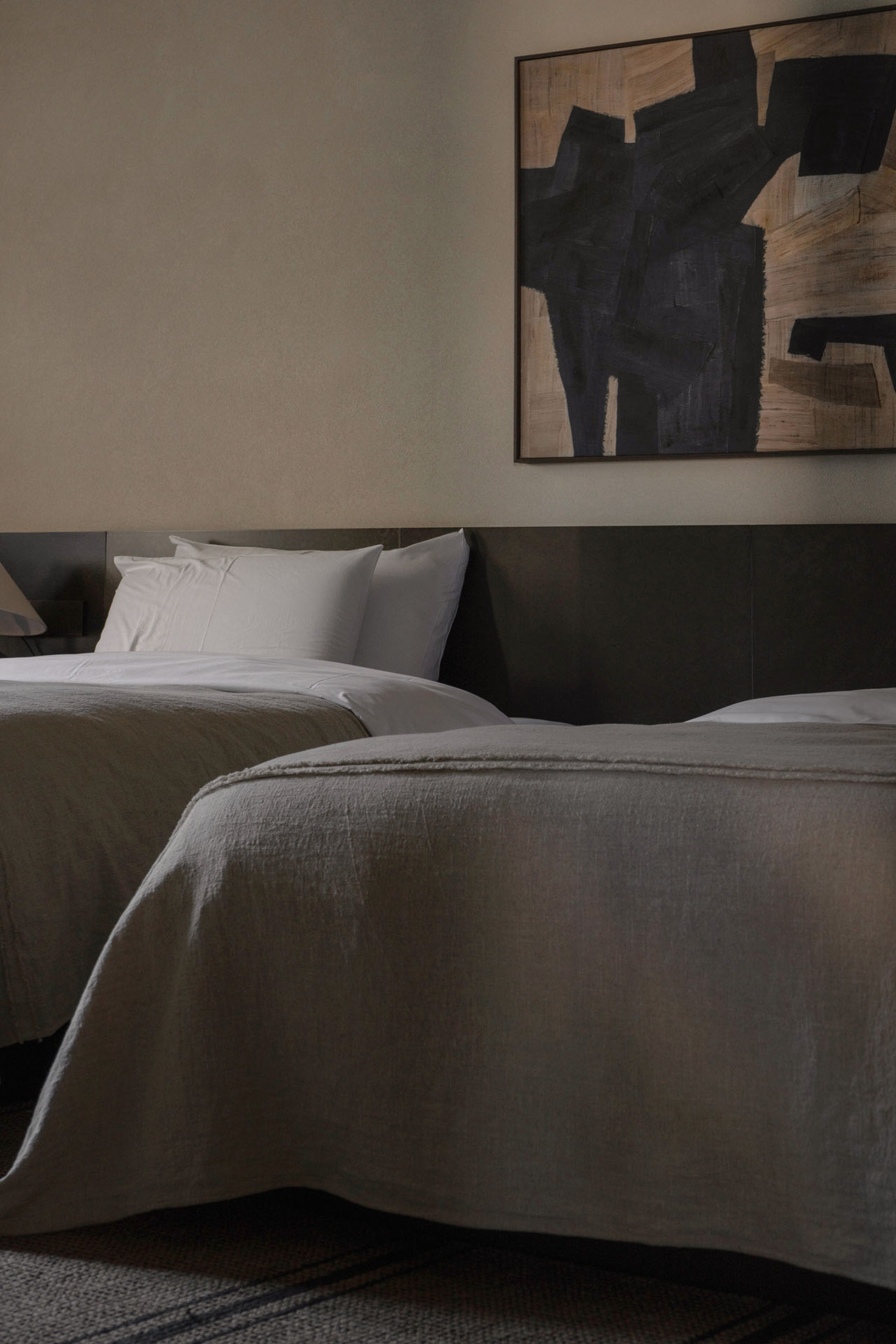 前面讲过,这是由七栋不同功能的房子组合的庭院酒店,结构的改造是必不可少的,当然限制也很多。原先普遍3.5米乘4.5米的房间,自然不能满足客房的使用需求。我们通过重新合并、调整,形成了套房、标准房、亲子房等几种房型。房间虽不能说非常差大,但通过门厅的设置、简洁的布置、合理的分隔,也算达到了预想的效果。我们更在意的是,客人能在这里体会到一种静谧、自在、闲适的大理古城院子生活。