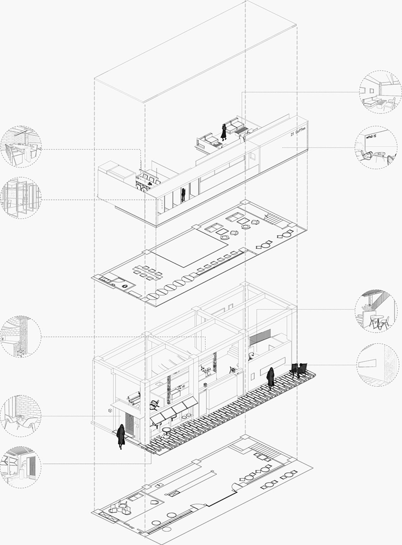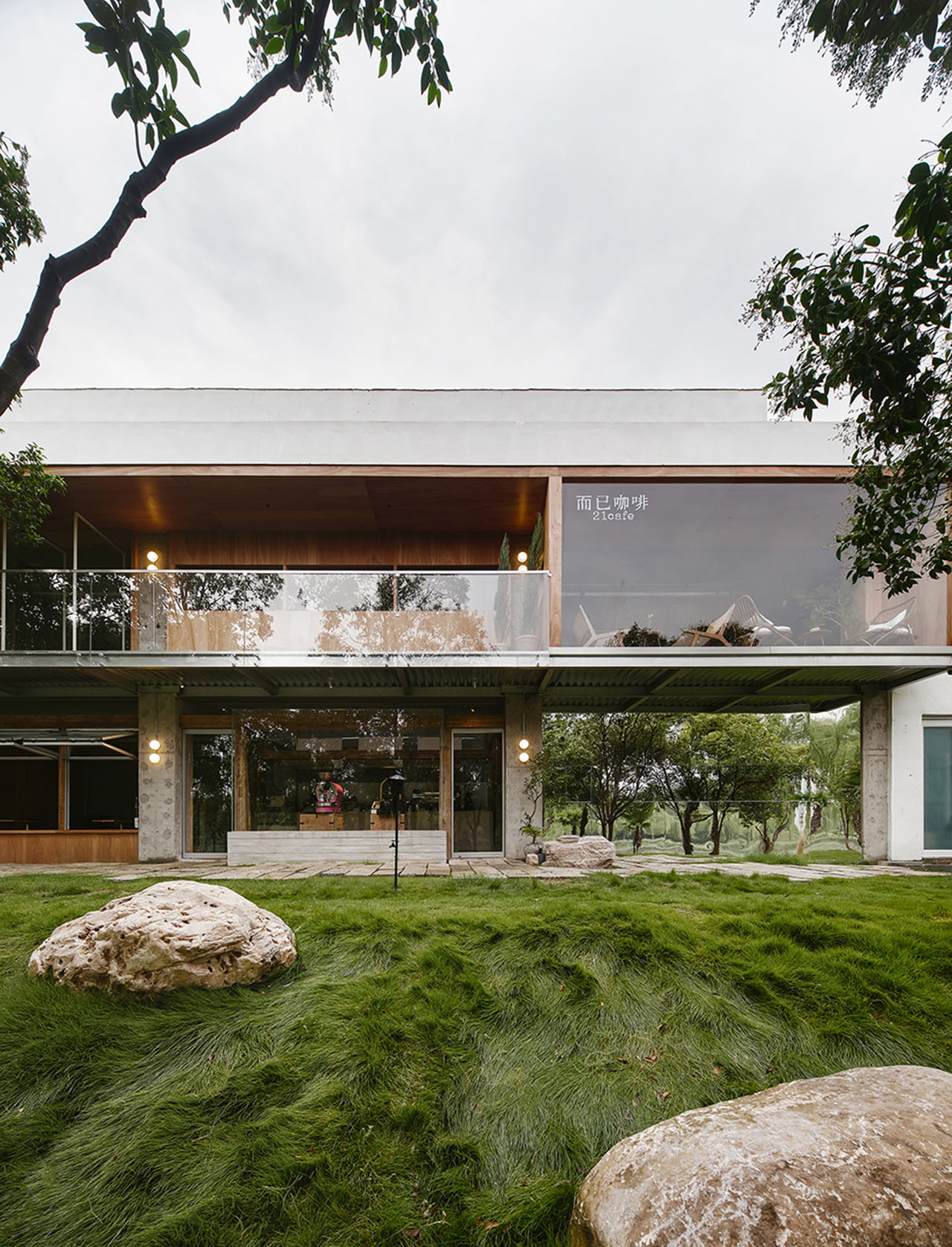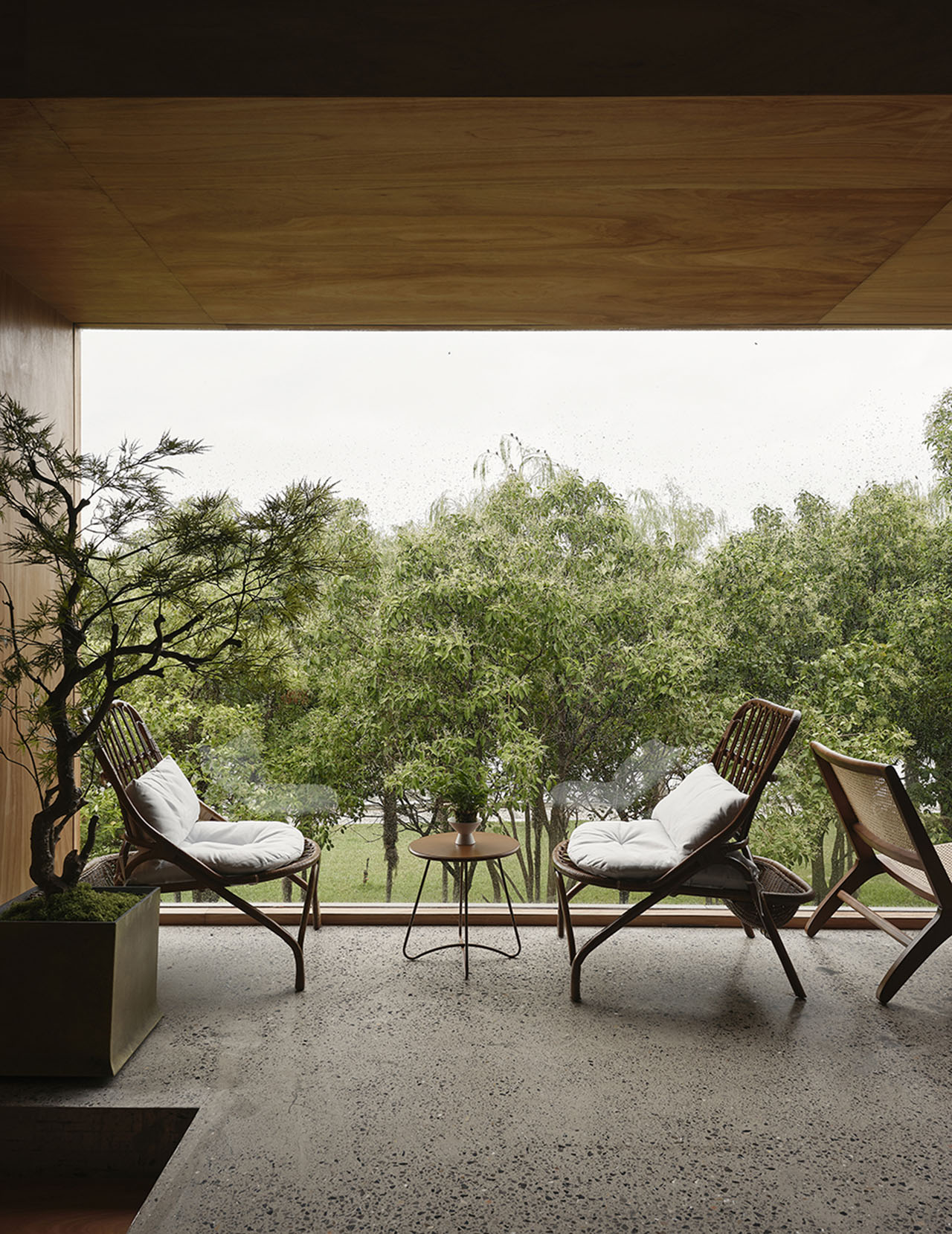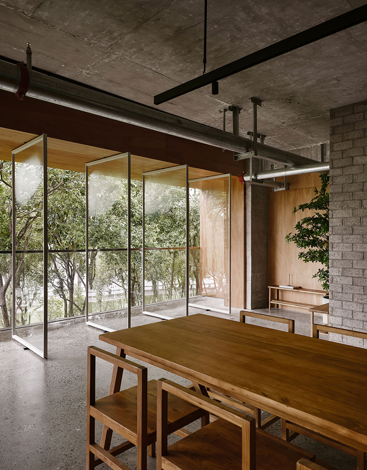 在整体空间,设计师通过构建窗景、弱化环境背景等方式,来捕捉人们对自然的关注。空间裸露混凝土的硬朗背景 ,更加凸显出木质的温度感,提示着人们去看见窗外流动的风景,枝桠摇曳,光影斑驳...