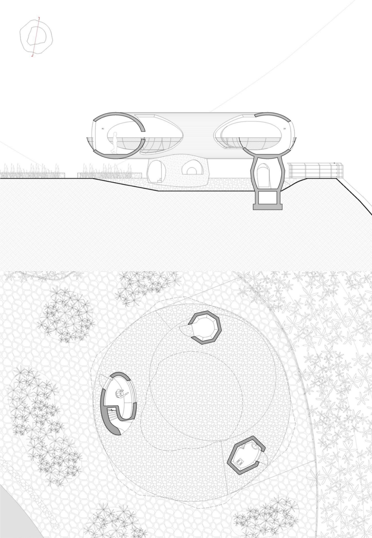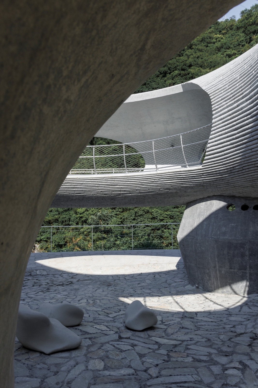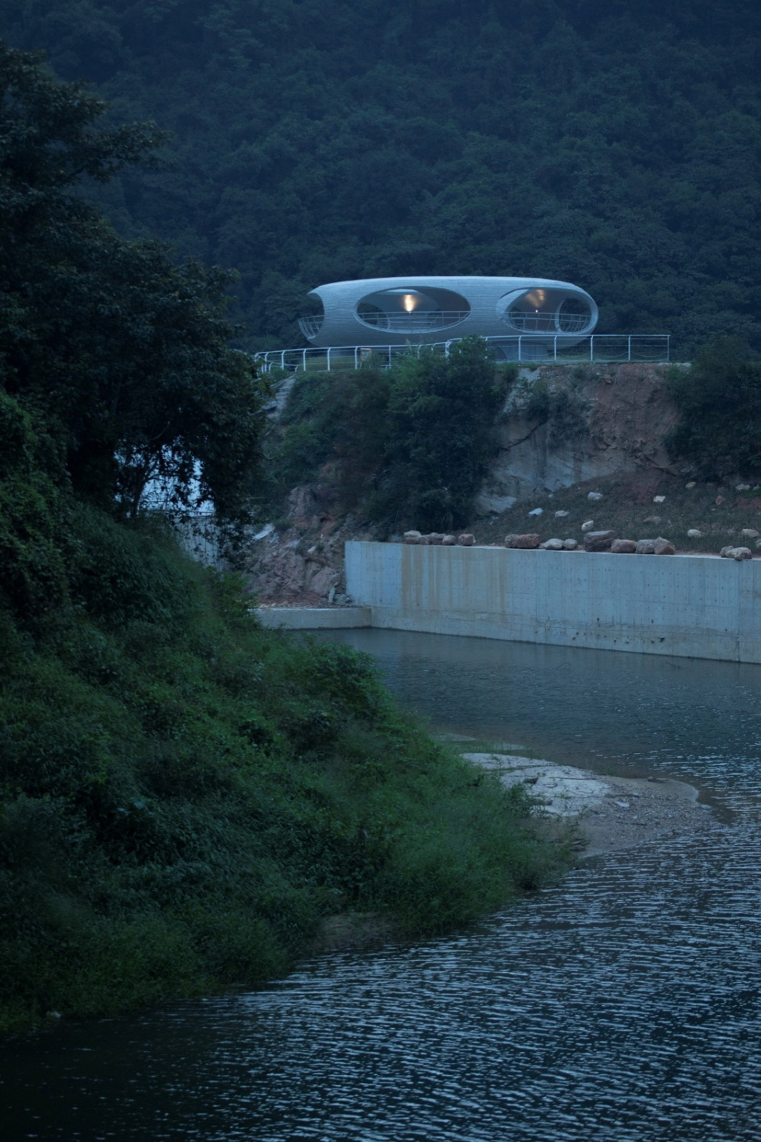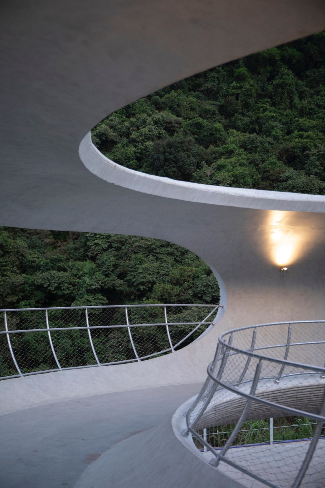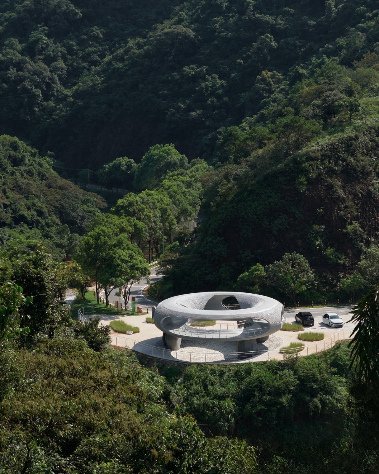 观景平台为外径16米的甜甜圈,在多个方位被竖直面切割,形成望向不同景致的卵形切口。切口环环嵌套。行走环上,可望天观水,与青山相望。画面层叠,意境深远...
