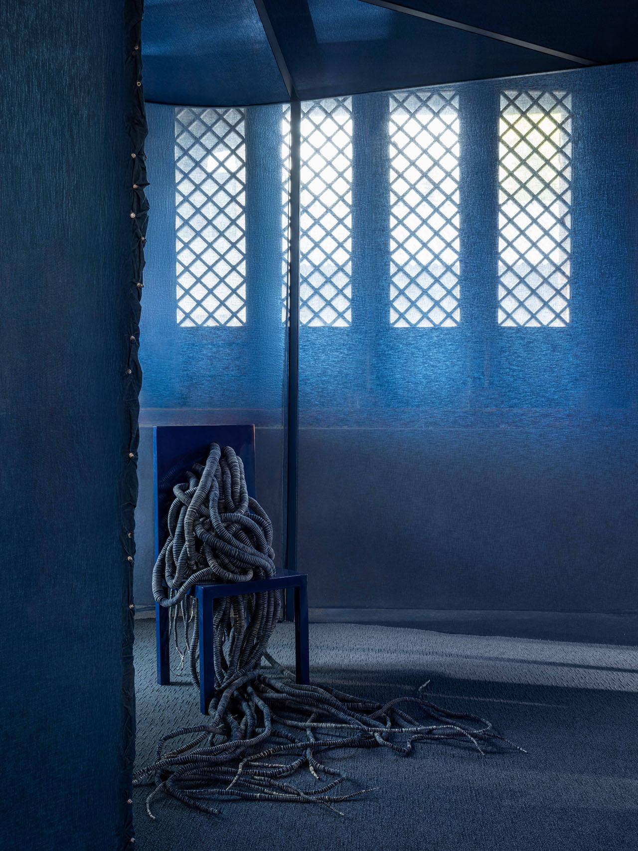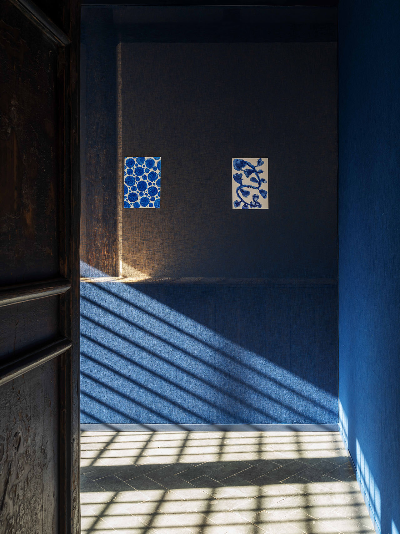 侧面一间厢房被扎染技艺启发,水池和墙面均被打造成了靛蓝色,还原扎染工艺的制作氛围,扎染的精髓融入环境之中。SKYnoa 设计的声音与纺织装置悬吊在染缸水面之上,缠绕曲折的纤维织造有如声音的波形,无声揭示了传统工艺中蕴含的历史,与墙上林芳璐的灵感手稿和介绍共同开启了这趟感官旅程。