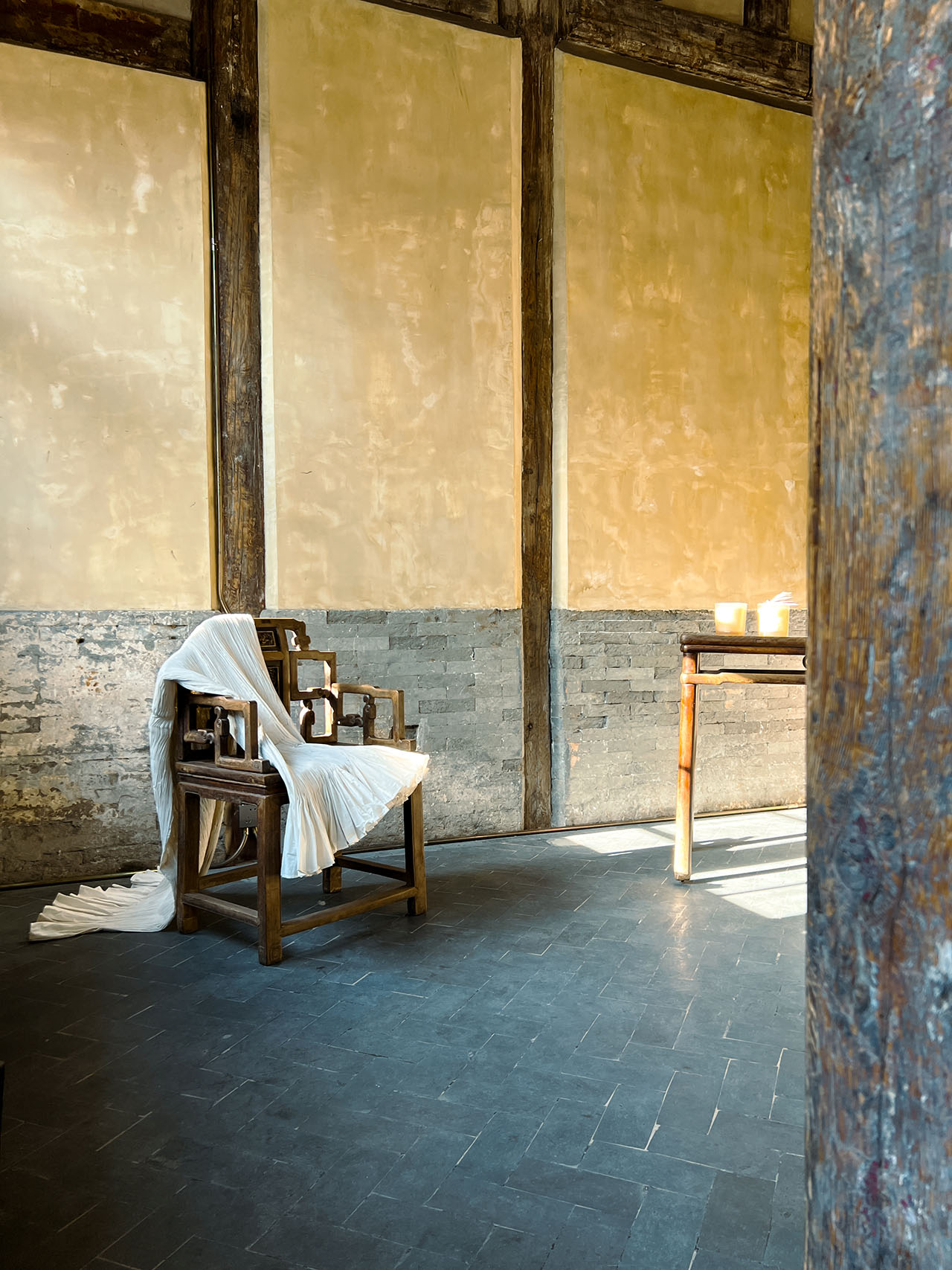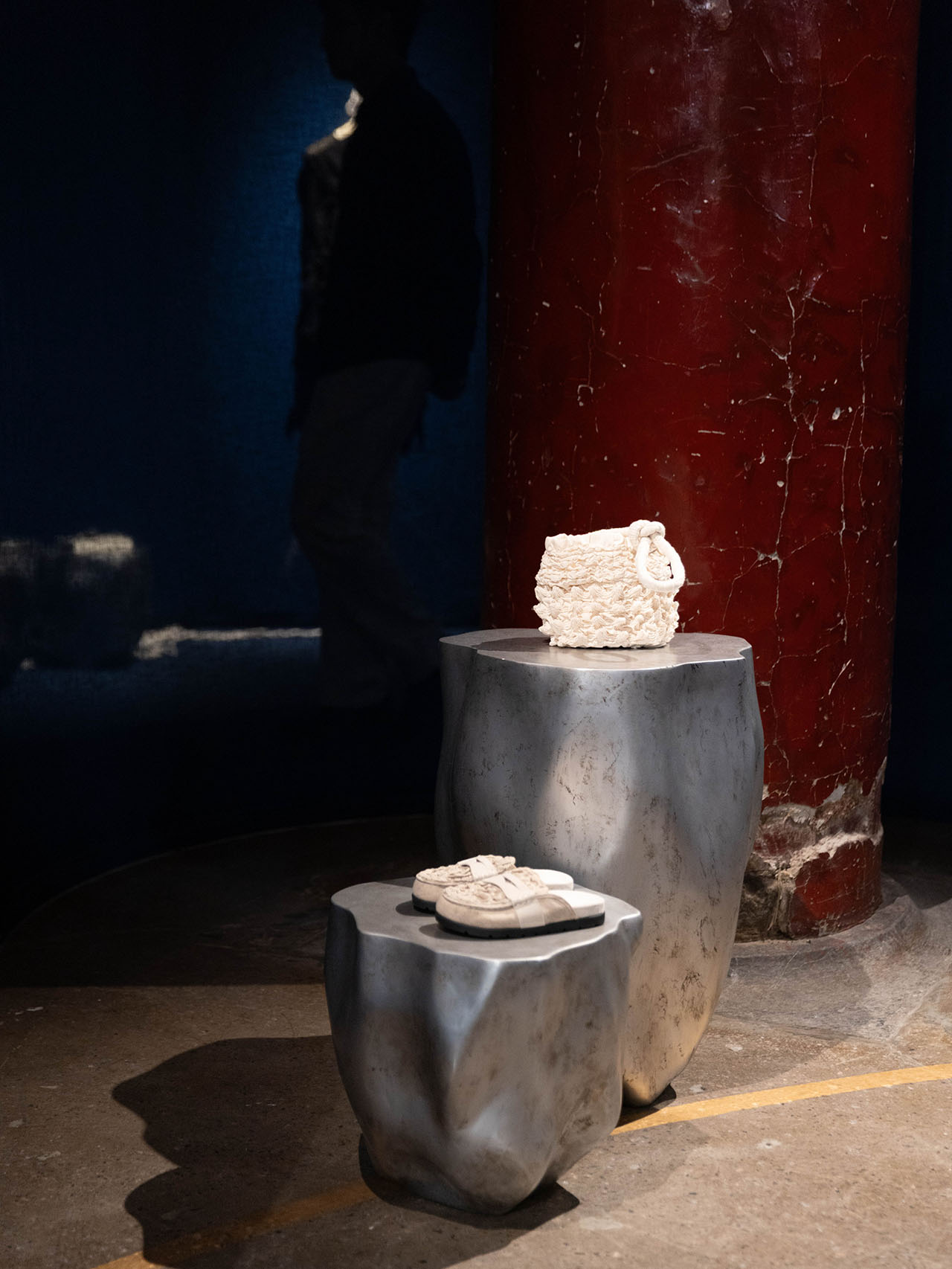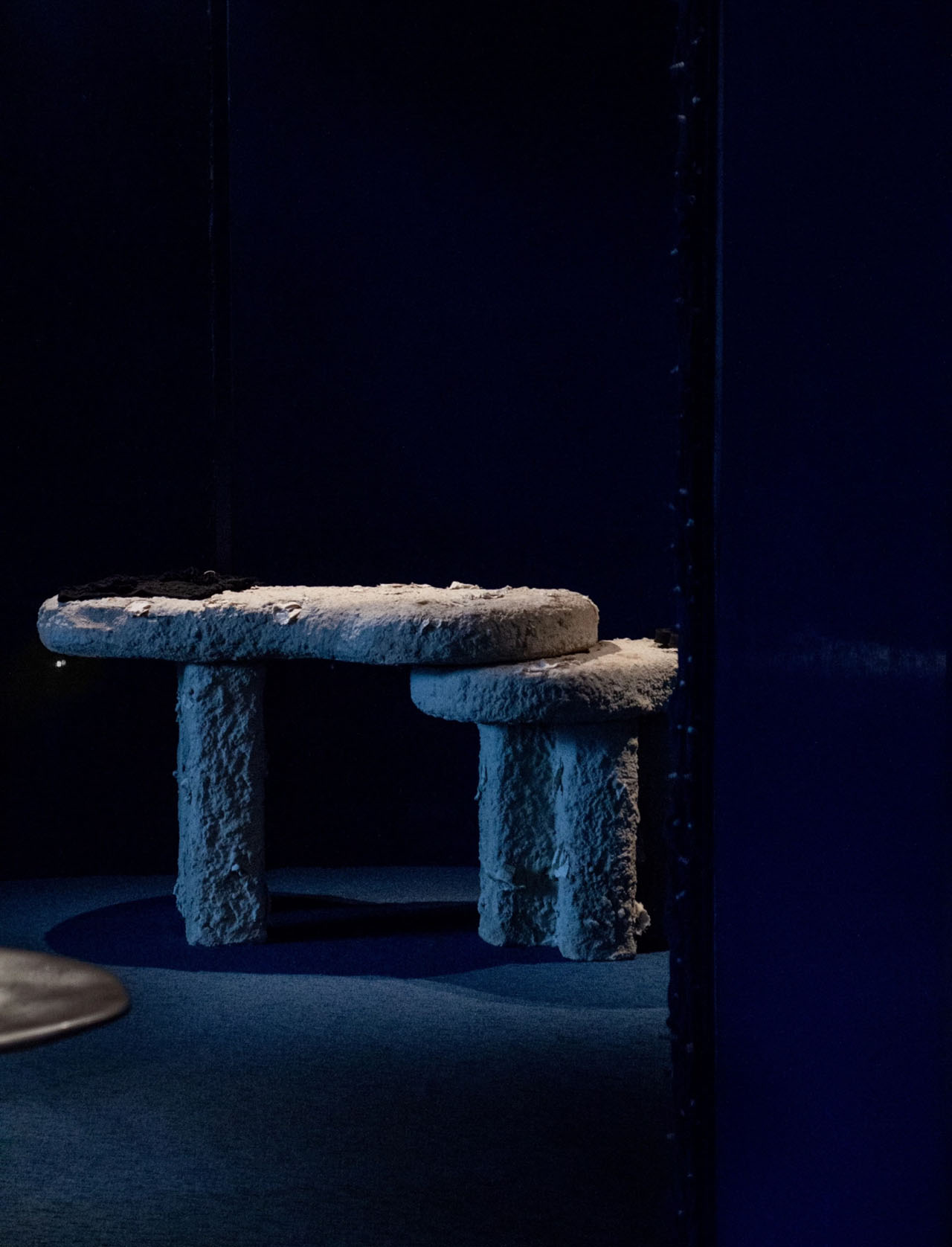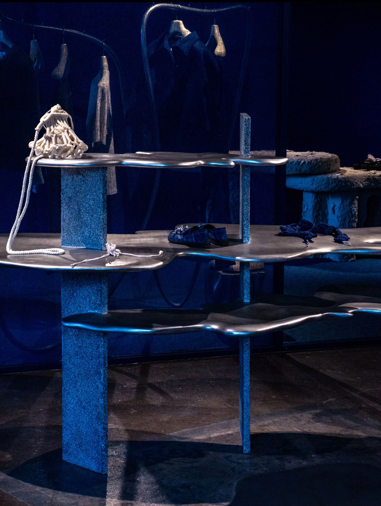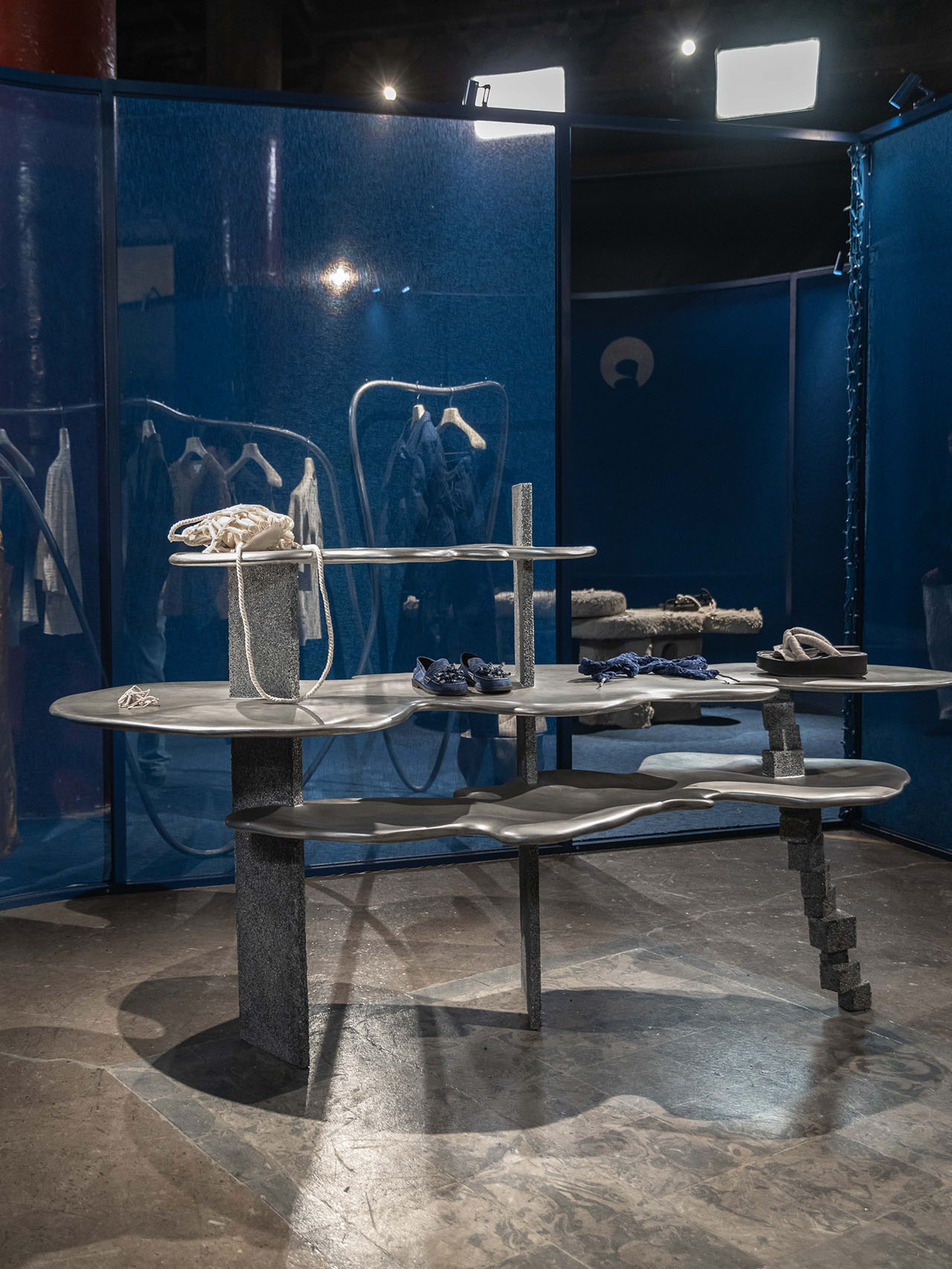 设计师凭借看似简单的织物改变了建筑、空间和人的关系,打造出不动声色的故事氛围,供人穿越、回望、驻足。寺庙仍在,但被柔化为更为温和的背景。织物墙宛如画布,不仅承托着空间氛围,也成为展示系列关键作品的舞台。家具设计以传统材质为灵感,呈现全新形态。衣架以有机形态流动,柔化空间的几何结构。桌子由手工工艺铸造,融合混凝土与布料纹理,呼应材质之美,也强化对手工技艺的致敬。