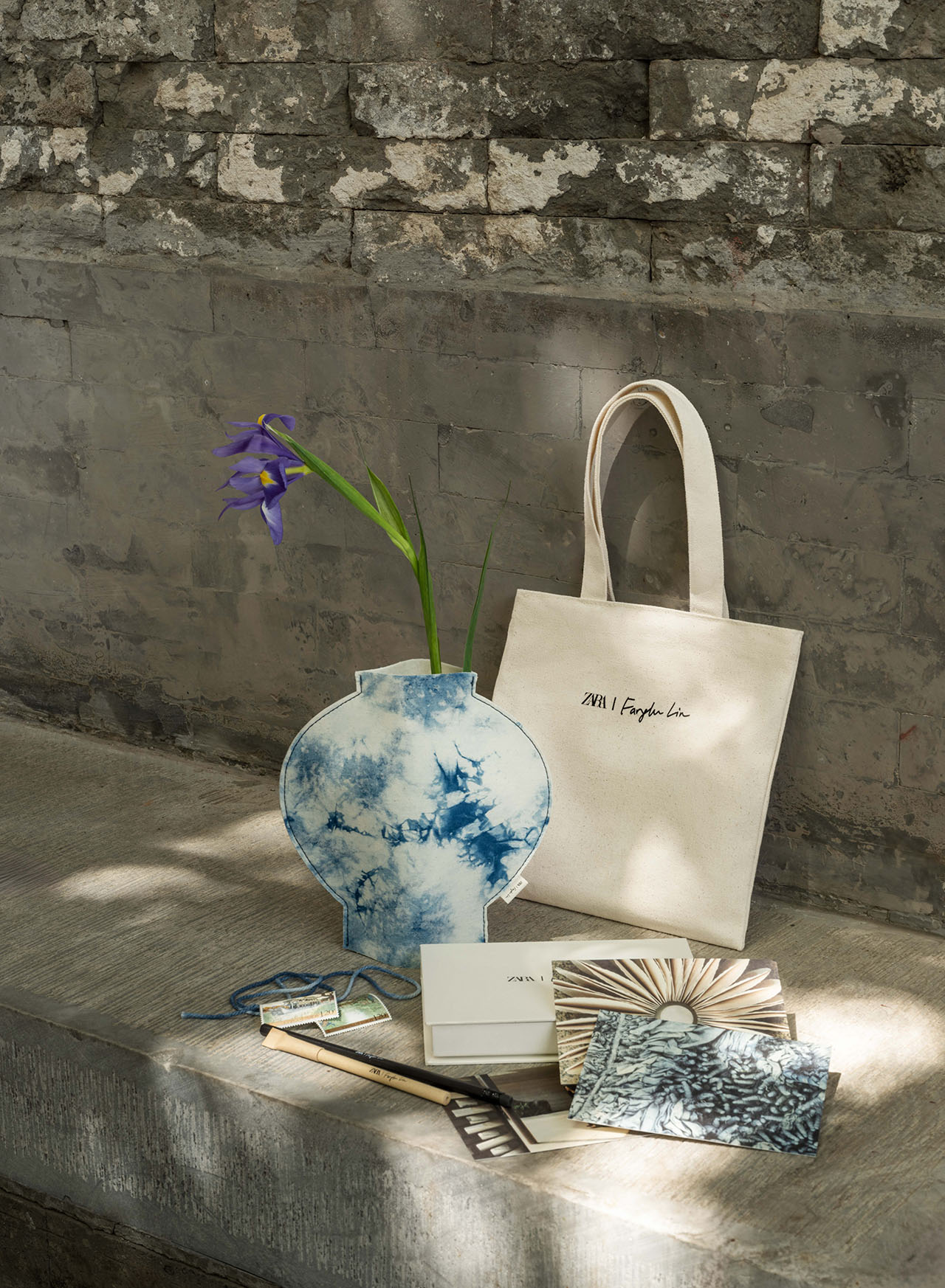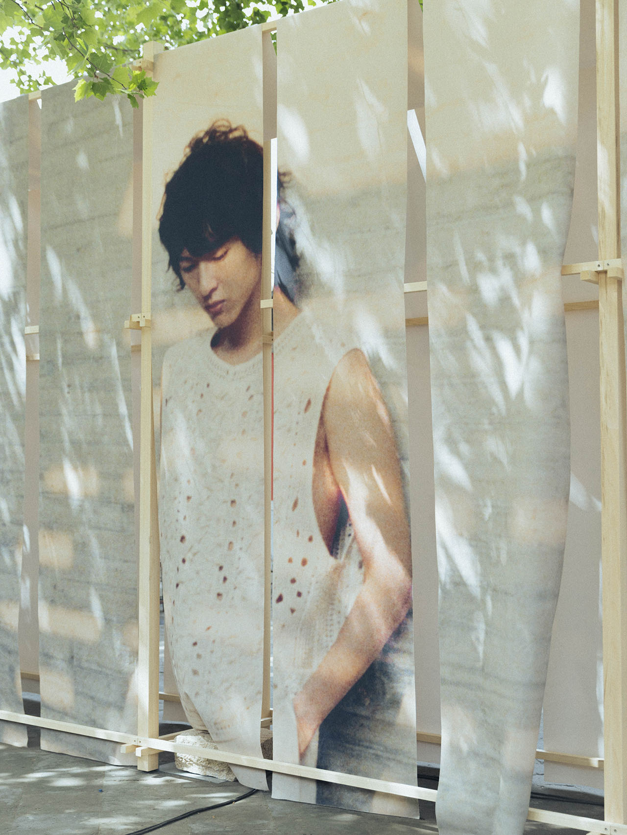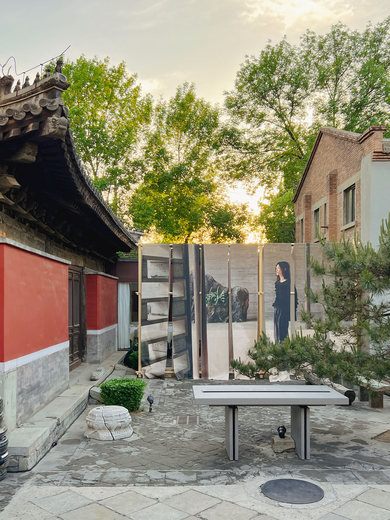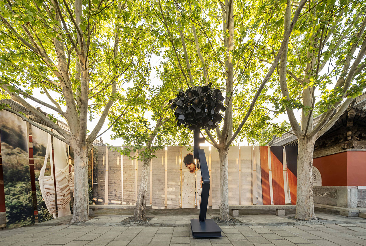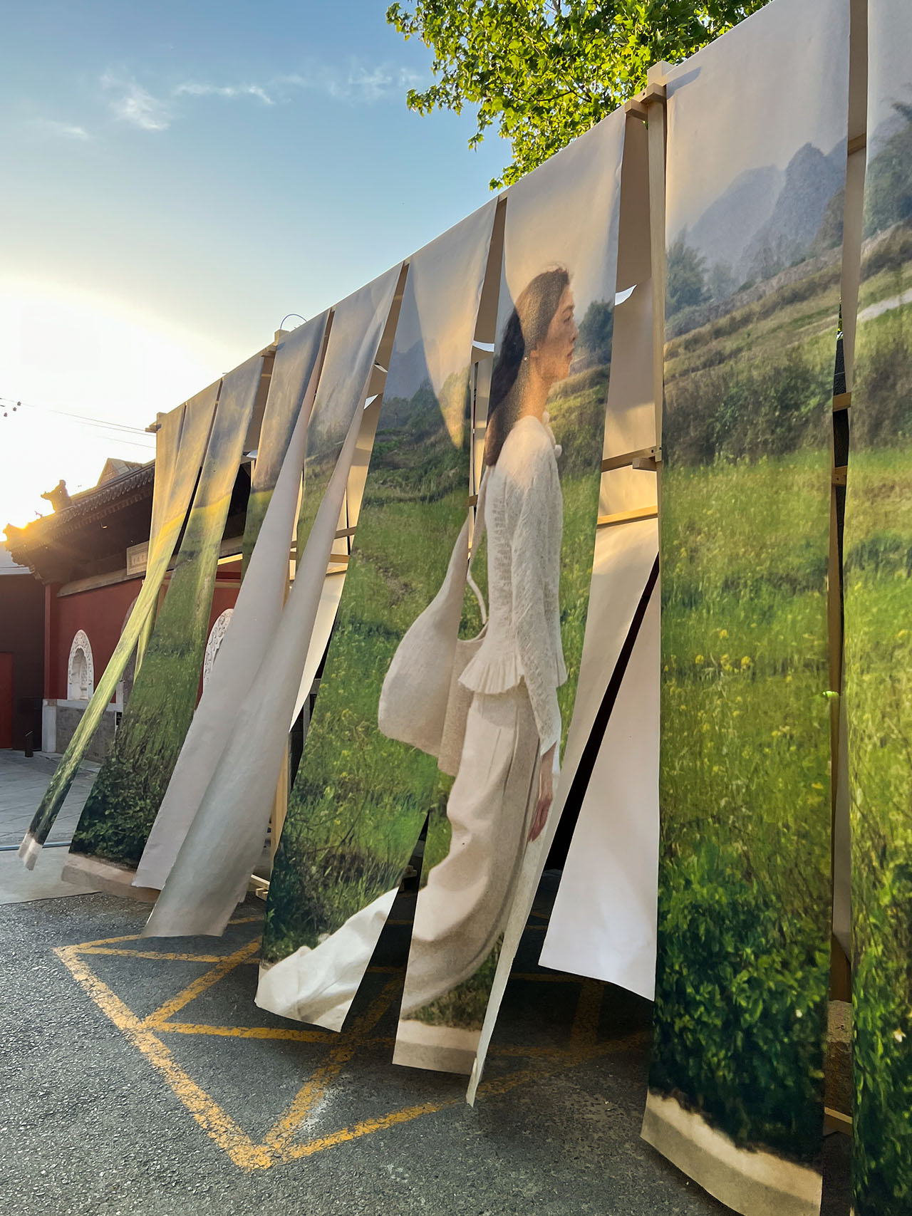 山门之外,SKYnoa 抱着对艺术、时尚和传统工艺的敬意,以悬挂晾晒的靛蓝染布为灵感,打造了一副雪松木和天然石块为骨、棉帆布和系列海报为相的时装图景,由宾客亲手揭开帘幕而进入。户外灯光装置被扎染中的褶皱状态启发,以未来视角诠释古朴精神。寺庙在当代视角下被重新构想,轻盈的手法让三处空间有机结合,营造了充满艺术氛围的零售体验。