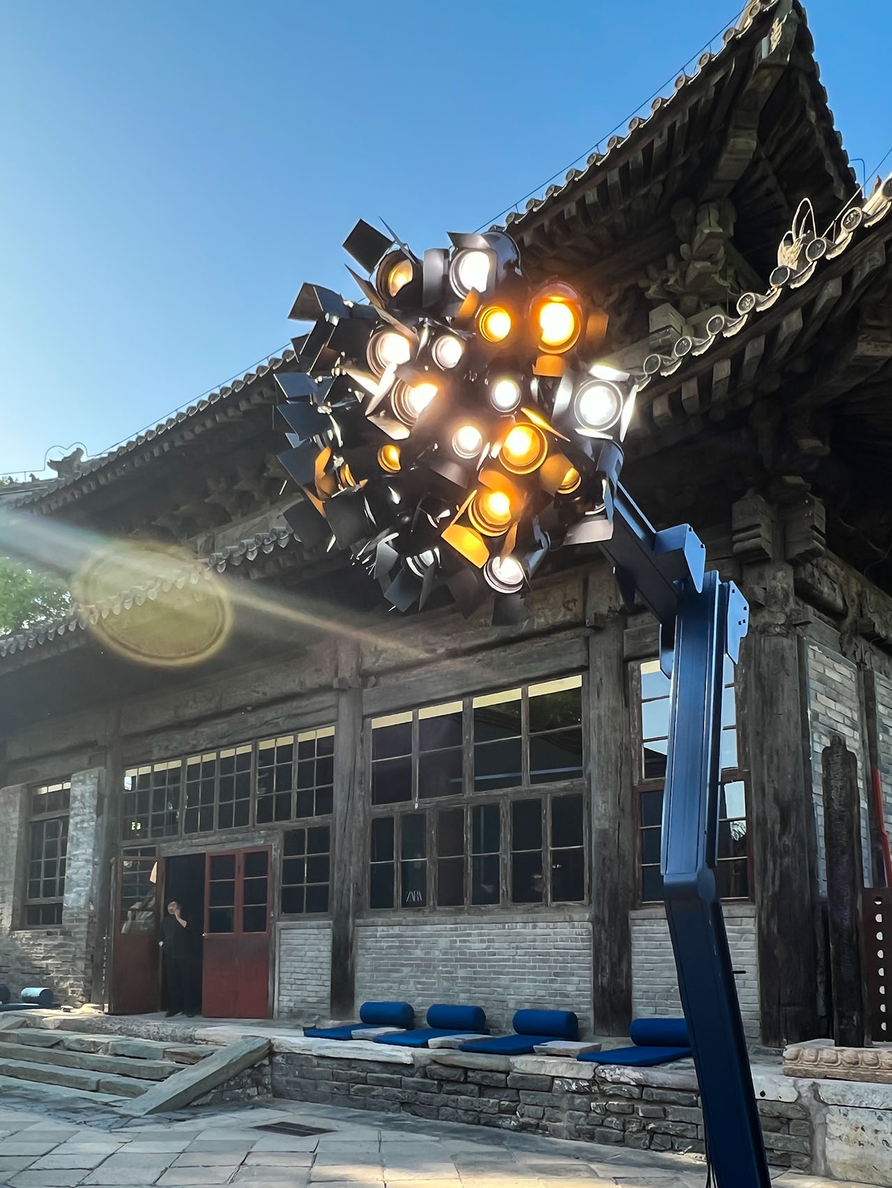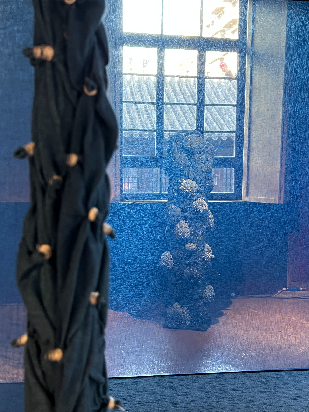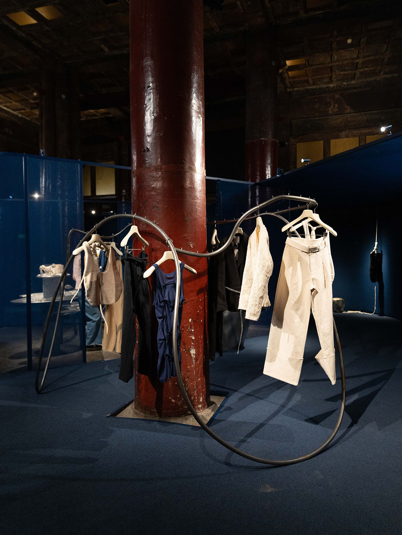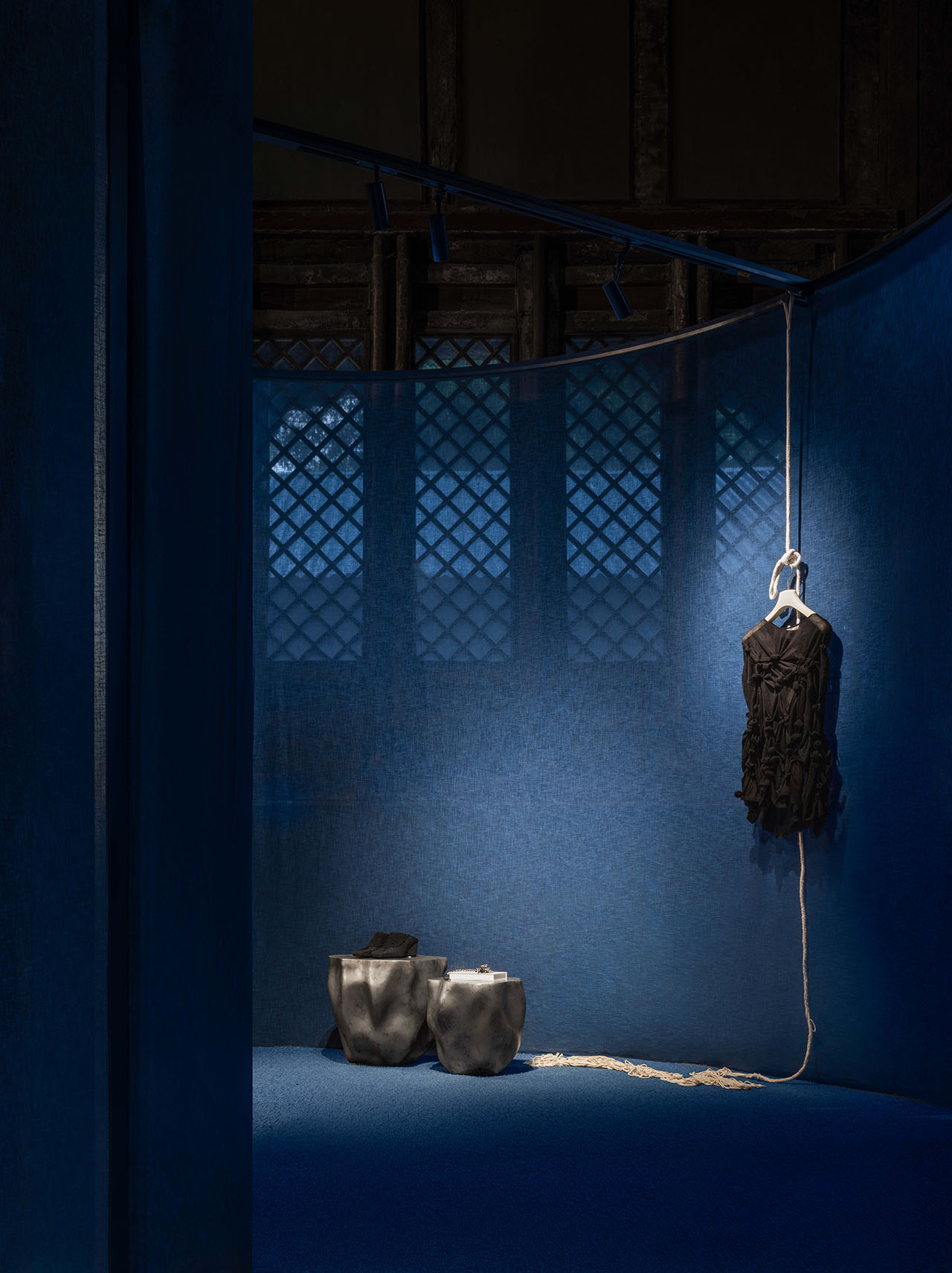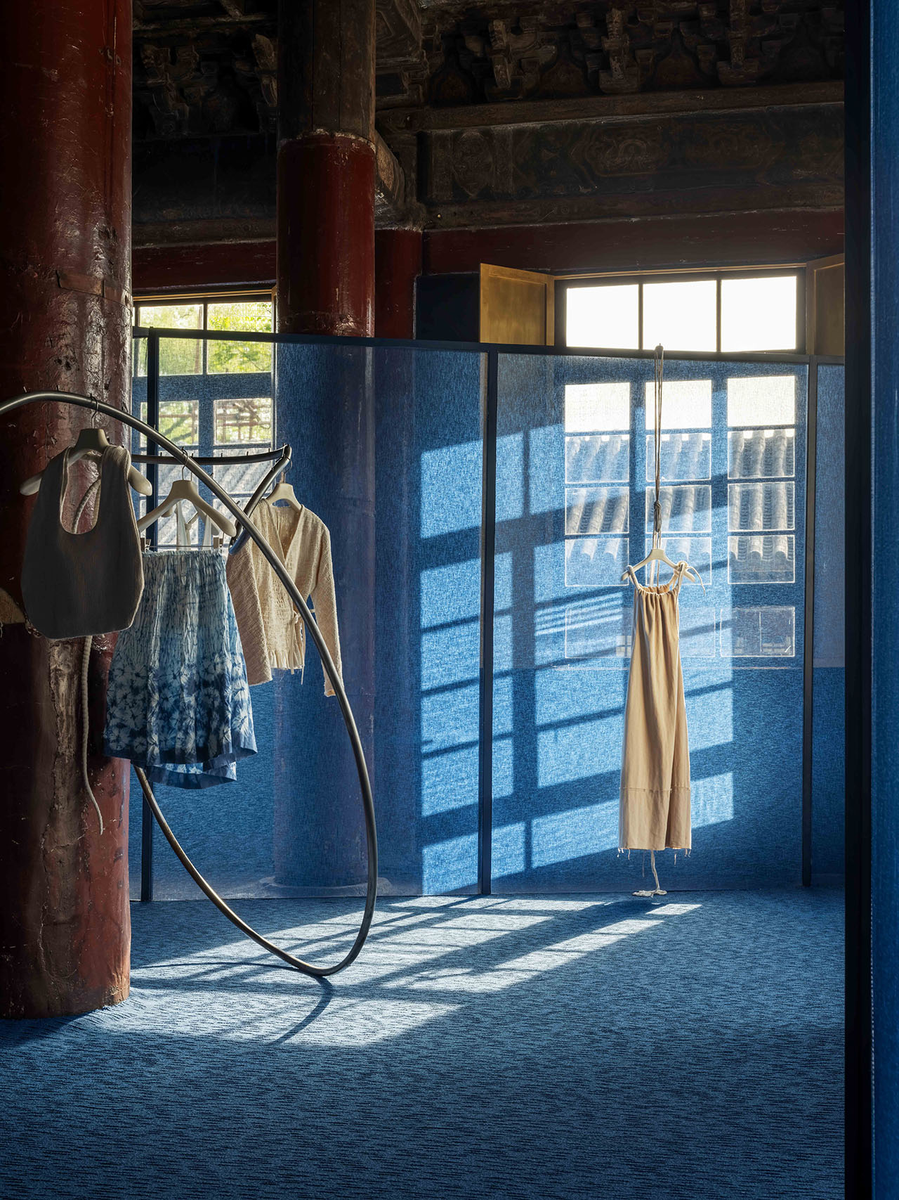 主要展陈区域位于原寺中轴主殿。织物分割之中,投射着若隐若现的东方秩序,蓝色的半透明混纺亚麻解构了传统的木构建筑语言,保持了整体设计的连贯性,它们以柔软的姿态重构空间,与定制的剑麻地毯一同建立起一种模糊边界、富有节奏的系统。大殿中央被隔开,统一的大空间此时具有了非明确指向的导向动线,成为了不完全封闭的布景,唤起漫步于美术馆的感受。行走其间,移步异景,百年古寺被分隔引导,大空间和小空间若隐若现,林芳璐的作品和联名系列融入空间各处,风景接连呈现。